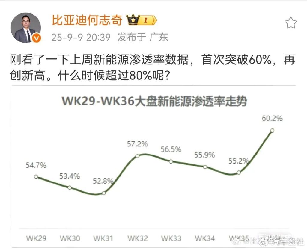 “刚看了一下上周新能源渗透率数据,首次突破60%,再创新高,什么时候超过80%呢?” 北京时间9月9日,比亚迪执行副总裁何志奇,位于个人微博写下了这样的一段话。配图,则是过去8周对应的新能源渗透率。
