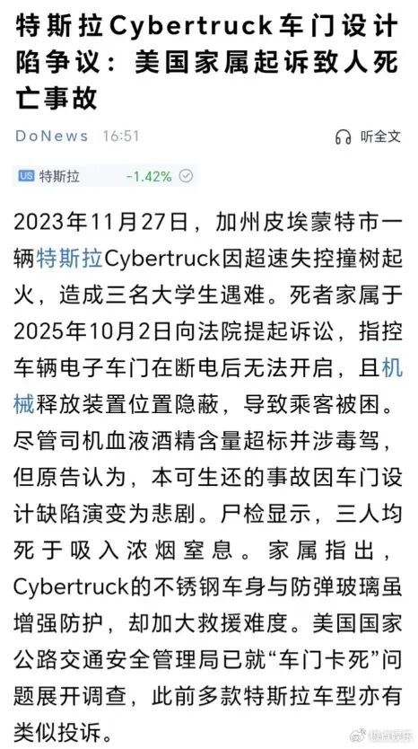 一辆车起火,五条人命困在车内活活烧死,不是因为撞得太狠,而是因为车门打不开。 更讽刺的是,这辆车来自号称“科技领先”的特斯拉,而它的逃生设计,竟藏在地毯底下,要掀开、摸索、拉拽,才能打开一扇本该“一推即开”的门。 这不是科幻电影里的故障桥段,而是2024年11月真实发生的惨剧。鲍尔夫妇和三名亲友,撞树后电池起火,电子门锁瞬间失灵,车门纹丝不动。 后排乘客在浓烟中翻找地毯下的金属拉片,而外面的人只能听见车内撕心裂肺的尖叫,最后无人生还。 这不是孤例。 早在2023年,旧金山两名大学生,就因Cybertruck门把手失灵,被困火海丧生。佛罗里达有孩子被锁在高温车内,加州8个月大婴儿差点中暑身亡……问题一再发生,特斯拉却始终把“应急开门”当作隐藏彩蛋,而非保命底线。 最荒谬的是,这种设计竟被包装成“极简美学”:没有传统门把手,全靠电子感应。可一旦12V小电瓶断电,这在碰撞、泡水、低温甚至软件故障中都极常见,整套系统就瘫痪。 而所谓的“手动备份”,要么藏得极深,要么操作复杂,普通人根本来不及反应。火灾中,每一秒都是生死线,哪有时间掀地毯找拉环? 美国监管机构,终于忍无可忍。NHTSA启动调查,覆盖17万辆车,勒令特斯拉12月前交出全部技术资料,否则罚款1.39亿美元。 而中国工信部也迅速跟进,新规明确要求:应急开门装置必须“清晰可见、无需电力、单手可操作”。这哪是技术升级?分明是用血泪换来的教训。 可悲的是,国内某些新能源车企,还在盲目效仿“无门把手”风潮。为了所谓“未来感”“一体化设计”,把机械结构砍掉,把安全冗余当成累赘。 结果呢?已有事故报告显示,国内某品牌电动车在碰撞后同样出现车门无法开启,导致伤亡加重。 消费者被炫酷屏幕、智能语音、自动泊车迷得神魂颠倒,却忘了汽车最原始的功能:保命。再先进的自动驾驶,也抵不过一扇打不开的门;再流畅的车机系统,也救不了被困火中的生命。 特斯拉的设计团队或许觉得,电子门把手是“优雅”的象征。但对遇难者家属来说,那不是优雅,是谋杀。当科技凌驾于人性之上,当设计优先于安全,再高的市值也掩盖不了道德的破产。 买车不是买手机,不能靠“系统升级”来补救致命缺陷。我们呼吁所有车企:别再把应急装置藏在地毯下、饰板后、菜单里。安全设计,必须傻瓜式、直观化、零学习成本。哪怕多花十块钱,也要让老人小孩在慌乱中能一把推开。 记住:真正的高端,不是屏幕有多大,而是灾难来临时,你还能不能活着走出来。别让“科技感”成为“死亡陷阱”的遮羞布。 |