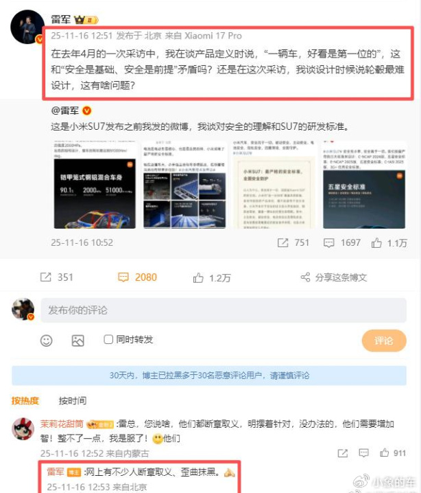 一向以温和形象示人的雷军,近日选择发文硬刚,直面外界质疑。被曲解的雷军倍感委屈,但他用实实在在的成绩,打了质疑者的脸。 舆论没赢过,但销量也没输过,用这句话来形容小米汽车,再合适不过了。 1. 雷军罕见的硬刚 一直以来,雷军给人的感觉就是温文尔雅,发文硬刚、强硬反怼、情绪化语言等这些,很难跟雷军关联在一起。 但近日雷军突然一反常态,在微博上火力全开,连发多条博文,公开回应关于小米汽车“安全和好看第一性”的质疑。 他的语气不仅罕见地带有些许情绪,而且还在评论区直言:“网上有不少人断章取义、歪曲抹黑。” 事情的起因是雷军以前接受采访说过的两句话:一辆车,好看是第一位的;车的轮毂最难设计。 相信很多人都在短视频中刷到过这两句话,它们被多次多角度剪辑,试图传递出一种小米只注重外观和颜值,而不重视安全和技术的印象。 事实上,这两句话是雷军在不同语境下的言语,并非是短视频想要引导的那样意思。 这是短视频时代信息传播的普遍现象,从完整对话中截取一两句出来,去掉前后语境,在算法的推波助澜下吸人眼球,迅速向负面发酵。 雷军和小米因此被疯狂攻击,确实是很荒谬的。 2. 打了所有人的脸 雷军和小米深陷舆论风暴的另一面,是小米车主们用真金白银,将小米汽车的销量推向前所未有的高度。 小米SU7和YU7两款车发布之后,其订单的火爆程度震惊汽车圈,刷新了新能源车的纪录。 今年前9个月,小米累计交付超30万台,将于本周提前完成全年35万辆的交付目标。 其中小米SU7早就超越特斯拉Model 3,10月份YU7的销量也反超了Model Y。打败特斯拉两大标杆产品,小米汽车做到了其他自主品牌做不到的事。 持续暴涨的销量,给了小米汽车盈利的坚实基础。 今年第三季度,小米汽车业务达290.1亿元,超过市场预估的280.2亿元,而且实现了7亿元经营收益。 实现单季度盈利,小米汽车只用了短短四年半时间,刷新了造车新势力单季盈利用时最短的纪录。 新势力头部车企小鹏和蔚来,它们均成立于2014年。至今已经11年了,都还未能实现单季盈利。即便今年第四季度盈利,所用时间也是小米汽车的好几倍。 3. 倍感委屈的雷军 小米造车之初,雷军的形象整体上是非常正面的。 舆论中,雷军的爽文人生也流传开,被网友追捧到很高的位置。甚至有人喊出“雷神”,导致雷军有点被神话。但雷军本质上是一个创业者,是一个商人。 当小米汽车进入交付阶段,自然会出现很多商品都不免出现的问题。但公众无法接受,一个自己心里的理想主义的工匠,变成务实或者精明的商人。 其实,这不过就是雷军个人形象从“从天上回到人间”而已,并非雷军的错。 再者,经历过刷新纪录订单的梦幻开局之后,随着小米汽车交付量和用户增长,产品的一些问题自然会开始暴露,大到交通事故,小到用户体验,每个负面案例都被公众置于放大镜下审视。 这是汽车或者所有商品的必经之路,小米自然也无法避免。 而且,随着小米汽车规模的扩大,公众也会拉高对它的期待,不仅仅满足“高性价比”,也期望“高科技”。 小米汽车目前的“高科技含量”无法满足公众期待,但技术创新是需要时间和积累的。 小米汽车目前遭遇的舆论困境,与当年的特斯拉很像。 前几年,特斯拉也深陷“刹车失灵”的质疑之中,还有被一些网友声讨“割韭菜”。当时的特斯拉,承受着巨大舆论压力。不过特斯拉没有妥协,终于熬过了舆论艰难时刻。 如今的小米汽车似乎拿到了一样的剧本,也许枪打出头鸟,先行者都逃不过“舆论没赢过,销量没输过”的宿命。 好在市场从来不看口水仗,那些拿出真金白银下单的消费者,给了雷军和小米最硬的底气。 |