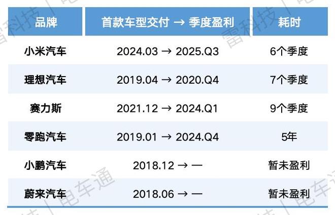 (来源:雷科技) 小米创下新势力车企最快盈利纪录! 11 月 18 日,小米集团正式发布 2025 年第三季度财报,小米汽车业务表现炸裂:单季营收 290 亿元,同比暴涨 199.2%,首次实现 7 亿元盈利,毛利率也拉升至 25.5%。 更关键的是,小米从首车交付到单季盈利,只用了 6 个季度,比理想、蔚来、零跑等对手都要快,成为新势力中“最快赚钱的车企”。 制表:电车通 不过,比起“赚钱快”,更让人吃惊的是“交车快”。 在财报电话会上,小米总裁卢伟冰透露:本周之内,小米汽车将完成全年 35 万辆的交付目标。 从去年 13.6 万辆,到今年不到 11 个月就实现接近三倍的增长,同比增幅超过 150%。而这背后,绝不仅仅是“双车战略”四个字能概括的。 销量要起飞,产能先开路。 和传统车企“稳步扩产”和部分新势力“产能卡脖子”的窘境不同,小米汽车走通了第三条路——以多工厂并行+供应链协同的组合拳,硬是在产能爬坡的陡坡上,跑出了“小米速度”。 具体来看: 一期工厂的设计年产能 15 万辆,在双班生产全力运转下,月产能已拉满至 2.4 万辆,相当于年化约 28 万辆,设备利用率接近极限,几乎“压榨”出每一寸产能空间。 二期工厂同样规划 15 万辆年产能,自 8 月启动量产后稳步爬坡,月产已从初期的 8000 辆提升至 2 万辆,四季度持续放量。 至此,小米汽车已经形成“一期满产、二期快跑”的双线作战格局,为后续交付上量打下坚实基础。 这套产能组合拳的效果,在交付数据上得到了最直观的反映。 数据显示,小米汽车在三季度共交付 108796 辆,其中 7、8 月连续突破 3 万辆。更值得一提的是,8 月最后一周,小米以 1.12 万辆的周交付量,强势冲上新势力销量榜第二,仅次于零跑汽车。 比销量更“吓人”的,是它的赚钱能力。 图源:小米汽车官方小米汽车的毛利率已从去年同期的17.1%一路拉升至25.5%,大增8.4个百分点。这一数据不仅超越特斯拉(18%)、理想(20.9%)等头部品牌,仅次于赛力斯(28.93%)。 高毛利的背后,离不开精准的产品矩阵。和赛力斯一样,小米通过双车战略成功卡位中高端市场,目前形成了覆盖 25-60 万元区间的双车矩阵,6 月份上市的中大型 SUV YU7 成为销量黑马,9 月销量已经达到 22369 辆,10 月份更是登顶国内 SUV 市场销量榜。 小米 SU7 Ultra 同样不能忽视,以 52.99 万起售价攻入高端市场,上市 2 小时大定破万,成为品牌溢价的关键支点。产品结构的优化,直接带动单车均价(ASP)从 2024 年的 23.86 万元升至 26.01 万元。 图源:小米汽车官方小米管理层披露,除了 ASP 上涨和产能释放带来的规模效应之外,核心零部件成本下降也是毛利率大幅度上涨的原因之一。 另外,电车通还注意到小米汽车强调的“人车家全生态”,成为隐藏利润引擎。 截至 2025 年 9 月 30 日,小米 AIoT 平台已连接 IoT 设备数突破 10 亿台;拥有五件及以上连接至 AIoT 平台的设备用户数达到 2160 万,同比增长 26.1%。尽管汽车直接拉动的设备销售尚未完全披露,但根据小米汽车 APP 的销量数据,“人车家”闭环所释放的用户终身价值,已为小米汽车打开更大的想象空间。 尽管当前业绩亮眼,第四季度有望基本保持稳定状态,但卢伟冰在财报电话会议上明确警示:“明年将非常具有挑战,毛利率可能出现下滑。” 这番表态并非刻意低调,而是基于两大现实压力的清醒判断:一是新能源汽车购置税补贴政策减半,将直接冲击价格竞争力;二是行业洗牌进入深水区,竞争进一步白热化。 购置税减半政策会在明年正式实施,这已是悬在所有车企头上的“达摩克利斯之剑”。补贴退坡意味着消费者到手价上涨,将直接考验小米用户的价格敏感度。 需要指出的是,小米当前 25.5% 的毛利率,很大程度上依赖于规模效应、零部件降本与 ASP 上涨这三项支撑。小米汽车的定价确实不低,但雷军也多次强调“贵有贵的道理”,也就是说品牌在定价灵活性与促销空间上本就不算宽裕。 本质上,小米汽车仍是靠“高性价比”逻辑在中高端市场争夺用户。 图源:电车通摄制随着补贴退坡,成本压力将进一步凸显——售后服务网络扩张需要持续投入,供应链能否继续压降成本也面临瓶颈。一旦价格策略受限、成本又难以继续优化,毛利率的回落几乎难以避免。 更严峻的是,战场环境正在急剧变化。从今年开始,比亚迪、吉利等传统品牌加速往新能源转型,推出越来越多具有价格杀伤力的产品,蔚来、小鹏、理想等新势力也在不断完善产品矩阵。小米面临的已不再是新势力内部的“分组赛”,而是全行业、无差别的“淘汰赛”。 汽车消费的决策周期更长,用户对电池安全、售后服务、软件迭代速度的要求远高于手机,小米在售后网点数量、充电网络等方面仍有短板,如何在这样的环境中守住增长势头,将是小米汽车明年真正的“大考”。 媒体《汽车电器杂志社》给出了颇为激进的产能预测,“若产能爬坡顺利,加之可能的并购计划,小米汽车的全年产能或冲击 117 万至 120 万辆。” 这一预测并非空穴来风:小米汽车工厂产能利用率已接近 200%,若两座工厂均以 200% 的产能利用率运行,年产量可达 60 万辆,再加上三期工厂总装车间预计在明年春节前后投产,而武汉一期工厂计划于明年 5 月完工,并于 10 月达到 3.5 万辆的月产能。再叠加潜在并购带来的产能补充,117~120 万辆的目标看似具备理论支撑。 然而,理想很丰满,现实很骨感。 从行业实际落地规律来看,百万级产能的达