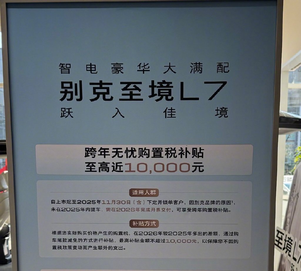不少4S店摆上新能源汽车购置税调整倒计时海报/记者拍摄 从明年1月1日起,新能源汽车购置税开始减半征收。按照新版计税规则,车辆购置税按购车价(不含增值税)的10%计算,减半后实际税率为5%。每辆新能源乘用车减税额不超过1.5万元,以30万元车型为分界点。购买30万元及以下车型,直接按5%税率计算,如一辆20万元的新能源车需缴纳购置税8849元;30万元以上车型按10%税率计算后,再扣除1.5万元限额,如一辆50万元的新能源车需缴纳购置税 3.5万元。 面对即将调整的购置税政策,不少车企推出了购置税“兜底”补贴方案。目前大部分车企的“兜底”补贴方案截止到本月30号,普遍约定消费者在11月底前完成锁单,若因车企生产、运输等非用户原因导致车辆延迟到2026年交付开票,车企将以尾款减免或现金补贴的形式,全额承担购置税差额,单辆车最高补贴金额可达1.5万元。各家车企的“兜底”政策范围不尽相同,有的是围绕个别车型,也有的是覆盖全系车型。