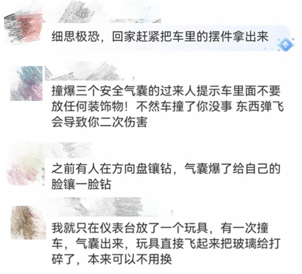 近日 #不要在车里放小玩偶了# 话题登上热搜榜 引发网友热议 有些车主会根据自己的喜好 在车内悬挂或摆放 小玩偶、毛绒玩具等装饰品 却不知这些可爱装饰的背后 藏着许多安全隐患 01 车内装饰的“美丽陷阱” 有哪些你不知道的安全隐患 制造视线盲区 堪称“移动路障” 水晶挂饰、风铃等饰品 在行驶时会左右晃动 分散驾驶人的注意力 遮挡驾驶视野 对行车安全造成影响 后挡风玻璃处堆放的 毛绒玩具、车窗装饰条等 会缩小驾驶员对后方车辆、行人的 有效观察范围 尤其影响夜间行车安全 二次伤害 别让“小物件”酿大祸 中控台摆放的摆件 杂乱缠绕的充电线等物品 在车辆紧急制动或发生碰撞时会瞬间滑落 不仅可能遮挡仪表盘警示灯 让驾驶员错失避险时机 还会从中控台“飞出” 砸向车内人员,造成二次伤害 02 车内装饰这样放 安全美观两不误 除了各类饰品 车内难免要放置一些必需品 怎样做才能把风险拒之门外 前视镜区域 极简即安全 - 仅保留必要证件,避免悬挂任何饰品。