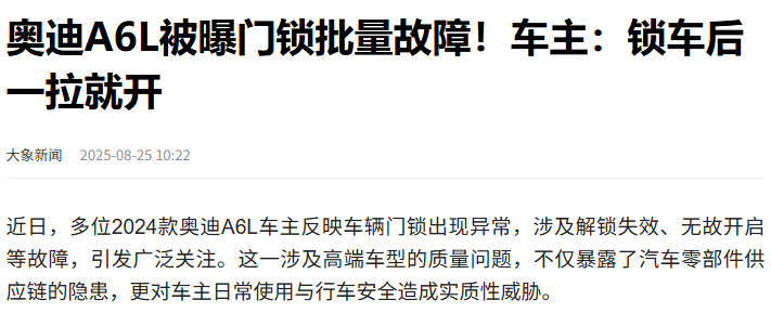 (来源:电动知家) 电动知家消息,8月26日,据多家媒体报道,奥迪A6L被曝门锁批量故障!多位2024款奥迪A6L车主反映车辆门锁出现异常,涉及解锁失效、无故开启等故障。 2025年8月以来,全国多地奥迪A6L车主集体曝光车辆门锁存在严重故障:锁车后车门仍可随意拉开,甚至出现高速行驶中车门异常解锁的致命风险。山东车主刘先生描述,他在高速上曾突然听到门锁跳开声,“若车门完全打开,后果不堪设想”。短视频平台上,广东车主实测视频显示:锁车后主驾、副驾及左后门正常锁止,唯独右后门一拉即开,防盗警报虽响却于事无补。 值得注意的是,故障涉及2020至2025年多款A6L,部分A4L车主也反映同类问题,疑似奥迪某代门锁系统的共性设计缺陷。有博主透露,厂家技术人员私下承认“特定批次门锁控制模块存在质量问题”。从事汽车维修12年的资深技师张师傅揭露故障核心:“门锁执行器的电机驱动芯片信号识别紊乱,或锁块微型电机磁性失效,导致指令误判”。他进一步解释,芯片故障会使门锁“假锁死”(实则未锁闭),微型电机失效则直接导致开合功能瘫痪。此类硬件缺陷无法通过软件升级修复,必须更换部件。 根据《缺陷汽车产品召回管理条例》,若同一车型普遍存在危及人身安全的缺陷,生产者必须召回。目前奥迪官方仍保持沉默,而车主已组织集体维权,拟向市场监管部门提交缺陷产品报告。 2024款奥迪A6L是一款定位于中大型豪华轿车的车型,于2023年10月17日正式上市的。这款车属于年度小改款车型,主要是对配置进行了调整,动力系统基本保持不变。2024款奥迪A6L的厂商指导价区间是42.79万元至65.68万元。 |