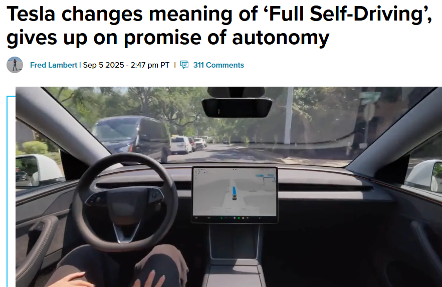(来源:电动知家) 电动知家消息,9月6日,据多家媒体报道,特斯拉近期做出重大调整,已经更改了其“全自动驾驶”(FSD)的定义,并放弃了多年来反复强调的 “无需驾驶员监督” 承诺,为近十年来的技术豪赌画上了一个句号。自2016年以来,特斯拉一直宣称其生产的所有车辆都将具备无人监管自动驾驶能力。首席执行官埃隆·马斯克更是从2018年开始,每年都承诺“明年”就能实现这一目标。 特斯拉曾经向客户销售FSD软件套件,售价高达1.5万美元,承诺通过远程软件更新将其高级辅助驾驶系统升级为完全自动驾驶。近十年时间过去了,这一承诺仍未兑现。特斯拉现已确认,2016年至2023年间生产的所有车辆都没有配备实现承诺的无人监督自动驾驶所需的硬件。尽管马斯克曾讨论过为这些车辆升级计算机以安抚车主,但至今未有具体实施计划。早期花费巨额资金购买FSD功能的用户,等来的不是完全自动驾驶能力,而是一纸变更的条款。 特斯拉现已调整官方表述,目前仅向客户提供“全自动驾驶(需人类监督)”版本。公司在细则条款中明确指出,该功能并不会使车辆成为“自动驾驶车辆”,也并未承诺将其作为车辆特性提供。换言之,现在购买FSD功能的消费者,实际购买的已非早期用户所期待的那种无需人类监督的自动驾驶能力。特斯拉现在仅将FSD视为一种“先进驾驶系统”。当前版本的FSD仍需驾驶员持续监督,完全符合这一定义。FSD不再包含最初承诺的“车主可以在车内安心入睡,醒来即达目的地”的功能——而这正是马斯克多年来推销特斯拉车辆时使用的核心话术。 |