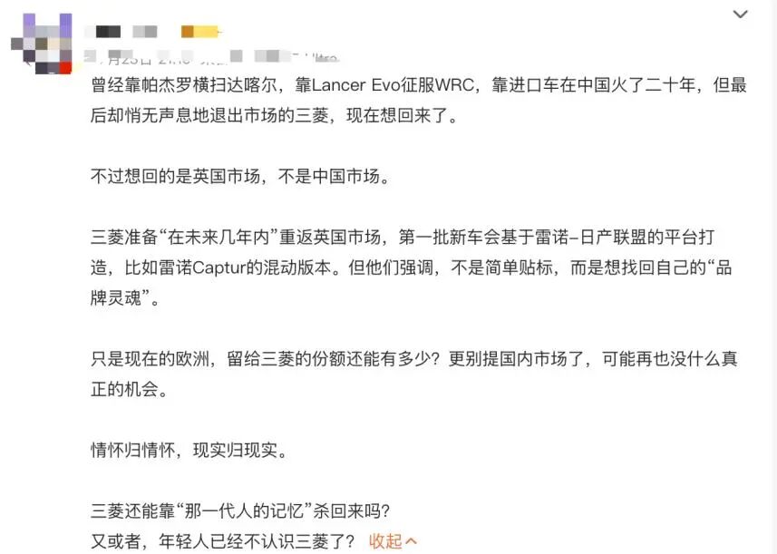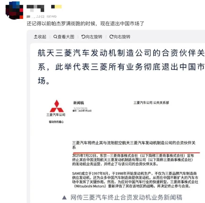 来源:功夫财经 作者:DW 三菱汽车,这个曾以帕杰罗定义硬派越野的“国产车教父”,2025年正式挥别中国市场。它的退出既因广汽三菱的持续亏损,也源于对电动化转型的迟缓应对。 当电动车席卷全球,这位燃油时代的王者,最终被自己筑起的技术高墙困住。从刑侦剧警车标配、达喀尔拉力赛传奇,到维修厂里的情怀标本,四十年辉煌在“徒弟们”的强势围剿中黯然落幕。 一石激起千层浪。“帕杰罗满街跑的日子真成回忆了!”无数中年男人在朋友圈慨叹。有人一句“连发动机都退了”,道尽传统巨头在电动车战场上的溃败。 (图源:新浪微博)2025年7月,三菱终止与沈阳航天三菱的发动机合资业务,彻底退出中国生产。当年凭技术横扫市场的霸主,如今竟不敌新势力车型在年轻消费者心中的吸引力。 帕杰罗退场,不仅是一款车的消失,更是一个时代的终结。当硬派越野从“实用利器”变成“情怀玩具”,中年男人所怀念的,又何止是一台车? 中国汽车“发动机教父” 三菱汽车的中国故事,始于上世纪80年代那台叩开市场大门的发动机。 1997年,沈阳航天三菱的成立成为关键转折点。其4G6系列发动机如同“武林秘籍”,被长城、比亚迪、奇瑞等众多初代自主品牌奉为“救命稻草”。 据多家媒体报道,巅峰时期,国产车30%的“心脏”都跳动着三菱的基因,业界尊其为“国产教父”。沈阳航天三菱的装配车间里,总能看到各大车企派来的“取经团”。 在整车领域,帕杰罗书写了硬核传奇。这款脱胎于三菱重工军工技术的“山猫”,曾是达喀尔拉力赛的多次冠军,创下在可可西里无人区单车穿越、川藏线“零故障”进藏的神话,至今仍是越野圈的图腾。 (图源:有驾网)越野老炮们口耳相传:“海拔5000米垭口,只有帕杰罗,没有‘高原反应’。”上世纪90年代,其市占率曾一度碾压丰田普拉多,成为中年男人对抗焦虑的“梦中情车”。“开帕杰罗比开普拉多更有底气,它像头老狼,越老越凶。”有网友如此描述。 1995年成龙的《霹雳火》让三菱汽车名声大噪,限量版Lancer Evolution VIII几乎与电影绑定。2003年,三菱汽车以15万辆销量登顶日系品牌榜首,帕杰罗与欧蓝德双星闪耀,前者是公务车标配,后者以精湛工艺收割中高端市场。 后来在很长一段时间,三菱汽车都秉持“只卖技术不参与经营”的合作理念,直到2012年,广汽集团、三菱汽车和三菱商事合资成立广汽三菱,三菱汽车在中国市场的整车国产化进程明显提速,陆续推出了欧蓝德、奕歌、劲炫等多款车型。 2017至2019年,广汽三菱年销量连续三年超11万辆,2018年巅峰达14.4万辆,月均破万的欧蓝德稳坐紧凑型SUV头把交椅。 时代抛弃你,连招呼都不会打 然而,辉煌背后暗藏危机。 三菱在华口碑的败退,始于2000年刹车油管事件撕开的第一道信誉裂缝,二十多年后终成深渊。 2016年,成为三菱汽车命运转折点。当吉利释放沃尔沃技术红利、长城自研2.0T发动机时,三菱汽车却陷入了产品更新迭代的停滞:2018款欧蓝德中控屏分辨率竟不如国产千元机,2020款奕歌的智能驾驶落后竞品整整一代。 产品规划会上的一幕颇具象征意义:当中方团队提出开发加长轴距车型时,日方高管的回应是“三菱不需要为中国市场改变”。市场的连锁反应随之而来。三菱全系车型在华销量跌出前二十,经销商退网潮席卷全国。 更致命的是,2018至2025年上半年中国新能源渗透率从5%飙升至50.2%的黄金期,三菱汽车竟因总部决策僵化等原因,在长达数年的时间里未推出全新车型。 2019年,雷诺-日产-三菱联盟内耗让广汽三菱的发展戛然而止。 当比亚迪DM-i混动横扫市场,三菱电动化却几乎隐形。昔日爆款帕杰罗核心部件十年未更新,发动机技术停留在上世纪90年代。三菱汽车从“日系三杰”沦为“二线品牌”,车主陷入“修车难”困境。 “不是不想换,是换了找不到当年的感觉”——一位车主的留言,道出了无数人的心声。 (图源:有驾网)那些曾依赖三菱汽车发动机的“徒弟们”(自主品牌)已成长为最强的对手:长安蓝鲸、奇瑞鲲鹏等自主技术全面崛起,而三菱汽车的燃油发动机业务沦为“昨日黄花”。尽管尝试转型,但日本总部审批僵化导致电动平台未适配中国需求。 2022年长沙工厂产能利用率跌至16%,沈阳航天三菱发动机销量从80万台断崖式跌至20万台,客户仅剩众泰等边缘车企。 在电动化赛道上,三菱汽车整整慢了半拍。当中国车企在电动牌桌“推倒胡牌”,它还在犹豫下注。 直到2022年,三菱汽车才推出首款纯电车型阿图柯,续航520公里,定价却高达20万元区间,月销量徘徊在两位数。 由于销量持续低迷、经营状况日益堪忧,三菱汽车频陷“退市”传闻。2023年5月,三菱汽车社长澄清不会退出中国市场,此前三菱汽车已经遭到广汽财报“除名”。 起初,广汽集团也并非坐视不理。广汽集团等多方股东数次注资数十亿元仍未能扭转亏损局面。 2023年10月,三菱汽车宣布退出中国的整车生产。截至2023年上半年,广汽三菱净资产已跌至负14.15亿元,陷入严重资不抵债、入不敷出的泥潭,最终以长沙工厂1元被广汽埃安接盘黯然离场。 (图源:官网)2025年7月,三菱汽车宣布终止与沈阳航天三菱的发动机合资业务。至此,其在华生产版图彻底清零。 这场败退本质是全球汽车产业的“中国考场”压力测试。从2015年新能源占比1%到2025年上半年超50%,中国用五年将电池成本压缩80%,智能驾驶从高端配置