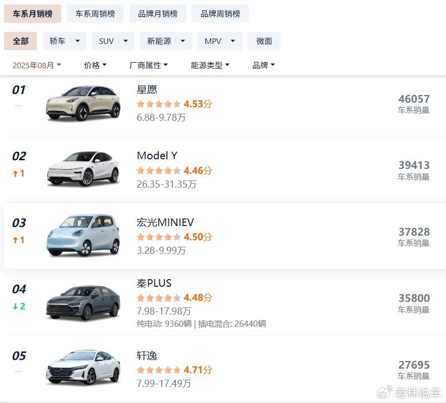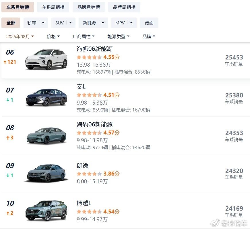 8月份的汽车销量排行榜已经公布了,果不其然,前两名依然是吉利星愿和特斯拉Model Y,反正每次公布榜单的时候,这两款车要么前者是第一名,要么后者是第一名,很少出现意外。这就说明它们都有很广阔的受众群体,只不过一个稍微高端一些,一个稍微低端一些。还有一个共同点,现在的新能源汽车要么是插混,要么是增程,要么是纯电,而吉利星愿和特斯拉Model Y都是纯电,还有第三名五菱宏光MINIEV也是纯电,这就很值得深思了。 第四名是比亚迪秦PLUS,比亚迪的表现有目共睹,在榜单前10名中,往往能够“屠榜”,比如第六名海狮06,第七名秦L,第八名海豹06都是比亚迪旗下的车型,也就是说,榜单前10名中比亚迪能够占据4个名额,而且月销量都在2万台以上,由此可以看出比亚迪在新能源汽车领域的统治力。 前三名加上比亚迪已经占据了7个名额,剩下的那三个名额分别是日产轩逸、大众朗逸和吉利博越L,它们也有一个共同点:都是燃油汽车。 太惨了!油车真的卖不动了!8月销量前10名竟然只有3款油车! 看到这里,让人不禁产生了一种“油车大势已去”的感觉,毕竟前10名中只有三款油车,就连三分之一都占不到,而且排名还不是很靠前。 只能说这是汽车工业发展到现在的必然结果,对于消费者来说,不喜欢油车的可以买电车,不喜欢电车的也可以买电车,比如插混汽车和增程汽车虽然属于新能源汽车,但是它们都可以加油和充电,而且油耗要比同级别的油车更低一些,可以降低车主的用车成本。 油车的整体表现差强人意也在情理之中。值得一提的是,轩逸虽然属于油车,但它却提供汽油电驱车型,你可以这么理解,汽油电驱就是无需充电的“增程汽车”,发动机的作用就是发电,产生的电量供电动机使用,从而驱动车辆行驶。只不过汽油电驱不符合新能源汽车的准入门槛,就像油电混合车型一样,只能上蓝牌。 大众朗逸之所以能够上榜,除了大众汽车的品牌号召力外,和朗逸的大幅优惠也息息相关,这款车的标配车型优惠完之后才6万多,主打一个性价比。说到底,很多消费者选择这款车只不过是“图便宜”。不过从产品力方面来看,朗逸还是很不错的,该车基于MQB平台打造,提供1.5L+6AT和1.5T+7DSG的动力总成,WLTC综合油耗为5.98L/100km和5.4L/100km,动力输出能够接受,油耗表现也不错,家用还是没有问题的。 第十名是吉利博越L,该车售价9.99-14.97万元,2025款车型的优惠力度并不大,大约7000元左右,但这并不妨碍这款车的热销,能卖出24196台也是实力所归,本身这款车的售价就比较合理,再加上提供1.5T/2.0T+7DCT的动力总成,还是很有竞争力的。 写在最后: 根据乘联会提供的数据来看,2025年8月新能源汽车渗透率为55.3%,这是啥意思?很简单,每卖出100辆新车,有55.3台是新能源汽车,只有44.7台是燃油汽车,这么来看的话,还是新能源汽车更受欢迎,燃油汽车似乎真的大势已去了。 |
