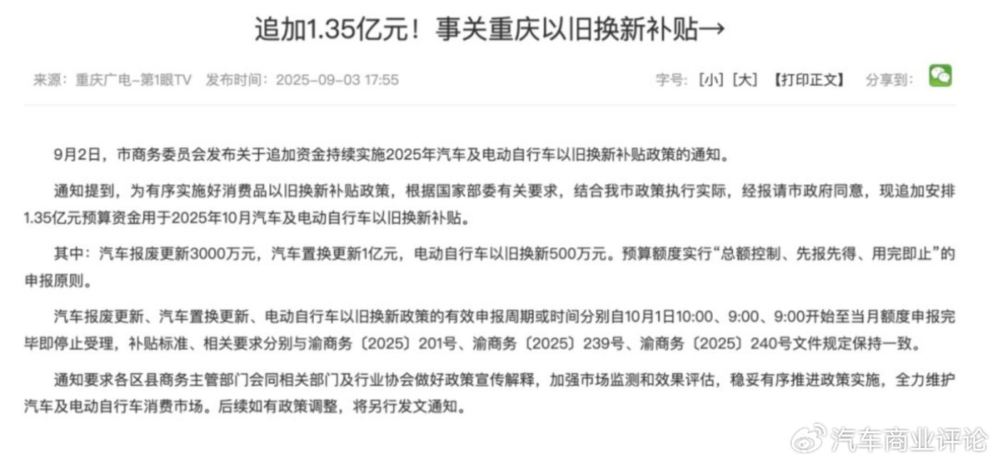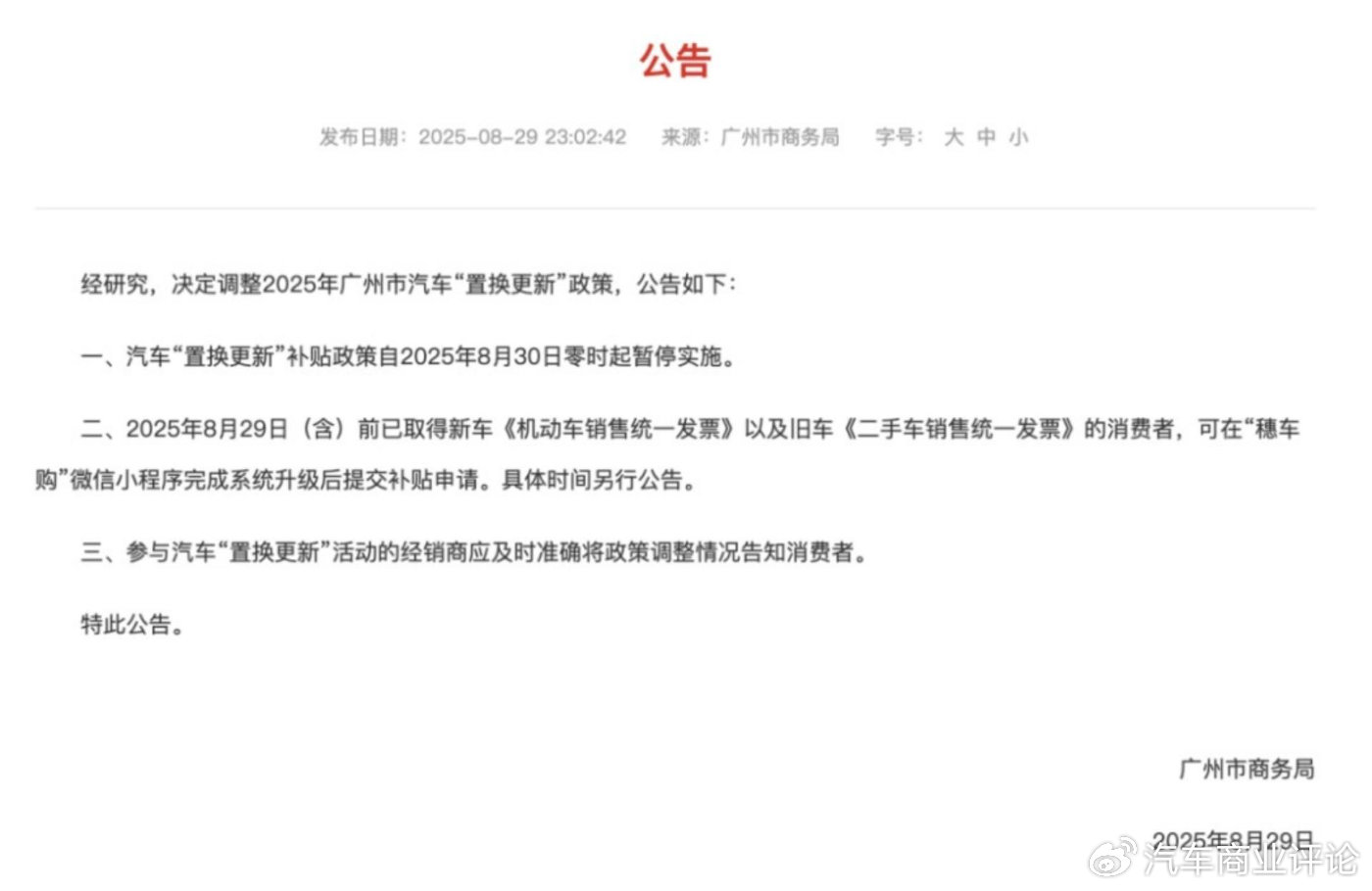 | 作者 / 魏    微 编辑 / 黄大路 设计 / 张    萌 “新车已经交钱了,老车还没卖,现在咋办?”有广州车主欲哭无泪。 2025年8月29日23时02分,广州市商务局官网悄然发布一则简短通知,宣布广州市汽车“置换更新”政策于8月30日零时起暂停实施。 这份几乎没有留下缓冲期的公告,让当地车市炸开了锅。 公告表示,8月29日(含)前已取得新车《机动车销售统一发票》以及旧车《二手车销售统一发票》的消费者,仍有资格在系统升级后提交补贴申请,但具体时间待定。 简单来说,只有在8月29日前买了新车并且已将老车卖掉,且都拿到发票的前提下,才能有资格赶上广州汽车以旧换新补贴发放的末班车。 与部分地区明确提及 “系统升级”“资金耗尽” 不同,广州未披露补贴暂停发放的具体原因,但结合行业普遍情况与政策背景,其核心原因或仍旧指向补贴资金池“见底”。 汽车置换补贴的资金主要来自财政资金,中央和地方都有“出资”。具体来看,家电以旧换新、汽车报废更新等领域补贴资金按照总体9:1的原则实行央地共担,东部、中部、西部地区中央承担比例分别为85%、90%、95%。 2025年全年,中央安排超长期特别国债3000亿元支持消费品以旧换新(比上年增加1500亿元),前两批资金均为810亿元,已分别于1月和4月下达。第三批690亿元资金在7月下旬已下达,第四批690亿元资金将于10月下发。 《汽车商业评论》了解到,地方通常会分阶段设定补贴额度,采用 “先到先得、发完即止”的规则,这也是部分城市预算 “资金耗尽” 后暂停补贴的直接原因。 “早买党”VS“等等党”打个平手 北京一车友群里,刚提车的车主们讨论的核心话题始终围绕 “补贴何时能到账” 展开: 他们一边向老车主请教经验,仔细打听通过哪个小程序提交材料更便捷、补贴打款速度更快;一边又忍不住互相询问对方是否已收到补贴,字里行间满是焦急。 广州突然关闭置换补贴申请通道的消息也让他们更加着急,不少人担心北京会步其后尘,生怕自己的补贴申请刚提交就赶上政策变动,谁都不愿成为被 “卡” 在中间的那一个“倒霉蛋”。 《汽车商业评论》从某品牌销售经理了解到,目前北京市汽车报废、以旧换新补贴申请正常,通常2~3个月可以领到补贴资金。 有北京车主表示,在今年5月20日提交了以旧换新补贴申请,6月19日就收到了1.3万元的补贴款,比官方通知的3个月周期快了2个月。 不过,这位车主5月初刚提新车,到了6月下旬,车企便突然推出了价格更低的新款车型,这比此前官方预告的发布时间提前了足足2个月,而且起售价直接从10万元级别下探至8万元级别。 现在,自主品牌车企不敢直接降价,但是,一直主张灵活调价,也就是有涨有跌的特斯拉,2025年9月1日突然宣布,中国大陆地区特斯拉Model 3长续航后轮驱动版售价下调1万元,调整后起售价为25.95万元。 此次调价距离该车型8月12日还不到一个月,被外界看作应对以旧换新补贴退坡之举。 受此吸引而购车的车主,有等来降价的喜悦,但多了能否拿到置换补贴的苦恼。“虽然不会为了1万多的补贴去买车,但买了车之后要是没赶上这福利,虽然价格还是便宜了,但还是像别人从自己兜里掏走了1万块钱似的,换谁不郁闷?”有人如此表示。 的确,部分有购车打算的消费者会因补贴减少,开始持观望态度。特别是在一些三、四线城市,消费者对价格更为敏感,补贴的退坡使得他们更加谨慎。 以购买一辆售价15万元的纯电动新车为例,按照之前的补贴政策,消费者“以旧换新”可获得1.3万元的置换补贴。如今补贴取消,使得一些预算有限的消费者推迟了购车计划。 比如对于广州突然暂停以旧换新补贴,社交平台上的“等等党”集体抬头,有网友发帖说:“补贴说没就没,干脆旧车再开两年。” 补贴退潮进行时,地方调整 “姿势” 不同 广州置换补贴“突袭式”退场,或许激进,但并非孤例,而且早已有之。 中国汽车流通协会表示,7月末第三批690亿元以旧换新资金到位后,有20%的地区国补政策出现收紧的现象。 据《汽车商业评论》不完全统计,自2025年5月以来,全国已有6个省/直辖市、另有约30个城市暂停汽车置换补贴发放,包括新疆,青海,广西,河南郑州、洛阳、许昌,辽宁沈阳、营口,广东惠州、广州,甘肃兰州等。 暂停类型可以总结为两大类。 一是资金使用完毕未延续型。 比如,6月11日新疆维吾尔自治区商务厅在公告称,该年度商务领域消费品以旧换新补贴资金即将使用完毕,汽车报废更新政策继续实施,汽车置换更新等以旧换新补贴政策自6月15日24:00起暂停实施。 二是暂停又重启型。 同样在6月,重庆暂停置换补贴申请,原因是 “系统升级及第二阶段政策起草”。经过调整,9月2日重庆宣布追加1.35亿元重启汽车及电动自行车以旧换新补贴政策。 但是,这1.35亿元只用于10月,依旧采用“总额控制、先报先得、用完即止”的申报原则,此后是否延续,有待后续通知。 除了重庆,包括广西、福建福州、河北邯郸等地也于8月起陆续重启。 补贴暂停潮中也有戏剧性的一幕。 武汉市商务局曾于8月17日发布“8月19日24时起暂停汽车置换更新”的公告,但仅一天后就撤回该公告,8月19日起又再次恢复正常申报。 外界猜测“撤回又重启”的原因或与消费者反应有关,某4S店销售经理对媒体表示:“8月18日上午,有20多位客户打电话咨询,担心买不到补贴车。” 然而,只过了一周,8月26日