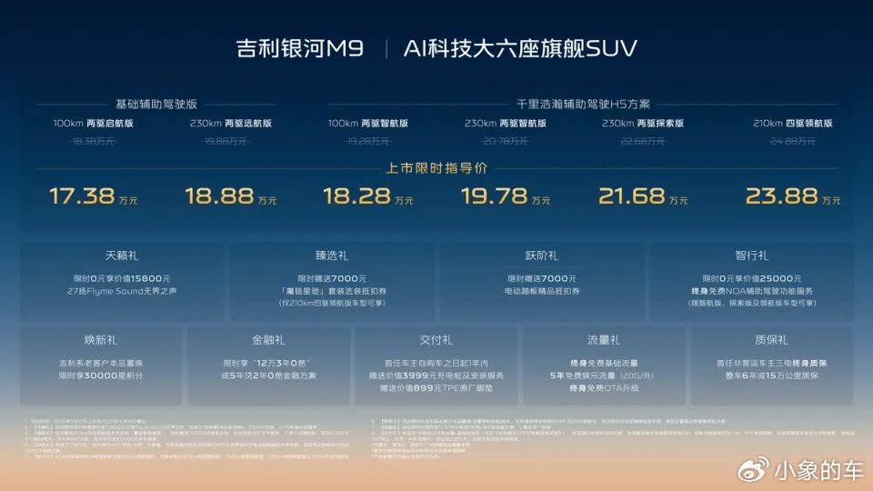 提起高端豪华新能源汽车市场,华为和理想绝对是两个实力强劲的头部玩家。 然而,华为和理想留下的活路,如今却正在被造车老师傅——吉利李书福堵死。这到底是怎么回事呢? 1. 群雄征战大六座SUV2020年以前,合资品牌和豪华燃油车,牢牢统治着六座SUV市场。 它们如同世袭的贵族,凭借着品牌历史光环与燃油技术专利壁垒,统治着这片利润丰厚的疆域。 然而,从2021年开始,新能源浪潮席卷而来。李想带领理想,还有华为扶持的问界,乘着时代东风快速崛起。 它们以增程式混动技术破局,抢占了很多六座SUV市场份额,挺起了中国汽车在这一细分领域的脊梁。 2024年,在售主流品牌6座SUV车型全年销量为82万辆,2025年该类车型销量预计将达到百万辆左右的规模,同比增长超20%。 增量空间显现的背后,是市场消费需求的转变。 随着二胎、三胎政策的开放,以及消费升级大潮涌起,大型SUV与MPV车型成了很多家庭的用车刚需。 相较于MPV,六座SUV兼具通过性与多功能性,其赛道更宽,前景更广。这一细分赛道成为诸多中国车企的目标,慢慢逐渐卷成“红海”。 2. 华为理想留下的活路近日,吉利银河也上市了一款大六座SUV。 9月17日,在吉利汽车大本营杭州,吉利银河M9正式上市,限时指导价17.38-23.88万元,这样的定价策略显得非常激进。 一方面,其正式售价,比两个月前预售价直接降了2万元; 另一方面,这样一款大型六座SUV,同类型产品最低起步价都在25万元左右了,而银河M9的起售价直接定在17万元出头,甚至低于许多合资品牌的五座中型SUV。 银河M9不仅真正将旗舰级别大六座SUV的起售价格拉到了底线,而且其搭载了高端智驾和三电机四驱的顶配车型,也不过23万+,同样也是行业竞拍中所没有的价格。 在新能源汽车普遍比同级别燃油车贵的当下,这一价格彻底颠覆了“大车必贵”的认知,也进一步大大降低了旗舰级别大六座SUV的门槛。 难怪银河M9的一经预售,24小时就收获超4万辆订单。 种种迹象表明,华为理想留下的活路,正在被吉利银河堵死。 3. 被吉利李书福堵死了在大六座SUV市场,吉利银河M9把路堵死,绝非简单的价格战,而是一次对市场逻辑的彻底重构与对消费者的需求满足。 第一,价格祛魅,戳穿“溢价泡沫”。 早期入局的理想L9/L8、问界M9/L8,虽产品力出色,但价格也高高在上,动辄三四十万甚至四五十万元,无形中构筑了“大六座=高溢价”的行业迷思。 银河M9彻底击碎了这层迷思,以“半价理想、半价问界”的姿态,将大六座SUV的门槛拉低至合资紧凑型SUV的区间。所谓的品牌溢价、营销泡沫被无情戳穿,市场回归价值本质。 第二,标签进化,从“家庭刚需”到“科技个性”。 早期的市场教育侧重于“家庭奶爸车”,而银河M9在完美承接家庭需求的同时,凭借吉利全域AI的体系力赋能,将竞争维度拉升到了智能化和个性化的新高度。 它不仅是移动的家,更是一个AI智慧伙伴,在空间魔术、安全堡垒、驾控乐趣、节能极致和智能交互上,汇聚了前沿的科技属性。 用“大空间+低能耗+智能基础配置”组合,银河M9消费者花的虽是实在钱,享受的却是超越期待的、富有科技感与个性的高品质体验。 在大六座SUV汽车市场,理想与问界留下的活路,正在被既懂技术、更懂市场的“造车老师傅”李书福,用一款“掀翻桌子”的银河M9堵死了。 他堵死的,不是市场的可能性,而是虚高定价权和陈旧价值体系的卖车策略。 银河M9的突破,绝非单一车型的胜利,而是银河诸多爆款车型热销的密码——技术普惠、需求满足。 身经百战的“造车老师傅”李书福,带领吉利银河,为中国家庭开启了一个全新的、更公平的新能源汽车大众主流消费时代。 |