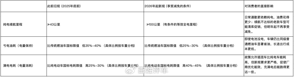 近期,工业和信息化部等三部门密集发布了关于新能源汽车车辆购置税和车船税优惠政策的技术要求调整公告。这些调整旨在引导产业技术升级,主要变化包括提高能耗标准、加严纯电续航门槛,并明确了从“免征”到“减半征收”的购置税政策转换。 这项新标准将于2026年1月1日正式实施,并与新能源汽车购置税减免政策挂钩。届时,不符合新能耗标准的车型将无法享受税收优惠。 简单来说,新国标的要求更严:相同重量的车,现在必须做得更省电才能达标;分类更合理:调整了质量分区,使标准更贴合当前市场上车辆的实际情况。最终目的是推动车企提升技术,让消费者买到能效更高、更省钱的产品。 对新能源车型提出了更高的要求 我们先看新标准的内容。 根据公告,“纯电动乘用车百公里电能消耗量应不高于《电动汽车能量消耗量限值第1部分:乘用车》(GB 36980.1—2025)对应车型的电能消耗量限值。最大设计总质量超过3500kg的乘用车电能消耗量限值要求,参照GB 36980.1—2025中最大设计总质量为3500kg乘用车电能消耗量限值执行。” 插电式(含增程式)混合动力车型的调整分为三个方面。首先插混车型的纯电续航里程应满足有条件的等效全电里程不低于100公里;其次,对电量保持模式试验的燃料消耗量的限值按照新版标准(《乘用车燃料消耗量限值》(GB 19578—2024))进行要求,具体比值有所调整;第三,电量消耗模式试验的电能消耗量与纯电车型电能消耗量的对标同样按照新版标准(《电动汽车能量消耗量限值 第1部分:乘用车》(GB 36980.1—2025))进行要求,比值同样也有所调整。 大家看起来是不是觉得太官方太正式,理解起来有难度?为了方便理解,下面我用直观的方式为大家解读。 举例说明,假设一辆车的整备质量为1500kg。按旧国标计算,能耗需低于0.0078×1500+3.8=15.5kWh/100km;按新国标计算,它落在1090kg至2710kg的区间,能耗需低于0.00556×(1500-1780)+13.92≈12.4kWh/100km。在这个例子中,要求严格了3.1度电,变化非常明显。 也就是说,这辆车不在税收减免的范围之内。 插混车型也面临同样的调整。如下图。 举例来说,2025年有不少纯电续航里程在100公里以内的插混车型(包括增程在内),在2026年将无法享受政策减免。关于后两条,亏电油耗,假设旧规下,一台燃油车的油耗限值是8L/100km,插混车只需低于8L*65%=5.2L即可。在新规下,新版燃油车限值可能先是加严20%,变为6.4L/100km。然后插混车需要低于6.4L*70%=4.48L/100km; 满电油耗,新规允许插混车的电耗比纯电车高40%-45%,而旧规是35%。关键在于,对比的基准——纯电车的电耗限值新国标(GB36980.1—2025)本身大幅加严了。这意味着,一台同样重的纯电车,在2026年必须做得比现在省电很多才能达标。在这个基础上,再允许插混车有更高的浮动空间,实际是要求插混车的电驱系统也必须同步优化。 消费者是现在入手还是等等看? 自2014年9月我国首次对新能源汽车实施免征车辆购置税政策以来,该政策始终处于动态优化之中,先后在2017年、2020年、2022年和2023年经历了多次延续与调整。与此同步,享受车船税优惠的节能与新能源汽车产品的技术要求也进行了相应更新。这些调整并非孤立进行,而是紧密契合了每一阶段新能源汽车市场的销量规模、技术进步程度(如动力电池能量密度、整车能耗控制、纯电续驶里程等关键指标)的实际发展水平。其核心政策导向十分明确,就是要通过逐步提高技术门槛,激励企业持续进行技术研发和产品升级,推动新能源汽车产业从追求“量”的扩张向实现“质”的飞跃转型,最终促进行业的高质量与可持续发展。 对于消费者来说,现在买车则是面临着“选择焦虑症”的难题——是抓住现有优惠立即购买,还是更看重产品技术的更新迭代。车辆购置税的现行税率为10%。这意味着,如果您计划购买一辆价格较高的车型,例如不含税售价为30万元的车,现在购买可免征3万元的税款;若等到2026年后购买,则需缴纳1.5万元的税款。仅从购置税这一项来看,在2025年底前购车,可能比2026年后购车节省最高1.5万元的直接支出。 当然,除了国家层面的税收优惠,不少地方政府和汽车厂商会推出额外的购车补贴或消费券。同时,国家还有“汽车以旧换新”政策,对报废指定类型旧车并购买新车的个人消费者给予定额补贴。这些政策可能与购置税减免叠加享受,进一步降低购车成本。消费者购车还需多关注地方政府的政策。 另外,工业和信息化部副部长熊继军在2025世界新能源车大会上指出,“将进一步扩大市场消费,实施新一轮汽车行业稳增长工作方案,优化新能源汽车车辆购置税、车船税等优惠措施,深入推进新能源汽车下乡,公共领域车辆全面电动化试点,县域充换电设施补短板的试点,扩大市场消费。” 以上,当前的产业动态清晰地指向一个更加智能化、绿色化和全球化的高质量发展方向。因此,我们有充足的理由对未来抱有信心。 百姓评车 综合来看,此次政策调整有着明确的技术升级指标。它为车企设定了明确的升级路径,避免了行业低水平重复建设,引导资源向研发环节集中。这说明了一个事实,中国新能源汽车产业进入了以技术创新驱动的高质量发展新阶段。同时也为消费者带来了更优选择。 |