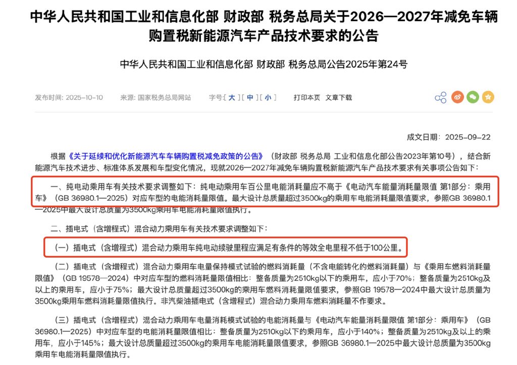 另外,前几天上头还发了新的公告,对2026—2027年减免车辆购置税的新能源车也做出了技术要求,核心就两条: 1、纯电车百公里电耗不能太高,需要满足一定限值。 2、插混车(含增程式)的纯电续航必须不低于100km(WLTC工况),否则直接踢出《减免税目录》。