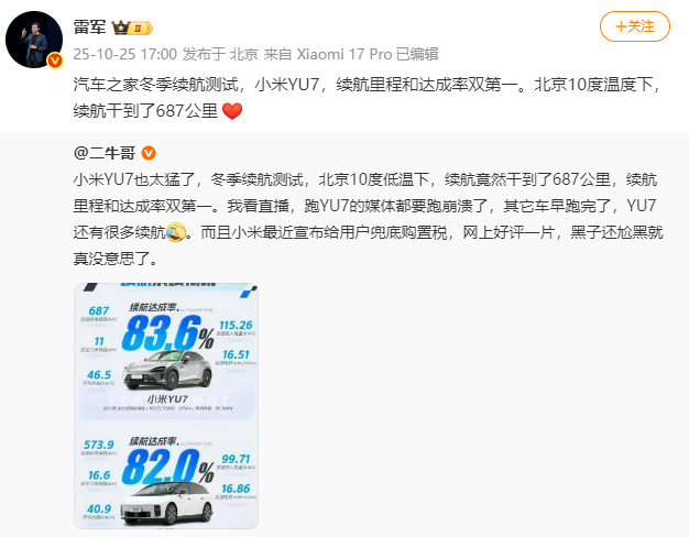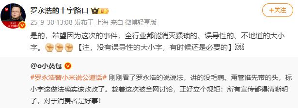 雷军的微博评论区,又现大型内涵现场。 事情起源于一条庆功微博。 近日,雷军兴奋地转发了一条消息,宣布小米YU7在汽车之家冬季续航测试中拿下续航里程和达成率双第一。 没想到评论区画风突变,一条“有没有小字”的提问收获热评第一。 面对网友的灵魂拷问,雷军既没否认也没解释,默默回了八个狗头表情包。 这波操作被网友秒懂:“好家伙,雷总这是用魔法打败魔法”、“八个狗头,等于‘行业陋习我不好说’”。 经历过一连串小字争议后,网友已经养成条件反射—— 看到小米宣传,先找小字说明。 1 小米的小字文学 小米的“小字梗”能破圈,罗永浩的神补刀功不可没。 这位行业明嘴在“逆光之王”事件后直言,用极小字标“目标成为”是行业普遍陋习,不是小米独创。 但他也毫不留情地指出,猥琐的、误导性的、不地道的小字该消灭。 图源:@罗永浩的十字路口 这话撕开了行业最后一块遮羞布。 放眼整个营销界,类似操作比比皆是。 食品包装上印着“不含蔗糖”,小字标注“含有结晶果糖”; 护肤品宣称“7天淡纹”,小字写着“基于实验室测试”; 快消品打着“买一送一”,角落里的“送一”指的是小样而非正装…… 这些商家都深谙一个道理,大字吸引注意力,小字规避法律责任。 然而,小米将这种艺术发挥到了新高度。 从手机到汽车,一系列“小字梗”让网友不得不拿起放大镜看广告。 手机圈里,小米17Pro标榜“逆光之王”,右下角却有一行几乎看不清的小字:“逆光之王是产品设计目标”。 图源:微博同系列还有“小尺寸续航之王”,旁边同样跟着“目标:小尺寸续航之王”。 图源:微博甚至网友还翻出旧账。 早年小米笔记本说“比一元硬币还薄”,结果实测是竖起来的硬币。 图源:微博SU7 Ultra宣传“1.98秒破百”,但备注了“不计起步时间”。 图源:小米YU7宣传的“超高标准材料应用2200MPa小米超强钢”,下面小字写着“小米超强钢指材质项目名称”。 图源:小米2 营销的真诚悖论 面对质疑,小米曾回应称小字备注是“行业通行做法”。 但这种解释难以平息公众的嘲讽:“照这逻辑,国足都能贴海报说‘世界杯冠军’,再补行小字‘努力目标’。” 网友总结小米的套路,“大字吹牛,小字圆场”。 这种小字文学很快被网友玩坏: “我叫冯云,比马云多两点。” “我喝54度白开水,比飞天茅台多1度。” “我拖拉机方向盘,比劳斯莱斯宽2cm。” 更损的梗是:“雷军比姚明还要高。” 图源:小红书冲着“之王”下单,结果发现是“目标”? 玩笑背后,是消费者感到被糊弄的无奈。 管理学大师彼得·德鲁克曾点出:“企业的唯一目的是创造顾客。” 但创造顾客不难,难的是留住顾客。 当消费者每次看宣传都要化身列文虎克找角落里的补充说明,买东西变成大家来找茬游戏时,品牌信任度也在一次次调侃中消耗殆尽。 有律师一针见血地指出,这种“大字吸睛、小字免责”的玩法,就算合规也涉嫌误导消费者。 毕竟普通消费者没义务也没精力去破译广告里的文字迷宫。 3 流量的双刃剑 雷军和小米的流量体质,早就成了一把停不下来的电锯。 好处显而易见。 雷军的“Are You OK”梗,为小米省下亿级广告费;小米SU7靠雷军自驾直播、短视频营销,预售量直接爆表。 但坏处是,一旦出事,舆论反噬也更狠。 比如今年3月小米SU7交通事故导致伤亡,尽管原因复杂,但网友第一反应是质疑“智能驾驶靠不靠谱”,甚至引申到“小米安全是否吹过头”。 还有半个月前闹得轰轰烈烈的小米SU7 Ultra碰撞后车辆燃爆事件。 图源:微博每当小米汽车发生交通事故时,媒体标题直接带上“小米”标签,上一个能享受这种曝光级别的事特斯拉。 高关注度意味着高审视,小问题会被放大为信任危机,大问题直接让你住在热搜上,持续接收来自数亿网民的审判。 这种流量反噬在商业上并不新鲜。 就像山姆和胖东来,享受了网红超市的销量红利,也得承受顾客拿放大镜挑刺的压力。 但问题是,当营销话术比产品跑得快时,信任消耗的速度会远超想象。 哲学家桑塔亚那有句话说得好:“那些拒绝从历史中吸取教训的人,注定要重蹈覆辙。” 对小字营销的依赖,本质上是对短期流量的贪婪。 但今天的消费者早就不像十年前那么好忽悠了。 大家会翻小字、会对比数据、会刨根问底。 你想玩文字游戏,反而可能被游戏玩进去。 4 营销与产品的天平 营销的本质是放大产品优势,而非创造不存在的优势。 小米YU7的续航成绩确实能打,横向对比同场测试的特斯拉Model Y实测469.8公里,理想i6(573.9公里)也比YU7逊色些。 图源:@雷军 甚至有上海车主晒出数据力挺,YU7 Pro版在11.6kWh/100km的能耗下,实际能跑741公里。 这些实实在在的数据,本不需要任何小字修饰。 营销或许可以带来短期热度,但唯有产品能承载长期信任。 看看那些被流量反噬的案例,有的品牌曾靠夸张宣传一夜爆红,却因产品质量问题迅速跌落神坛。 消费者可能会被华丽的营销话术迷惑一次,但不会上当两次。 当网友能捧着你也就能踩你,今天为你点赞的同一批人,明天可能因失望而转身。 营销做到120分,产品不及格,最终难以收场。 真正的长期主义,不是靠小字免责,而是靠产品说话;不是靠流量驱动,而是靠口碑传承。  图源:小红书雷军那八个狗头表情,与其说是回应,不如是一种无奈的解围。 毕竟在流量时代,解释可能越描越黑,沉默又会被骂傲慢