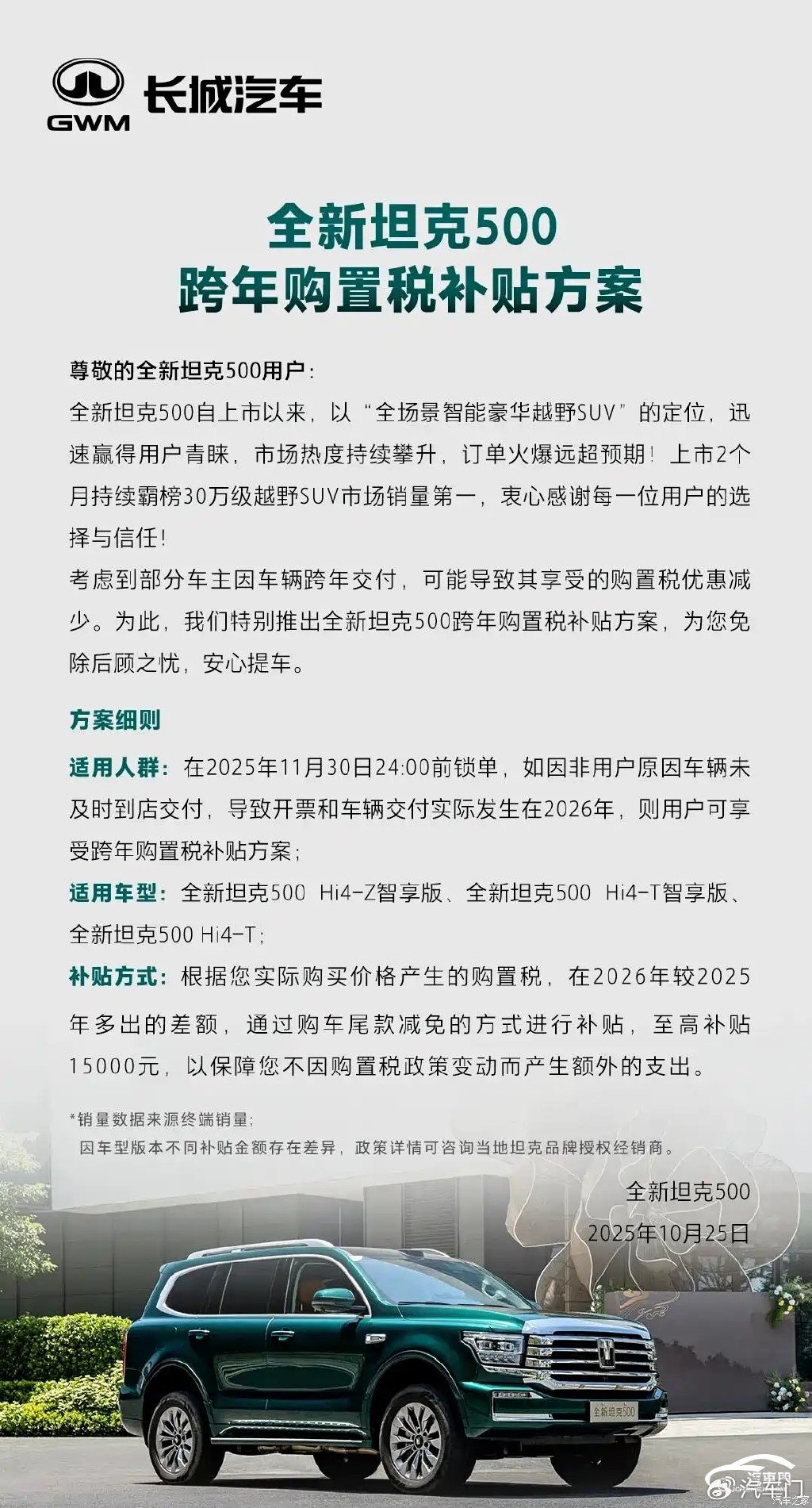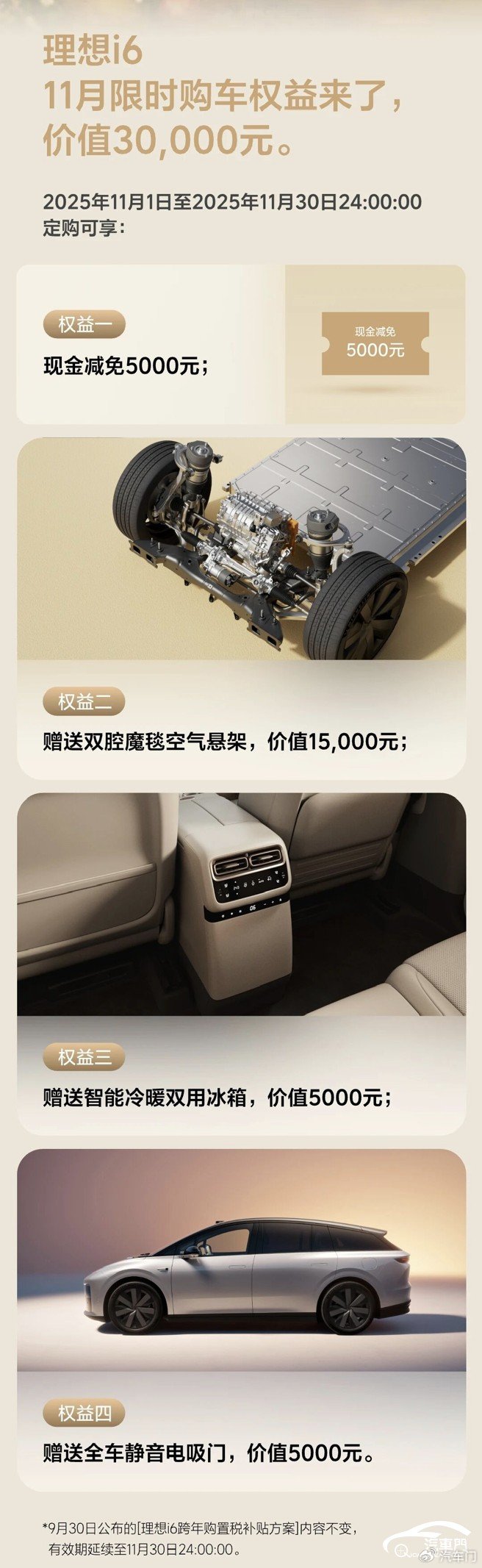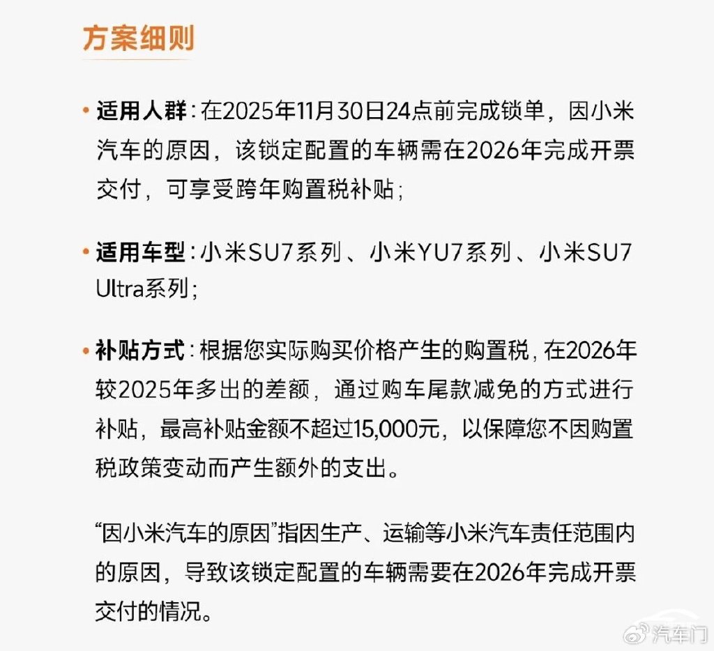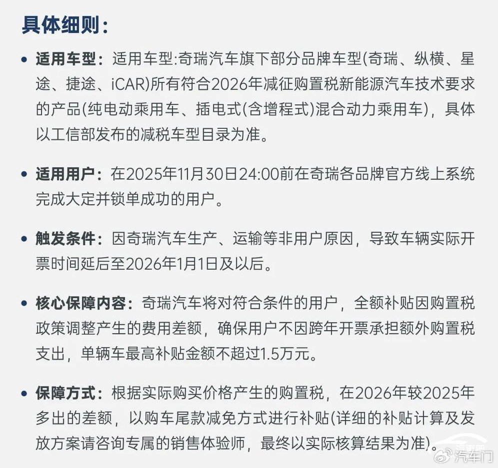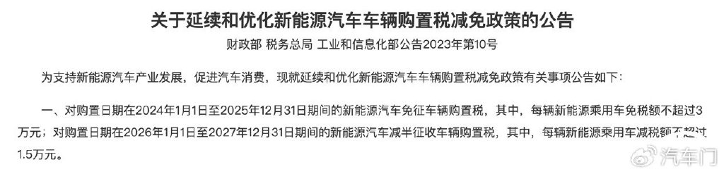 10月27日,理想汽车官方宣布将对旗下的理想i6车型提供四项限时权益。 权益内容具体包括,理想汽车官方将对在2025年11月1日到2025年11月30日24:00:00定购理想i6的车主,提供现金减免5000元、赠送智能冷暖双用冰箱、全车静音电吸门、双枪魔毯空气悬架四项限时购车权益。该权益还补充到:理想i6的跨年购置税补贴方案内容不变。 三天前的10月24日,小米汽车官方发布跨年购置税补贴方案。该方案称小米汽车官方将为在2025年11月30日24点前完成锁单,因小米汽车原因,导致锁单车辆需在2026年完成开票交付的,可享受跨年购置税补贴。该方案适用车型为小米SU7系列、小米YU7系列、小米SU7 Ultra系列。 同为造车新势力的零跑汽车早在9月21日就发布了2025年与2026年零跑汽车的购置税对比。零跑汽车官方针对零跑汽车旗下车型的购置税做出详细说明,2025年购车可享受购置税全免政策,零跑汽车还标明了2026年购车,其旗下不同车型减半的购置税。以零跑C16六座版纯电630激光雷达智尊版减半征收购置税计算为例,购置税最高可免除8044元。 除此之外,老牌车企也紧跟优惠潮流,纷纷推出跨年购置税、置换补贴等各项优惠政策。 10月18日,东风日产官方称将针对「满血版」东风日产N7车型,为即日起至11月30日,完成大定并锁单的车主提供包括跨年购置税全补贴、加码置换补贴等限时权益。 随后国产品牌也陆续颁布优惠方案。10月25日,长城汽车宣布为2026 款坦克 500车系旗下的新款坦克 500 Hi4-Z 智享版、新款坦克 500 Hi4-T 智享版、新款坦克 500 Hi4-T 车型推出“跨年购置税补贴方案”。 该方案称,长城汽车将为在2025年11月30日24:00前锁单坦克500车系的车主,如因非用户原因车辆未及时到店支付,导致开票和车辆交付实际发生在2026年,则车主可享受跨年购置税补贴方案。另外,针对2026年多出的差额,长城汽车将通过购车尾款减免的方式进行补贴,至高补贴15000元。 次日的10月26日晚,奇瑞汽车公布购置税补贴方案,方案内容包括奇瑞汽车官方将对在2025年11月30日24:00前完成大定并锁单成功的用户,因奇瑞汽车生产、运输等非用户原因,导致车辆实际开票时间延后至2026年1月1日及以后的用户,全额补贴因购置税政策调整产生的费用差额,单辆车最高补贴金额不超过1.5万元。 该方案适用车型为奇瑞汽车旗下的奇瑞、纵横、星途等部分品牌车型所有符合2026年减征购置税新能源汽车技术要求的产品。 从上述信息来看,各大车企的政策大同小异,11月底前锁单,车企兜底购置税。 2023年6月19日,我国工业和信息化部、财政部和税务总局发布公告称,对购置日期在2024年1月1日至2025年12月31日期间的新能源汽车免征车辆购置税,其中,每辆新能源乘用车免税额不超过3万元;对购置日期在2026年1月1日至2027年12月31日期间的新能源汽车减半征收车辆购置税,其中,每辆新能源乘用车减税额不超过1.5万元。 今年10月9日,我国工业和信息化部、财政部和税务总局根据《关于延续和优化新能源汽车车辆购置税减免政策的公告》发布《关于2026—2027年减免车辆购置税新能源汽车产品技术要求的公告》。公告称,对纯电动和插电式(含增程式)乘用车进行有关技术要求调整。其他技术要求继续按照《关于调整减免车辆购置税新能源汽车产品技术要求的公告》(工业和信息化部 财政部 税务总局公告2023年第32号)规定执行。 这也意味着我国自2014年9月开始实施的新能源汽车购置税免征政策即将进入倒计时。 而目前距离政策开始施行仅剩三个月。上文提到的优惠政策正是各大车企为应对购置税减免政策收紧而实行的“兜底”举措。该政策旨在保护车主权益,避免因购置税政策变动造成额外支出。 在业内看来,车企推出优惠也是为了冲击销量。 今年十月,各大车企纷纷公布了今年前三季度销量目标表完成情况。数据显示,我国自主车企今年前三季度销量目标完成率在70%左右,各车企销量同比有所上升。 “造车新势力”方面,小鹏汽车、小米汽车和零跑汽车今年前三季度的销量目标完成率达到了60%以上,但部分车企的销量距离完成今年全年的销量目标有一定差距。 中国汽车流通协数据显示,今年10月上半月,车市集客情况相比9月上半月上升35.4%,较9月下半月上升12.3%;订单情况相较9月上半月上升13%。 今年十月,据中国汽车流通协会乘用车市场信息联席分会数据显示,初步推算2025年10月狭义乘用车零售总市场预计为220万辆左右,环比小幅降低2.0%,同比下降2.6%。其中新能源车今年10月零售量可达132万左右,渗透率有望提升至60%左右。 乘联分会秘书长崔东树表示,2026年调整新能源购置税减免政策会导致消费者在今年年底前集中购车。今年第四季度不仅是我国汽车市场迎来政策红利释放的“黄金窗口期”,还是“银九金十”销售旺季和年末,各大车企将抓紧关键节点冲量。预计今年第四季度我国汽车市场产值仍能实现小幅增长。 今年仅剩最后两个月,各大车企通过推出购置税补贴、跨年补贴、现金优惠等“兜底”方案,以完成年末冲量。 而各大车企的免购置税优惠政策只是一个开始,预测接下来的“双十一”“双十二”“跨年”等活动也将成为各大车企推出新一波优惠的契机。 |