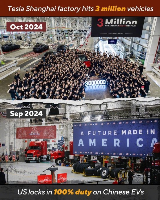 对比图的上半部分显示,2024年10月,特斯拉上海超级工厂第300万辆整车正式下线;图片下半部分显示,2024年9月,美国宣布对中国电动汽车征收100%的关税。“哪一个才是开放市场?”华春莹在帖文中发问道。