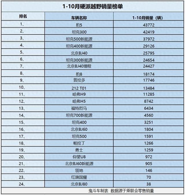 电动化与智能化时代,硬派越野车市场变化很大,首先,这一细分市场中,合资以及海外品牌硬派越野不再是市场“主角”,光芒变弱;此外,国产新能源硬派越野得到大众消费者的关注,坦克、方程豹、北京越野旗下的新能源产品,畅销车型不在少数。 那么,这一细分市场中,哪些硬派越野车受消费者欢迎,不妨看看销量数据,日前,乘联会发布1-10月零售销量数据,鬼哥整理出1-10月硬派越野销量榜单。 结果,让人大跌眼镜的是,这一细分市场虽然看起来热闹,但销量表现很一般,1-10月,整个榜单没有一款硬派越野累计零售销量达到5万辆,确实有点惨。接下来,看看具体车型排名与销量表现。 榜单上,排名第一位的车型是豹5,1-10月累计零售销量达到43772辆,这款硬派“方盒子”的销量表现依然很给力,它在智能与性能方面做得很新潮,受到不少年轻消费者的喜爱。 坦克300排名第二位,1-10月累计零售销量达到42419辆,新款坦克300在产品力上增加不少新元素,竞争力不可小觑。坦克500新能源排名第三位,1-10月累计零售销量达到37972辆,今年,坦克500新能源也进行焕新,产品力变得更现代,更接地气,销量表现增长很明显。 坦克400新能源排名第五位,1-10月累计零售销量达到29126辆,机甲造型加上智能体验,都是新款坦克400新能源的“加分项”,圈粉度直线升级。 北京BJ40排名第五位,1-10月累计零售销量达到25795辆,这款越野“老将”内在素质很能打,而且,耐用性强,一直有很多专业玩家愿意为其买单。 坦克300新能源排名第六位,1-10月累计零售销量达到24654辆,这款车型的特点是适配多场景用车需求,它不光能越野,都市代步,精致露营都可以,而且,专业素质与续航能力也很棒。 北京BJ40增程排名第七位,1-10月累计零售销量达到24427辆,这款车型价格门槛不高,加上北京越野的性能与口碑,销量表现很不错。豹8排名第八位,1-10月累计零售销量达到18174辆,坦克系列车型对于豹8的阻击很明显。 普拉多排名第九位,1-10月累计零售销量达到17746辆,如今,普拉多在国内市场的光环或许不如从前那么耀眼,销量与排名不是绝对领先,但论机械素质与越野实力,普拉多依然很能打。 212 T01排名第十位,1-10月累计零售销量达到13484辆,这款硬派越野销量表现一直没有大红大紫。哈弗H9排名第十一位,1-10月累计零售销量达到11285辆;哈弗H5排名第十二位,1-10月累计零售销量达到8742辆,这两款硬派越野车机械素质很扎实,但产品的时尚感与智能化程度不如新能源对手那么强。 福特烈马排名第十三位,1-10月累计零售销量达到6434辆,这款美系“硬汉”在中国市场的表现并没有那么猛。坦克700新能源排名第十四位,1-10月累计零售销量达到4560辆,它是坦克品牌的旗舰级产品,性能与装备都很强劲。 榜单上,1-10月,累计零售销量超过1000辆的硬派越野还有坦克400、北京BJ60、坦克500、帕拉丁和勇士。此外,仰望U8、北京BJ60新能源、领地、红旗国耀、北京BJ80也出现在榜单上。 鬼斗车观点:现在的硬派越野市场,Z 世代与新中产成为消费主力,对于他们来说,一款硬派越野不光是越野工具,还是生活态度的体现。现在,很多新能源越野SUV解决传统越野车的槽点,兼顾舒适与通过性能,受到不少年轻消费者的追捧。 |