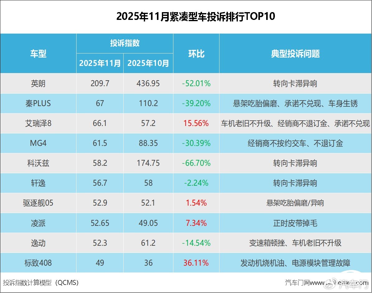 近日,汽车门网公布了2025年11月份的投诉数据。本月,汽车门网紧凑型车的投诉指数为1867.2,环比下滑了20%,投诉热度出现明显回落趋势。 榜单TOP10中,多数车型的投诉指数已回落至常态区间,仅英朗的投诉指数仍处于高位。这背后,转向卡滞异响的投诉集中度仍然较高。与此同时,有个别车型出现了小规模集中投诉事件。整体上,上榜车型的投诉问题多以老生常谈的“痼疾”为主。 以下是2025年11月紧凑型车投诉指数分析: 第一名:英朗 投诉指数 209.7 典型故障:转向卡滞异响 汽车质量投诉点评:11月,英朗投诉指数环比下降了52.01%,转向卡滞异响的投诉声量减弱。不过,受投诉基数偏大影响,英朗仍占据投诉榜单首位。投诉数据显示:有关英朗转向卡滞异响的投诉指数是161.85,占其整体投诉量的77%。过去11个月里,英朗在紧凑型车投诉榜单中从未掉出过前五名,始终是投诉榜单的“常客”。针对该问题,尽管官方通过召回维修(如更换转向轴、升级电子转向系统程序等)进行解决,但其仍未被彻底根治。 第二名:秦PLUS 投诉指数 67 典型故障:悬架吃胎偏磨、承诺不兑现、车身生锈 汽车质量投诉点评:11月,秦PLUS的投诉指数再次下滑了39.2%,目前已经不足70。从反馈来看,车主投诉的问题大多以长期存在的“痼疾”为主,而悬架吃胎偏磨、承诺不兑现、车身生锈是最集中的三个问题。 第三名:艾瑞泽8 投诉指数 66.1 典型故障:车机老旧不升级、经销商不退订金、承诺不兑现 汽车质量投诉点评:过去一个月,艾瑞泽8的投诉指数达到了66.1,环比上涨了15.56%。除经销商不退订金外,车机老旧不升级和承诺不兑现的投诉问题有隐隐抬头之势。其中,车机老旧不升级主要集中在2022款车型,该问题主要原因是硬件芯片性能不足而引起。官方曾表示,由于OTA升级对硬件算力要求高,仅8155芯片可支撑流畅运行,非8155芯片的车机暂不支持升级。而这,也导致2022款车型自发布以来几乎没有收到有效的OTA系统更新。承诺不兑现则表现在维保代金券无法使用、购车补贴不兑现等情形。 第四名:MG4 投诉指数 61.5 典型故障:经销商不按约交车、不退订金 汽车质量投诉点评:11月,MG4依旧位列投诉榜单第四名,经销商不按约交车、不退订金依旧有部分车主在投诉。据了解,多位车主通过官方APP支付2000元车款订车后,4S店未按约定时间交车,当车主们要求退还车款时,销售人员总以各种理由推诿,故意拖延时间。不过,过去一个月MG4的投诉指数已经下滑了30.39%。 第五名:科沃兹 投诉指数 58.2 典型故障:转向卡滞异响 汽车质量投诉点评:过去一个月,科沃兹投诉指数环比大幅下滑了66.7%,转向卡滞异响的投诉逐渐趋于平静。从投诉反馈的问题来看,别克英朗和雪佛兰科沃兹的转向系统问题如出一辙,转向异响、转向卡滞、转向沉重和方向不正都是主要问题表现。据了解,出现转向卡滞异响的科沃兹车型绝大部分都是四年以上的老车,已经过了质保周期。面对车主的集中投诉,上汽通用雪佛兰也并未拿出更有效的解决方案。出现问题的车主只能被迫忍受,因此投诉一直不断。 |