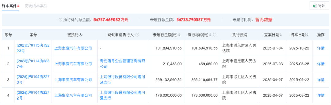截至 2025 年 11 月,集度汽车存在 25 条被执行人信息,被执行总金额超 1.3 亿元,另有 5.47 亿元终本案件未履行,叠加此前披露的 70 亿元对外欠款,债务压力成为其核心困境。