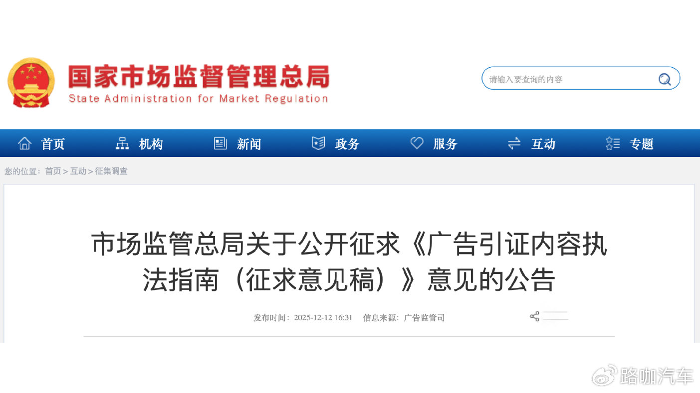 也就是说,接下来的2026年,大概率不再是和2023-2025年那样,拼“电比油低”、“电比电低”的深层逻辑。当然,价格的竞争还会继续出现,因为汽车销售是市场化的行为。不过,目前发生的车企变化,以及监管变化都明确着一个新的信号,烈度会明显降低。 同样就在吉利、长安两家车企发布会的这一周里,还有三个改变2026车市竞争的信号。 12月12日,市场监管总局在充分调研的基础上,研究起草了《广告引证内容执法指南(征求意见稿)》(以下简称《指南》),对“广告引证内容”“引证广告”的概念、广告引证内容应当遵守的一般性原则和合规要求进行细化,并公开征求意见,为期一个月。主要针对的是,广告宣传中的,首创、第一等噱头,大字吸睛、小字免责等。