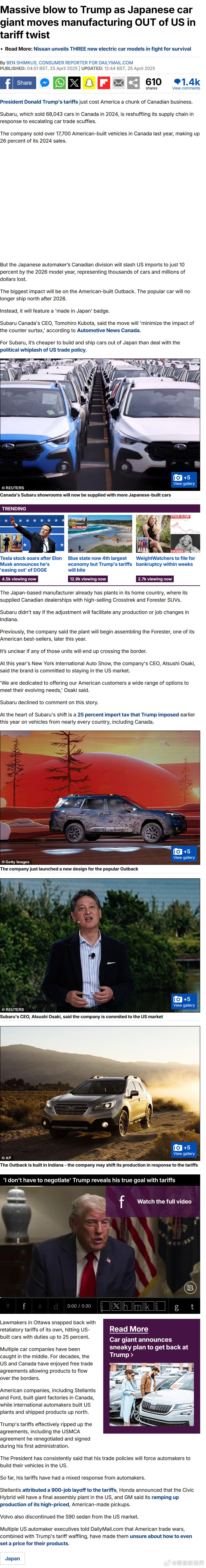 【小日本反了!!!!!制造业反撤离美国!!!!!】 特朗普遭重击!日本汽车巨头因关税问题将生产基地迁出美国 #海外新鲜事##地球大棋局# 特朗普遭重击!日本汽车巨头因关税问题将生产基地迁出美国 特朗普总统的关税政策刚刚让美国损失了一大块加拿大业务。 斯巴鲁在2024年向加拿大出售了68,043辆汽车,现在正因不断升级的汽车贸易摩擦而重组其供应链。 该公司去年在加拿大共售出了超过17,700辆美国制造的汽车,占到其2024年总销量的26%。 但斯巴鲁加拿大分公司计划到2026年车型停产时,将美国进口汽车的比例削减至10%,这代表着数千辆汽车以及数百万美元的损失。 受影响最大的将是美国制造的傲虎车型。该畅销车型在2026年之后将不再向北运输。 相反,它将挂着“日本制造”的标志。 据《汽车新闻加拿大》报道,斯巴鲁加拿大公司的首席执行官久保田知弘表示,此举将“最小化报复性关税的影响”。 对于斯巴鲁来说,与其应对美国贸易政策的政治冲击,不如在日本建造和运输汽车更便宜。 这家日本制造商已经在本土设有工厂,向加拿大经销商供应畅销的Crosstrek和Forester SUV。 斯巴鲁尚未说明此次调整是否将促进印第安纳州的任何生产或就业变动。 此前,该公司表示该工厂将于今年晚些时候开始组装其美国最畅销车型之一的森林人。 目前尚不清楚这些单位是否最终会越境。 在今年的纽约国际车展上,公司首席执行官青山映表示,该品牌致力于留在美国市场。 “我们致力于为美国客户提供多种选择,以满足他们不断变化的需求,”青山映说道。 斯巴鲁拒绝对此故事发表评论。 推动斯巴鲁转型的核心是特朗普今年早些时候对几乎所有国家包括加拿大的车辆征收的25%的进口关税。 渥太华的议员们以报复性关税回击,对美国制造的汽车征收高达25%的关税。 多家汽车公司在这场贸易战中夹在中间。几十年来,美国和加拿大一直享受着自由贸易协议,允许产品跨境流通。 包括Stellantis和福特在内的美国公司在加拿大建造了大型工厂,而国际汽车制造商则在美国建造工厂并将产品运往北方。 特朗普的关税实际上撕毁了包括他在其第一届政府期间重新谈判并签署的《美墨加协定》在内的协议。 总统一再表示,他的贸易政策将迫使汽车制造商在美国建造车辆。 到目前为止,他的关税政策对汽车制造商产生了喜忧参半的反应。 Stellantis将900人裁员归咎于关税,本田宣布Civic Hybrid将在美国拥有最终组装工厂,而通用汽车则表示其美国制造的高端皮卡产量正在上升。 沃尔沃也停止了S90轿车在美国市场的销售。 多位美国汽车制造高管告诉《每日邮报》,美国的贸易战加上特朗普的关税政策让他们对自己的产品甚至如何定价都感到不确定。 |