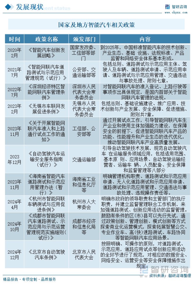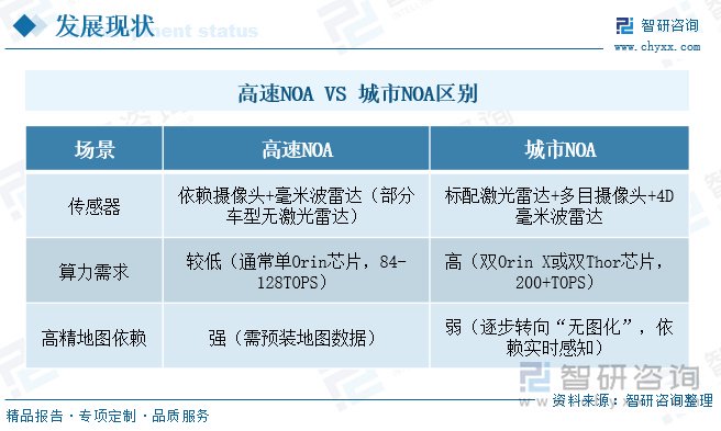 内容概要:NOA(Navigate on Autopilot),即领航辅助驾驶,也被称为自动辅助导航驾驶或导航辅助驾驶,即车辆在高速或城区行驶时,自动执行车道变更、出入匝道、超车、转向、加减速等复杂操作。它利用车载传感器和高精度地图数据,在驾驶员的监督下为车辆导航和驾驶提供智能辅助。近年来,随着消费者对汽车安全性、便捷性和智能化需求的不断提升,智能驾驶技术,尤其是高阶智驾技术的应用范围正逐步扩大。高阶智驾已经迈过“尝鲜期”,高速NOA、城市NOA等功能正向10万-20万元的主流价格区间普及,到2024年乘用车城市NOA渗透率达16.8%,高速NOA渗透率为4.9%。从商业模式来看,高速NOA商业模式以软件标配+硬件标配为主,占比超60%,即交付即可使用,无需额外支付费用,而城市NOA则以软件选配+硬件预埋为主,占比超70%,即软件需要额外支付费用才可享受,说明车企希望通过更高阶的软件获取溢。从售价区间来看,无论是高速公路还是城市道路应用场景,NOA功能主要集中在20万-30万的价格区间内。由于高阶功能的实现以往较为依赖激光雷达,其成本相对较高,因此配备这些功能的车型通常定位为中高端产品。2024年期间,在高速NOA搭载中,20-30万元价格区间占比47.8%。在城市NOA搭载中,20-30万元价格区间占比62.1%。随着技术的普及化、智驾平权时代的到来,越来越多的中低端车型也开始搭载NOA功能,城市NOA功能逐步下探至10-20万元价格带,高速NOA标配车型的价位进入10万元区间,智能驾驶加速普及。 上市企业:广汽集团(601238)、小鹏汽车-W(09868)、蔚来-SW(09866)、理想汽车-W(02015)、比亚迪(002594)、吉利汽车(00175)、长城汽车(601633)、长安汽车(000625) 相关企业:广州汽车集团股份有限公司、上海汽车集团股份有限公司、华为技术有限公司、广州小鹏汽车科技有限公司、比亚迪股份有限公司、小米科技有限责任公司、长城汽车股份有限公司、重庆长安汽车股份有限公司、上海蔚来汽车有限公司、深圳市速腾聚创科技有限公司、上海禾赛科技有限公司、图达通智能科技(苏州)有限公司、北京初速度科技有限公司、深圳元戎启行科技有限公司 关键词:NOA、智能驾驶、智能化、汽车传感器 一、NOA相关概述 NOA(Navigate on Autopilot),即领航辅助驾驶,也被称为自动辅助导航驾驶或导航辅助驾驶,即车辆在高速或城区行驶时,自动执行车道变更、出入匝道、超车、转向、加减速等复杂操作。它利用车载传感器和高精度地图数据,在驾驶员的监督下为车辆导航和驾驶提供智能辅助。 NOA功能包括高速场景与城区场景,其功能实现是自动驾驶发展过程中的关键节点。高速NOA功能是在高速公路辅助(HWA)的基础上配置高精地图,以实现自动上下匝道功能。城区NOA功能是在部分城市道路按照导航路径智能辅助驾驶,引导车辆抵达目的地,适用场景通常为城市内的非结构化道路,可实现横向和纵向的控制,是ACC、LKA、ALC和高精地图功能的集成。 高速NOA和城市NOA两者在技术实现、硬件要求、应用场景及未来发展上差异显著。高速场景中,道路规则明确、交通参与者行为相对可预测、高精地图覆盖完善。在城市道路场景中,交通参与者动态性强、道路拓扑复杂、需实时感知与决策。 相关报告:智研咨询发布的《2025年中国NOA行业市场动态分析及未来趋向研判报告》 二、NOA行业发展背景 当下,汽车行业正处于风云变幻的变革期,技术迭代日新月异,市场竞争愈发白热化。这些因素相互交织,正加速推动“智驾平权”时代的来临,使汽车智能科技逐步走进寻常百姓家,同时也助力中国汽车朝着高质量发展的方向迈进。在政策方面,我国中央政府及各地方政府高度重视智能汽车发展,颁发了一系列政策法规,为汽车产业智能化发展保驾护航,加快推动高级自动驾驶商业化落地,助力我国由“汽车大国”迈向“汽车强国”。2020年2月,发改委、工信部等部门出台了《智能汽车创新发展战略》,明确了我国智能汽车产业发展的基本原则、战略愿景、主要任务、保障措施,为国内智能汽车产业发展吹响号角。《智能汽车创新发展战略》提出到2025年,中国标准智能汽车的技术创新、产业生态、基础设施、法规标准、产品监管和网络安全体系基本形成。2035到2050年,中国标准智能汽车体系全面建成、更加完善。在立法方面,深圳在2022年率先颁布《深圳经济特区智能网联汽车管理条例》,随后《无锡市车联网发展促进条例》《北京市自动驾驶汽车条例》等相继出台,为智能网络汽车上路提供法律保障。 汽车电动化的发展为智能化功能提供了坚实的能量基础。电动车采用到动力电池作为动力源,使得其能够为大量的传感器、计算芯片和通讯设备提供持续稳定的能量支持。而这些设备正是实现智能驾驶和智能座舱功能的关键所在。2024年,我国新能源汽车产销量分别达1288.8万辆和1286.6万辆,同比分别增长34.4%和35.5%,新能源汽车新车销量达到汽车新车总销量的40.9%,较2023年提高9.3个百分点。 推动以智能驾驶为核心的智能化功能发展成为行业共识,智能驾驶已成为汽车智能化发展阶段的核心竞争点。在市场层面,智驾功能也成为消费者购车过程中重要的考量因素之一。中国电动汽车百人会发布的《汽车智能化发展报告(2024)智驾篇》中显示,90%的中国消费者愿意为高阶智能驾驶服务额外付费,其中30%甚至愿意支付1万元以上。而对于部分年轻消费者