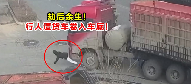 这是2024年11月25日,发生在甘肃白银市的一起事故。当时,曹某驾驶重型半挂牵引车在左转进加油站时,将一名与其同向步行的行人撞倒。极其万幸的是,行人倒地位置恰好在车轮轨迹之外,在几乎是必死的情势下躲过一劫,仅在被撞摔倒时受伤。