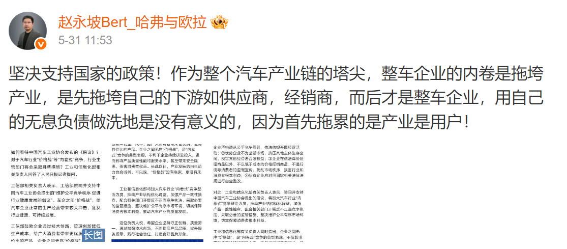 文 / 现代物流报记者 马敬泽 汽车行业的低价内卷再次引发社会热议。对此,有关部门、行业协会、企业代表等纷纷发声,呼吁车企停止价格战,共同维护公平竞争秩序。 5月31日,中国汽车工业协会(下称:中汽协)发布《关于维护公平竞争秩序促进行业健康发展的倡议》。 (来源:中国汽车工业协会官网) 倡议指出,5月23日以来,某车企率先发起大幅降价活动,多家企业跟进效仿,引发新一轮“价格战”恐慌。无序“价格战”不仅将进一步挤压企业利润空间,影响产品质量和售后服务保障,危害消费者权益,还会冲击产业链供应链安全,把产业发展带入恶性循环。 工信部、长城汽车发声 据“工信微报”微信公众号,工业和信息化部(下称:工信部)相关负责人在回答记者提问时表示,工信部赞同并支持中汽协提出的“维护公平竞争秩序促进行业健康发展的倡议”。车企之间“价格战”,给汽车企业正常的生产经营带来较大冲击,危及行业健康、可持续发展。 该负责人表示,工信部将加大汽车行业“内卷式”竞争整治力度,推动产业结构优化调整,加强产品一致性抽查,配合相关部门开展反不正当竞争执法,采取必要的监管措施,坚决维护公平有序市场环境,切实保障消费者根本利益,推动汽车产业高质量发展。 另外,对于工信部与中汽协的表态,长城汽车哈弗及欧拉品牌总经理赵永坡在微博上表示“坚决支持国家的政策”。他指出,作为整个汽车产业链的塔尖,整车企业的内卷是拖垮产业,是先拖垮自己的下游如供应商,经销商,而后才是整车企业,用自己的无息负债做洗地是没有意义的,因为首先拖累的是产业是用户。 (来源:微博) 此前,长城汽车董事长魏建军就曾在采访中公开痛斥“价格战”。他表示,一些企业不遵守商业规则的竞争,无限度地逼使供应商降价,还有一些企业拖欠供应商货款,使供应商面临很差的生存环境。“‘价格战’透支的不仅是企业利润,更是消费者对‘中国制造’的信任。”魏建军说。 专家:进一步整改或将到来 汽车行业为何陷入“价格内卷”的怪圈?中汽中心党委书记、董事长安铁成指出,汽车市场阶段性供需失衡与产业结构问题是内卷的重要原因。 一方面,我国汽车市场增速放缓,进入存量竞争阶段。2024年,我国汽车销量同比增长4.5%,低于过去十年平均6%的增速,而国内销量同比增长1.6%,市场规模基本稳定在2600万辆左右。而在海外市场开拓面临挑战的背景下,激进的价格战就成为车企争夺国内有限市场份额的手段。 另一方面,与发达国家或地区相比,我国汽车市场集中度相对偏低。2024年,我国销量前3企业或集团市场份额约36.2%,而美欧日2024年销量前3企业市场份额分别为44.2%、54.2%和70.1%,差距明显。同时,我国具有整车生产资质的企业数量过多且良莠不齐,大量落后企业应退未退,通过低价策略维持基本生存,挤压优质企业生存空间。 (来源:央视新闻) 安铁成还指出,企业创新动力不足,某些灰色地带行为缺乏直接有效的管理手段,也是市场竞争开始异化为非理性“内卷式”竞争的重要原因。 那么,如何更加有效地遏制“价格内卷”的不当行为,维护市场公平竞争秩序?汽车工业协会原常务副会长兼秘书长、中国动力电池产业联盟理事长董扬直言,反内卷不能只靠企业自觉,有为政府与有效市场的有机结合,是综合治理“内卷式”竞争的重要手段。 他指出,要维护产业发展秩序的稳定和长远,政府应加强对于业内企业违反法律和法规行为的处罚力度;重点检查相关企业拖欠零部件企业的账期问题,限期落实政府关于缩短账期的要求;支持指导汽车工业协会,聘请第三方专业组织机构,落实行业自律行为。从中汽协和工信部的发声来看,政府下一步可能会采取上述举措。 “中汽协的此次倡议不是单纯的行业协会的行业自律,是落实中央政治局会议精神的重要举措,并会有政府行为跟进。此次倡议的内容,也留有政府相关部门进行督促检查的余地。” 董扬也对业内同仁发出提醒。他表示,中汽协此次倡议把反对打“价格战”提到了关乎行业健康发展、关乎消费者权益和可能留下交通安全隐患的高度,中汽协完全可以在内部设立机制,落实行业自律问题,这项工作也一定会得到政府有关部门的指导和支持。 “请相关企业认真按照倡议自我整改,不要认为以前政府没有采取过的措施,今后就不会采取。” |