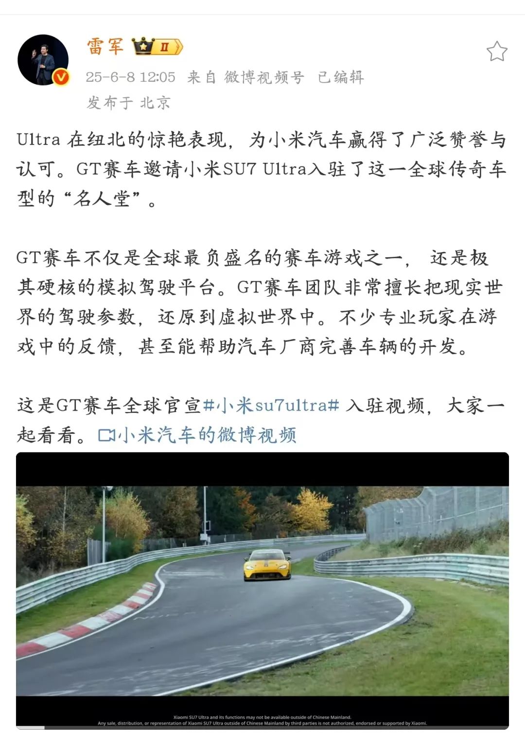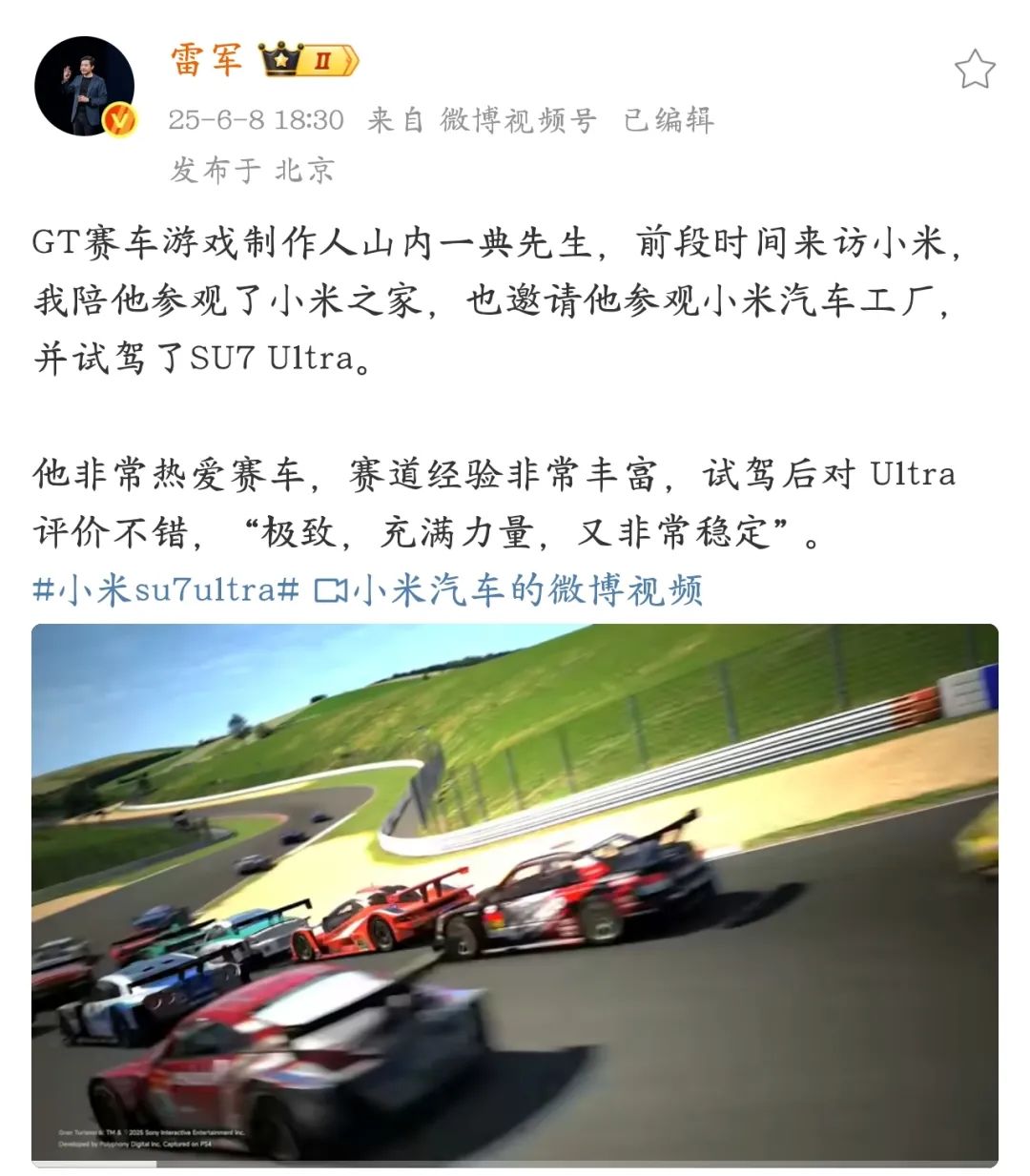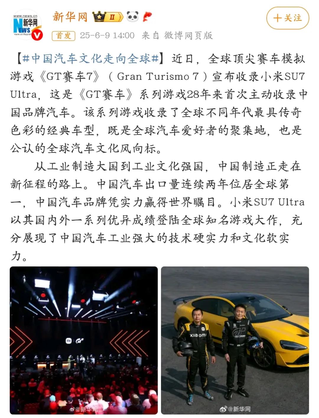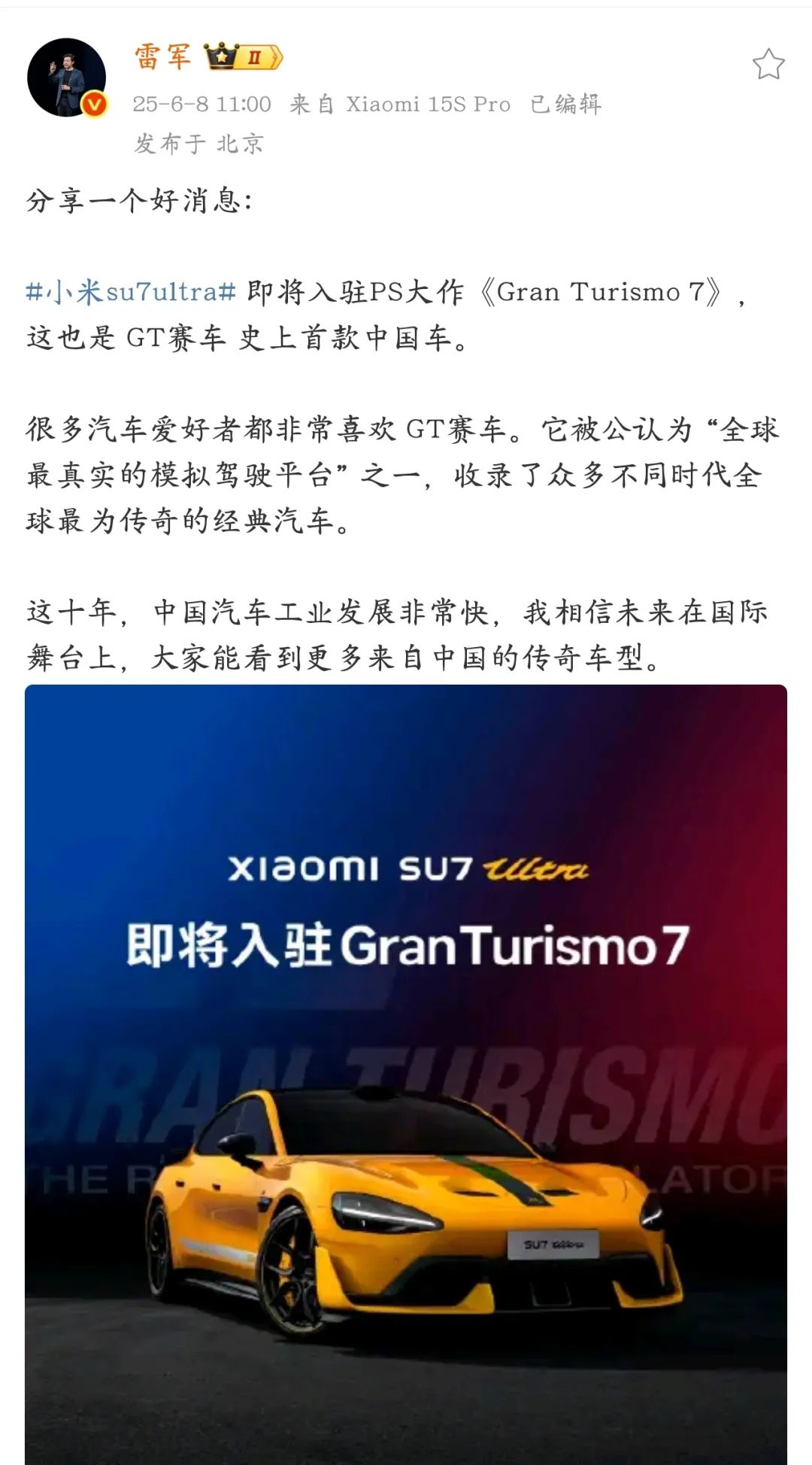 (转自:新行情) 不鸣则已,一鸣惊人。 出品 | 新行情   作者 | 唐仁 小米SU7 Ultra 加入GT7 雷军最近活跃起来了,不断秀实力证明造车能力。 近日,雷军宣布小米SU7 Ultra即将入驻PS大作《Gran Turismo 7》,并强调 SU7 Ultra 成为该系列28年历史上首款中国品牌车型。  图源:微博雷军提到,“很多汽车爱好者都非常喜欢GT赛车。它被公认为‘全球最真实的模拟驾驶平台’之一,收录了众多不同时代全球最为传奇的经典汽车。” 显然,雷军想表明小米SU7 Ultra已经算得上是当今时代的经典汽车了,言语之间可谓是骄傲感满满。 随后,雷军又发文解释了小米SU7 Ultra入驻GT赛车的原因,“Ultra 在纽北的惊艳表现,为小米汽车赢得了广泛赞誉与认可。”即小米SU7 Ultra在真实赛道上的技术表现,例如其刷新纽博格林北环四门车纪录的硬核性能,与《GT赛车》追求极致真实性的理念高度契合。  图源:微博同时,雷军还介绍了一波GT赛车,“GT赛车不仅是全球最负盛名的赛车游戏之一,还是极其硬核的模拟驾驶平台。GT赛车团队非常擅长把现实世界的驾驶参数,还原到虚拟世界中。不少专业玩家在游戏中的反馈,甚至能帮助汽车厂商完善车辆的开发。” 介绍了GT赛车还不够,雷军紧接着又放出了他和GT赛车制作人山内一典的合影,并强调“山内先生不仅是游戏玩家的偶像,也是众多汽车爱好者的偶像。小米内部有不少山内先生的粉丝。”  图源:微博可见,雷军对于小米SU7 Ultra入驻《Gran Turismo 7》十分在意。 而在介绍完山内一典之后,雷军又再次发文介绍两人的合作细节,表示拥有丰富赛道经验的山内一典对小米SU7 Ultra赞不绝口,“极致,充满力量,又非常稳定。”  图源:微博这可谓是借山内一典宣传和认证了一番小米SU7 Ultra的实力,妥妥的双赢。 除此之外,雷军还担心网友们不了解GT赛车,特地转发了一条介绍GT赛车和小米凭什么加入GT赛车的视频,推荐网友们观看。  图源:微博雷军这一通操作下来,直接将小米SU7 Ultra成为首款加入GT赛车的中国车一事宣传了出去,引得新华网发文点赞—— 新华网表示,“小米SU7 Ultra以其国内外一系列优异成绩登陆全球知名游戏大作,充分展现了中国汽车工业强大的技术硬实力和文化软实力。”  图源:微博对此,网友们也是好评不断—— 有的网友表示,“小米SU7 Ultra的入驻,不只是打破了《GT赛车》没有中国车的记录,更是一次中国汽车工业向全世界的展示。”“是对中国品牌汽车的认可,期待其在游戏中展现风采。”  图源:微博还有的网友则表示,“进地平线5”“那微软的地平线能不能安排一下”。  图源:微博值得一提的是,GT赛车和地平线系列都是竞速游戏,只是细分类型不同,可见,网友们对于小米SU7 Ultra加入竞速游戏十分期待。 这也间接性地说明了小米SU7 Ultra在赛车赛道的实力,难怪雷军连发5条微博来宣传分享,毕竟,在舆论关注之下,小米取得的任何成就都会被审判,而打破质疑的最好方式,就是实力。 小米汽车好消息不断提到小米汽车,除了小米SU7 Ultra加入GT赛车这一好消息之外,其他的好消息也不少。 就小米SU7而言,此前,雷军曾分别发文强调小米SU7获得J.D.Power榜单第一。 雷军先是发文宣布,小米SU7在全球知名调研机构君迪发布2025中国新能源汽车产品魅力指数研究榜单中,荣膺大型纯电动车第一。  图源:微博同时,雷军还着重讲了榜单的构成,基于车主实际用车调研,购车2-6个月内体验,涉及外观造型、车辆性能、驾驶感受等11大指标,覆盖81个城市,21211名受访者参与评价。 最后,雷军强调,小米SU7得分825,是所有车型最高分。 后来,雷军再次发文表示,“小米SU7 斩获J.D.Power"消费者之声”大奖,2025年度中国新能源汽车新车质量研究NEV-IQS大型纯电动细分市场 第一名!”  图源:微博这次,雷军强调,“榜单衡量和统计新能源车新车车主在2-6个月的拥车期内遇到的质量问题。研究按品牌,车型和细分市场来分析传统的产品质量(生产质量)和潜在的产品质量(设计所造成的使用缺陷)。” 而小米SU7两次获得了大型纯电动细分市场不同评价体系的第一名,说明小米SU7既有颜值又有质量,实力十分能打。 对此,小米汽车发表了《双项第一!小米SU7获J.D.Power质量大奖》的文章以表实力,而雷军最直接转发并强调,“小米SU7已交付超过25万台,强大的产品力是高销量的基础,还有出色的品质和质量。”  图源:微博显然,雷军是想强调小米SU7的产品力强大,无论是外观还是质量以及安全性,都是一流的,大有种回应近月来外界诸多对小米SU7安全问题的质疑的意味。 值得一提的是,此前小米总裁卢伟冰曾放豪言表示,“SU7发布这么久,一款都没有是SU7的对手,一个能打的都没有。产品力强才没有对手,没有对手就能够保证利润率。” 可见,小米对于自身造车的产品力格外自信,根本没在怕的。或许也正是因为这份底气,才能让小米YU7未售先火—— 在小米YU7开了“不公布价格、不开小定”的预售发布会后,其外观、配置、内饰等各方面细节就受到了外界的广泛关注,网友们对YU7的价格更是议论纷纷。 随后不久,小米汽车发布微博称,小米YU7确认参加5月31日-6月8日的粤港大湾区车展,但因为诸多功能尚未正式发布,在车展期间,YU7将以不开门的方式进行静态展示。  图源:微博不过,虽然无法试驾体验,但小米YU7在展车到店后依旧受到了大量围观,场面相当火爆。  图源:抖音社交媒体上,相关门店的官方号于凌