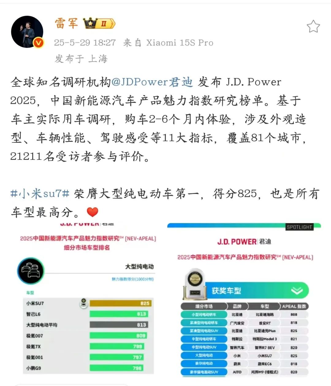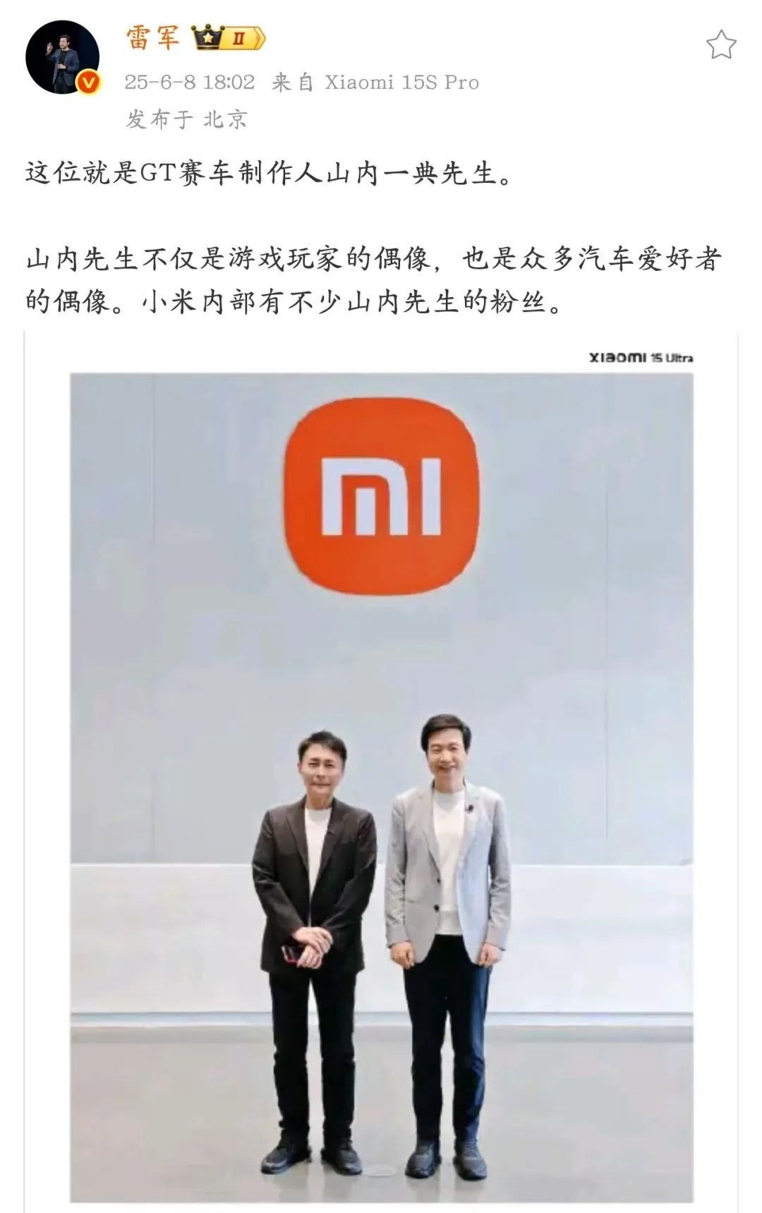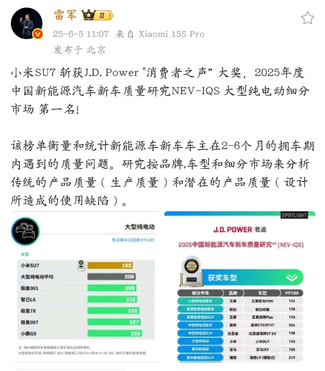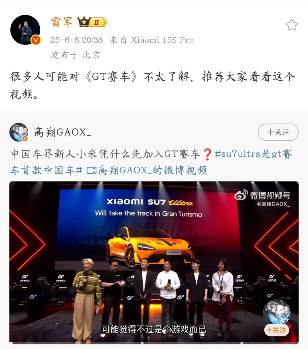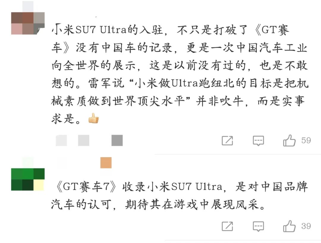 (转自:新行情) 不鸣则已,一鸣惊人。 出品 | 新行情   作者 | 唐仁 小米SU7 Ultra 加入GT7 雷军最近活跃起来了,不断秀实力证明造车能力。 近日,雷军宣布小米SU7 Ultra即将入驻PS大作《Gran Turismo 7》,并强调 SU7 Ultra 成为该系列28年历史上首款中国品牌车型。  图源:微博雷军提到,“很多汽车爱好者都非常喜欢GT赛车。它被公认为‘全球最真实的模拟驾驶平台’之一,收录了众多不同时代全球最为传奇的经典汽车。” 显然,雷军想表明小米SU7 Ultra已经算得上是当今时代的经典汽车了,言语之间可谓是骄傲感满满。 随后,雷军又发文解释了小米SU7 Ultra入驻GT赛车的原因,“Ultra 在纽北的惊艳表现,为小米汽车赢得了广泛赞誉与认可。”即小米SU7 Ultra在真实赛道上的技术表现,例如其刷新纽博格林北环四门车纪录的硬核性能,与《GT赛车》追求极致真实性的理念高度契合。  图源:微博同时,雷军还介绍了一波GT赛车,“GT赛车不仅是全球最负盛名的赛车游戏之一,还是极其硬核的模拟驾驶平台。GT赛车团队非常擅长把现实世界的驾驶参数,还原到虚拟世界中。不少专业玩家在游戏中的反馈,甚至能帮助汽车厂商完善车辆的开发。” 介绍了GT赛车还不够,雷军紧接着又放出了他和GT赛车制作人山内一典的合影,并强调“山内先生不仅是游戏玩家的偶像,也是众多汽车爱好者的偶像。小米内部有不少山内先生的粉丝。”  图源:微博可见,雷军对于小米SU7 Ultra入驻《Gran Turismo 7》十分在意。 而在介绍完山内一典之后,雷军又再次发文介绍两人的合作细节,表示拥有丰富赛道经验的山内一典对小米SU7 Ultra赞不绝口,“极致,充满力量,又非常稳定。”  图源:微博这可谓是借山内一典宣传和认证了一番小米SU7 Ultra的实力,妥妥的双赢。 除此之外,雷军还担心网友们不了解GT赛车,特地转发了一条介绍GT赛车和小米凭什么加入GT赛车的视频,推荐网友们观看。  图源:微博雷军这一通操作下来,直接将小米SU7 Ultra成为首款加入GT赛车的中国车一事宣传了出去,引得新华网发文点赞—— 新华网表示,“小米SU7 Ultra以其国内外一系列优异成绩登陆全球知名游戏大作,充分展现了中国汽车工业强大的技术硬实力和文化软实力。”  图源:微博对此,网友们也是好评不断—— 有的网友表示,“小米SU7 Ultra的入驻,不只是打破了《GT赛车》没有中国车的记录,更是一次中国汽车工业向全世界的展示。”“是对中国品牌汽车的认可,期待其在游戏中展现风采。”  图源:微博还有的网友则表示,“进地平线5”“那微软的地平线能不能安排一下”。  图源:微博值得一提的是,GT赛车和地平线系列都是竞速游戏,只是细分类型不同,可见,网友们对于小米SU7 Ultra加入竞速游戏十分期待。 这也间接性地说明了小米SU7 Ultra在赛车赛道的实力,难怪雷军连发5条微博来宣传分享,毕竟,在舆论关注之下,小米取得的任何成就都会被审判,而打破质疑的最好方式,就是实力。 小米汽车好消息不断提到小米汽车,除了小米SU7 Ultra加入GT赛车这一好消息之外,其他的好消息也不少。 就小米SU7而言,此前,雷军曾分别发文强调小米SU7获得J.D.Power榜单第一。 雷军先是发文宣布,小米SU7在全球知名调研机构君迪发布2025中国新能源汽车产品魅力指数研究榜单中,荣膺大型纯电动车第一。  图源:微博同时,雷军还着重讲了榜单的构成,基于车主实际用车调研,购车2-6个月内体验,涉及外观造型、车辆性能、驾驶感受等11大指标,覆盖81个城市,21211名受访者参与评价。 最后,雷军强调,小米SU7得分825,是所有车型最高分。 后来,雷军再次发文表示,“小米SU7 斩获J.D.Power"消费者之声”大奖,2025年度中国新能源汽车新车质量研究NEV-IQS大型纯电动细分市场 第一名!”  图源:微博这次,雷军强调,“榜单衡量和统计新能源车新车车主在2-6个月的拥车期内遇到的质量问题。研究按品牌,车型和细分市场来分析传统的产品质量(生产质量)和潜在的产品质量(设计所造成的使用缺陷)。” 而小米SU7两次获得了大型纯电动细分市场不同评价体系的第一名,说明小米SU7既有颜值又有质量,实力十分能打。 对此,小米汽车发表了《双项第一!小米SU7获J.D.Power质量大奖》的文章以表实力,而雷军最直接转发并强调,“小米SU7已交付超过25万台,强大的产品力是高销量的基础,还有出色的品质和质量。”  图源:微博显然,雷军是想强调小米SU7的产品力强大,无论是外观还是质量以及安全性,都是一流的,大有种回应近月来外界诸多对小米SU7安全问题的质疑的意味。 值得一提的是,此前小米总裁卢伟冰曾放豪言表示,“SU7发布这么久,一款都没有是SU7的对手,一个能打的都没有。产品力强才没有对手,没有对手就能够保证利润率。” 可见,小米对于自身造车的产品力格外自信,根本没在怕的。或许也正是因为这份底气,才能让小米YU7未售先火—— 在小米YU7开了“不公布价格、不开小定”的预售发布会后,其外观、配置、内饰等各方面细节就受到了外界的广泛关注,网友们对YU7的价格更是议论纷纷。 随后不久,小米汽车发布微博称,小米YU7确认参加5月31日-6月8日的粤港大湾区车展,但因为诸多功能尚未正式发布,在车展期间,YU7将以不开门的方式进行静态展示。  图源:微博不过,虽然无法试驾体验,但小米YU7在展车到店后依旧受到了大量围观,场面相当火爆。  图源:抖音社交媒体上,相关门店的官方号于凌