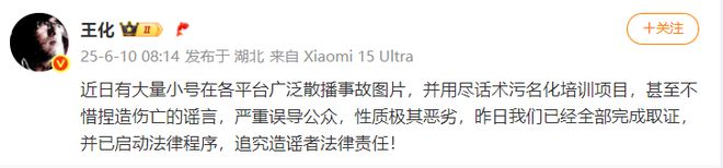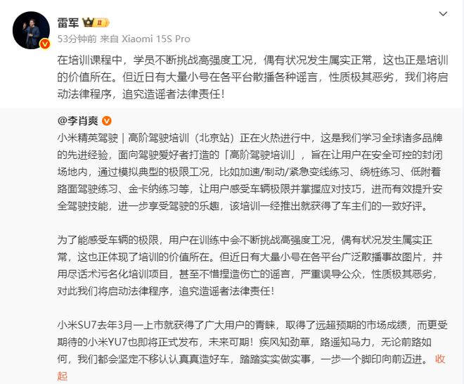 针对近期网络广泛传播的“小米汽车高阶驾驶培训发生致命车祸”传闻,10日上午,小米创始人、董事长兼CEO雷军在微博发文:在培训课程中,学员不断挑战高强度工况,偶有状况发生属实正常,这也正是培训的价值所在。但近日有大量小号在各平台散播各种谣言,性质极其恶劣,我们将启动法律程序,追究造谣者法律责任! 小米集团公关部总经理王化10日也发微博表示,近日有大量小号在各平台广泛散播事故图片,并用尽话术污名化培训项目,甚至不惜捏造伤亡的谣言,严重误导公众,性质极其恶劣,昨日(9日)已经全部完成取证,并已启动法律程序,追究造谣者法律责任。 传闻中因事故而“身亡”的北京站教练谢欣哲也通过微博发声,表示“我没事我很好”。 公开资料显示,“小米高阶驾驶培训”是小米创始人雷军在该公司15周年战略发布会上推出的新项目,于6月6日在北京正式启动,面向SU7车主,首批1万名用户可免费参与。课程以小米SU7 Max为核心教学车辆,并强调由拥有10年以上培训经验的教练团队执教。 课程设计围绕SU7 Max的动力响应、转向系统、制动特性等参数,分阶段开展操作练习。同时,训练环节引入金卡纳项目,强化车手对车辆动态极限的掌控与判断。 根据雷军6月6日公布的数据,小米SU7已交付超过25万台。小米一季度财报则显示,小米SU7系列交付新车达75869辆。同期,小米智能电动汽车及AI等创新业务分部总收入为人民币186亿元,其中,智能电动汽车收入人民币181亿元。 对于小米SU7上市后的表现,小米集团总裁卢伟冰曾表示,“SU7发布这么久,没有一款是SU7的对手,一个能打的都没有”,并称“没有对手就能够保证利润率”。 就在5月下旬,小米预发布了新车YU7。该车定位中大型SUV,拥有多种配置与续航版本,展车已在全国范围内陆续到店,将于7月正式上市 。 编辑|何小桃 杜恒峰  |