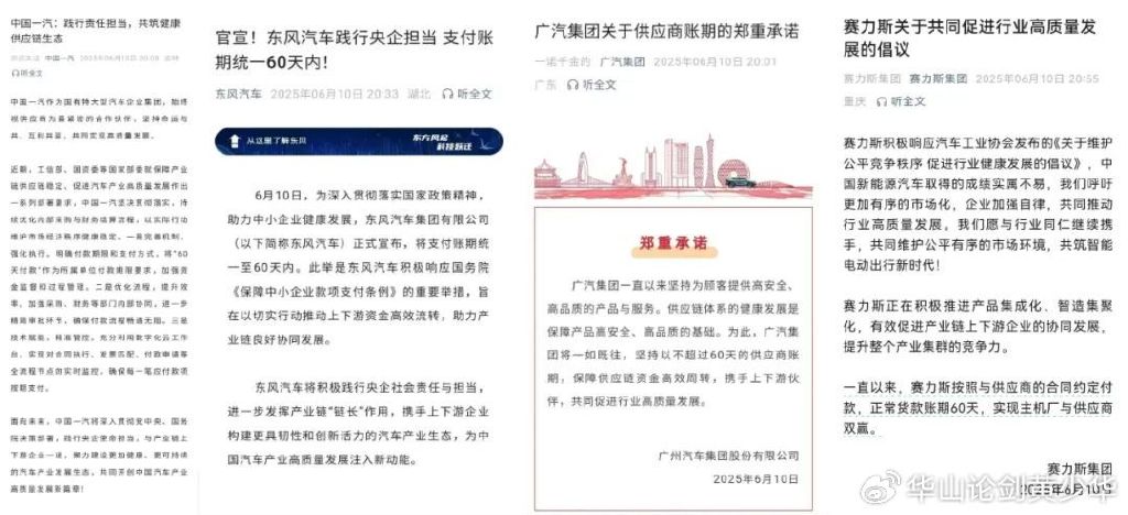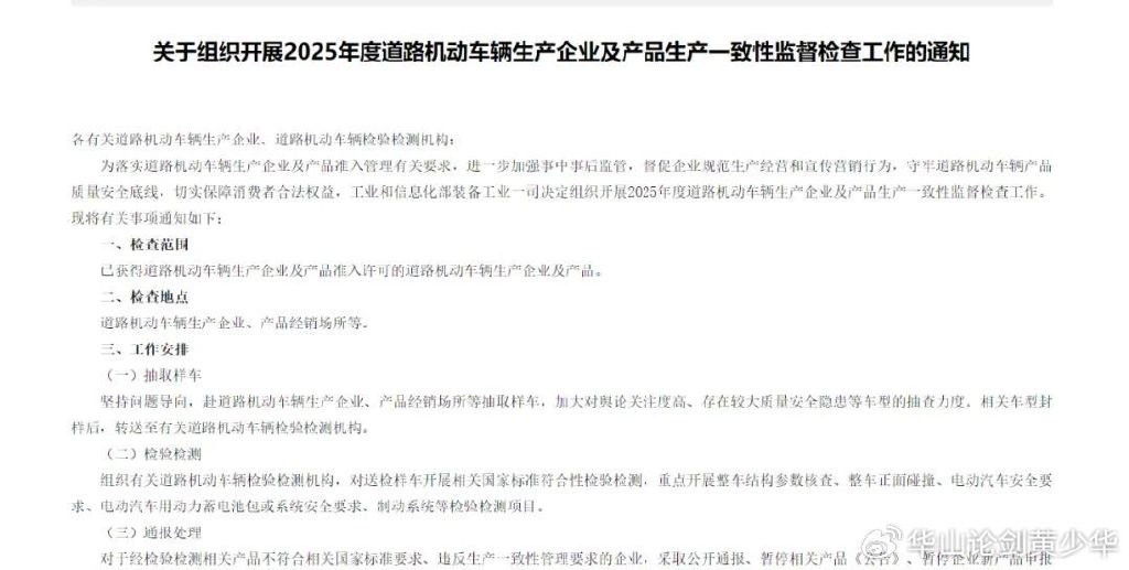 6月10日晚,中国第一汽车集团有限公司、东风汽车集团有限公司、广州汽车集团股份有限公司、赛力斯集团股份有限公司等四家汽车生产企业分别发表声明,就“支付账期不超过60天”作出承诺。 几大车企同时发布承诺,是汽车行业进入强监管时代到来的最好写照。 就在昨天,工业和信息化部装备工业一司发布一则通知,要求对道路机动车辆生产企业及产品开展生产一致性监督检查,重点瞄准整车碰撞、电池安全、制动系统等核心安全领域。 《通知》将此次检查的目标设定为:为落实道路机动车辆生产企业及产品准入管理有关要求,进一步加强事中事后监管,督促企业规范生产经营和宣传营销行为,守牢道路机动车辆产品质量安全底线,切实保障消费者合法权益。检查范围是已获得道路机动车辆生产企业及产品准入许可的道路机动车辆生产企业及产品。 同时,还明确了检查工作安排,即抽取样车、检验检测、通报处理。在抽取样车环节,坚持问题导向,赴道路机动车辆生产企业、产品经销场所等抽取样车,加大对舆论关注度高、存在较大质量安全隐患等车型的抽查力度。相关车型封样后,转送至有关道路机动车辆检验检测机构。在检验检测环节,组织有关道路机动车辆检验检测机构,对送检样车开展相关国家标准符合性检验检测,重点开展整车结构参数核查、整车正面碰撞、电动汽车安全要求、电动汽车用动力蓄电池包或系统安全要求、制动系统等检验检测项目。 对检验不合格的企业,工信部将祭出重拳——公开通报、暂停产品公告、暂停新产品申报。 这也可以看作工信部落实5月31日宣布的“综合整治新能源汽车行业‘内卷’问题” 三项举措的关键行动。 这段时间以来,汽车行业并不太平,一边是“价格战”打得火热,另一边是“口水战”也此起彼伏,而相关主管部门也三令五申,要重拳出击,终结汽车行业“内卷式”竞争乱局。 汽车行业的监管风暴并非突如其来。早在今年3月初的电动汽车百人会论坛上,工信部、发改委、国资委三部委集体发声,直指 “内卷式”竞争已成为行业毒瘤。 数据显示,2024年汽车行业利润率已降至4.3%,远低于全国工业企业平均水平。另据不完全统计,2024年全行业共有227款车型卷入价格战,新能源汽车平均降价1.8万元。 经销商成为最直接受害者。中国汽车流通协会报告显示,盈利经销商比例跌破40%,比2023年再降4.2个百分点。 面对行业乱象,5月31日,中国汽车工业协会发布反“内卷式”竞争倡议,获得工信部明确支持。倡议剑指低价倾销、虚假宣传等扰乱市场行为,要求企业严格遵守公平竞争原则。 工信部随后将“综合整治新能源汽车行业‘内卷’问题” 列为近期重点主抓的三项工作之一。6月9日的生产一致性检查通知,正是这一整治行动的具体落地。 而此次强监管浪潮覆盖汽车产业链的关键环节,从智能驾驶宣传到电池安全标准,再到车门把手设计,无一遗漏。 随着强监管政策的落地,可以预测的是,汽车行业将加速深度洗牌,技术实力薄弱的企业面临生死考验。 一方面,合规成本激增,技术门槛提高。一位电池供应商透露:“过去堆续航就能卖车,现在安全不达标直接出局,产线上每块电池成本增加了8%,但没人敢讨价还价”。新规要求车企在产品主要技术参数表中补充40条CDAS和OTA相关参数,纳入准入和生产一致性管理。 这些要求显著增加了企业的测试验证成本。深度测试方案需覆盖功能、场景、人机交互和耐久性测试,结合虚实测试与数据驱动方法验证安全性和稳定性。 另一方面,不能继续拖欠供应商货款,通过延长账期转嫁成本压力,这对很多企业而言将是非常大的成本压力。 因此,可以肯定的是,在政策引导与市场倒逼的双重作用下,汽车行业竞争逻辑正在重构,从 “拼低价”走向“拼价值” 的新时代已然开启。 第一,技术差异化成为核心竞争力。当价格战被政策锁死,技术储备成为生死分水岭。 第二,行业加速整合,加速资源优化。从央企重组浪潮到吉利主动“瘦身”,都意在降本增效。 第三,加速国际化布局,但要防止价格战从国内卷到国外。正如奇瑞控股集团党委书记、董事长尹同跃所说,出海车企要有大格局,“大家都是中国汽车工业的组成部分,我们都顶着一顶中国汽车的帽子,一荣俱荣,一损俱损,不能把价格战卷向海外,更不能相互诋毁拆台,而是要在品质、安全性能、服务上多下功夫。” 第四,在强监管大背景下,要“有法可依、有法必依、执法必严”,同时要重构公平的竞争环境,逐渐实现“油电同权”,实现从“野蛮生长”到“法治竞争”的根本蜕变。  |