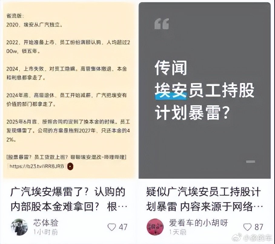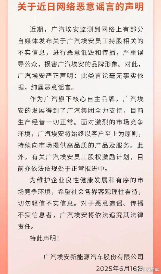 风云变幻的汽车行业,一则消息如平地惊雷,瞬间掀起轩然大波。 广汽埃安传出,“员工持股爆雷”的消息。时值“汽车恒大论”甚嚣尘上之际,埃安的爆雷传闻显得格外敏感。 广汽埃安深夜紧急辟谣,但难掩外界猜测的暗流涌动。 1. 广汽埃安紧急辟谣6月16日晚10点多,广汽埃安紧急发布一则《关于近日网络恶意谣言的声明》。该声明,直指近期在社交平台发酵的“员工持股爆雷”传闻。 广汽埃安表示,监测到网络上有部分自媒体发布关于广汽埃安员工持股相关的不实信息。 对此,广汽埃安进行了直接辟谣:“此类言论毫无事实依据,纯属恶意谣言。” 这份深夜发布的声明,让持续十来天的舆论攻防战浮出水面。 事情肇始于6月初,某汽车自媒体发布题为《华南某大型汽车集团,员付费上班,内购股票疑似暴雷》的帖子。 虽然没有指名道姓,但很多网友都将矛头指向广汽集团。 后来,该账户持续爆料,甚至直接在标题中点名,发布《广汽集团埃安公司的员工购股票事件,未来何去何从?》。 一时之间,广汽埃安爆雷的消息迅速扩散,甚至衍生出“埃安资金链断裂”的猜测,事情越闹越大。关键时刻,广汽埃安不得不出面发布官方声明。 2. 员工内购股票爆雷?2022年3月,广汽集团发布了关于广汽埃安实施员工持股的公告。明确提到,公司员工通过非公开协议增资方式持股,合计出资近18亿元,持股比例4.55%。 据悉,当时埃安内部股改推动了全员持股。从高层到员工,基本每人都有配额。部分资金不足的员工,埃安还提供贷款。 根据当时协议,2025年5月之前,员工只需支付利息,之后才开始偿还本金。 这说明当时大家都认为埃安会在此之前上市,员工身价倍增,完全有能力偿还本息。 然而,埃安IPO折戟沉沙,未能顺利上市。这就导致员工内购股票,如今面临利息和本金的偿还压力。 有爆料称,很多人已经不还息,并和公司的关系十分紧张。公司已经分批次约谈员工,若再不还息,就强制按照42%折扣退还认购资料,相当于贬值缩水一半。 另外,本金可以延迟至明年再换,内购股票后续或转销第三方。当然,这些都是传闻。 对此,广汽埃安的官方回应是:“员工股权激励计划,目前亦依法依规处于正常推进中。” 3. 埃安销量大幅滑坡广汽埃安的历史,最早可以追溯到2017年,与蔚小理等新势力几乎同时诞生。 当时还叫广汽新能源,属于广汽乘用车的一个分公司。乘着新能源汽车的东风,广汽新能源高速发展,并在2020年独立并升级为子品牌——埃安。 产销快报显示,埃安2022年热销27万辆,同比暴涨126%。 2023年,埃安月销量一度突破5万辆,全年爆卖48万辆,同比劲增77%,仅次于比亚迪、特斯拉,位居行业第三,堪称名副其实的“大黑马”。 可是到了2024年,随着新能源汽车市场竞争加剧,埃安在销量上遭遇当头一棒。 去年,埃安销量不增反降至37.5万辆,同比下挫22%,大幅跑输车市大盘。 进入2025年,埃安销量依旧没有起色,继续跌跌不休。今年前5个月,埃安累计只售出8.9万辆,同比下滑12%,月均销量已不足两万辆,与巅峰期的5万辆相差甚远。 近两年销量的持续下滑,可能是埃安没能顺利上市的主因。 广汽埃安“员工持股爆雷”传闻,恰似一面棱镜,折射出新能源汽车复杂的行业现状。无论真相如何,这场风波都为埃安敲响了警钟。 埃安销量下滑带来的困境,如同盘踞在前方的荆棘,等待着广汽去斩除。 但愿这场风波能成为广汽埃安涅槃重生的契机,让它在反思中重塑自我,在变革中重铸辉煌。 但愿这场危机最终化作埃安成长路上的一块踏脚石,而非压垮它的最后一根稻草。  |
