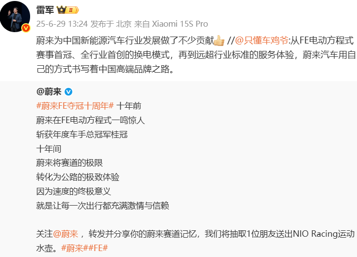 (转自:电动知家) 电动知家消息,6月29日,小米创始人雷军通过社交媒体转发蔚来纪念FE电动方程式夺冠十周年的推文,并公开称赞:“蔚来为中国新能源汽车行业发展做了不少贡献”。 2015年6月28日,蔚来TCR车队的尼尔森·小皮盖特在首届FE电动方程式伦敦收官之战中,以总分144夺得FE电动方程式历史上首个年度车手总冠军,这是中国车队在国际顶级汽车赛事中的首次冠军荣誉。 事实上,雷军与蔚来的渊源颇深。2013年,李斌启动造车计划时,雷军是最早知情的6位创始投资人之一,甚至早于李想等后来入局者。他曾在采访中谦逊回应:“其实是李斌给了我这个机会(投资蔚来)”,凸显双方基于技术信仰的互信。尽管小米汽车与蔚来存在竞争,但雷军多次强调蔚来在换电网络与赛事技术反哺上的行业价值。蔚来当前覆盖全国的超8000座充换电站(含3371座换电站),以及“9纵9横”高速换电网络,恰与小米“人车家全生态”战略中能源布局的空白形成潜在互补。 蔚来是全行业首创换电模式的车企,截至2025年6月,蔚来已在全国范围内建设超过8000座充换电站,其中包括3371座换电站和4635座充电站,还成功打通了9纵9横14大城市群的高速换电网络,高速换电站数量即将突破1000座。此外,蔚来ET9配备自主研发神玑NX9031芯片、全冗余线控底盘以及天枢·SkyOS系统,标志着中国智能汽车行业首次在核心技术领域与国际领先企业展开直接竞争。 |