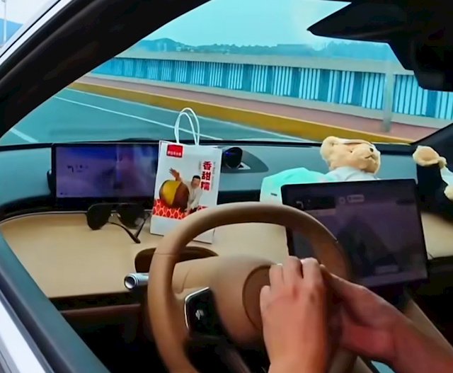 因为智界采用了远端式仪表盘设计,方向盘后方有较大的置物平台,车主就将食物和饮料摆在上面,自己一边吃一边让车自动驾驶。