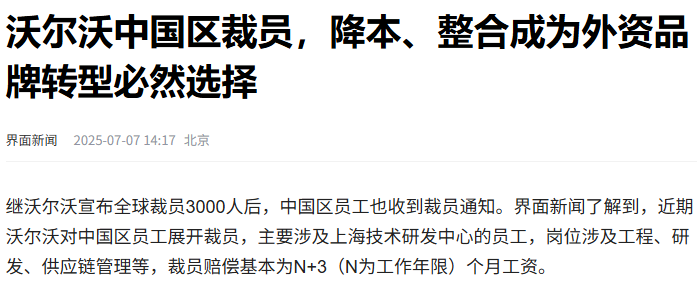 (转自:电动知家) 电动知家消息,7月7日,据多家媒体报道,沃尔沃中国区近期展开裁员,主要涉及上海技术研发中心的员工,岗位包括工程、研发、供应链管理等。裁员赔偿标准基本为“N+3”(N为工作年限)个月工资。此次裁员是中国区作为沃尔沃全球裁员计划的一部分,全球范围内计划裁减约3000个岗位。 沃尔沃裁员背后的原因主要是面临的财务压力。从财报数据看,沃尔沃2025年第一季度营收从939亿瑞典克朗降至829亿,营业利润更是从47亿骤降到19亿瑞典克朗,跌幅近60%。销量方面,全球销量下滑6%,中国市场下滑12%。在中国市场,沃尔沃面临严峻挑战。2024年全年销量15.64万辆,同比下滑8%。产品上多年没有大幅更新,新上市车型多为改款优化,缺乏竞争力。同时奔驰、宝马、奥迪等豪华品牌纷纷降价,挤压了沃尔沃的市场空间。此外,沃尔沃的电动化转型也遇到困难。去年9月宣布放弃2030年全面电动化目标,改为2030年90%销量来自电动化车型(包括纯电和插混)。在中国市场,沃尔沃新能源车型销量占比很低,近半年仅有11.51%。 沃尔沃汽车(Volvo Cars)是一家具有深厚历史底蕴和全球影响力的豪华汽车品牌,沃尔沃汽车总部位于瑞典哥德堡。沃尔沃汽车在欧洲、美洲和亚太地区均形成了从设计、研发、制造生产到销售售后的全体系布局,全球员工约43000人。 沃尔沃汽车由古斯塔夫·拉尔森和阿瑟·格布尔森于1927年在瑞典哥德堡创立。当时,两人在斯德哥尔摩饭店的一次小龙虾宴上相遇,共同萌生了开发轿车的想法。“Volvo”一词源自拉丁语,意为“滚滚向前”,象征着公司不断创新和进取的精神。其图形商标呈车轮形状,并有指向右上方的箭头,文字商标“VOLVO”则采用古埃及字体书写。1927年,第一辆量产的沃尔沃汽车沃尔沃ÖV4在哥德堡的希辛延岛下线。此后,沃尔沃不断推出新车型,逐渐在瑞典乃至欧洲市场占据一席之地。二战结束后,沃尔沃推出了多个系列的车型,如PV144、121型轿车等,并成功出口到美国,在美国汽车市场上站住了脚。 1999年,沃尔沃汽车被美国福特汽车公司收购。2010年,中国浙江吉利控股集团并购沃尔沃汽车,使其从一家以瑞典为核心的品牌成长为真正的全球企业。2021年,沃尔沃汽车在纳斯达克斯德哥尔摩交易所上市。2024年,沃尔沃汽车全球销量约为76.34万辆,同比增长8%,其中新能源车型占比高达46%,营业收入达到5268亿瑞典克朗,营业利润657亿瑞典克朗。 中国是沃尔沃汽车的重要市场之一。自2010年被吉利收购后,沃尔沃在中国市场不断拓展,目前在中国共有三个整车工厂、一个发动机工厂以及一个研发中心。2024年,沃尔沃汽车在中国的销量为156370辆。 |