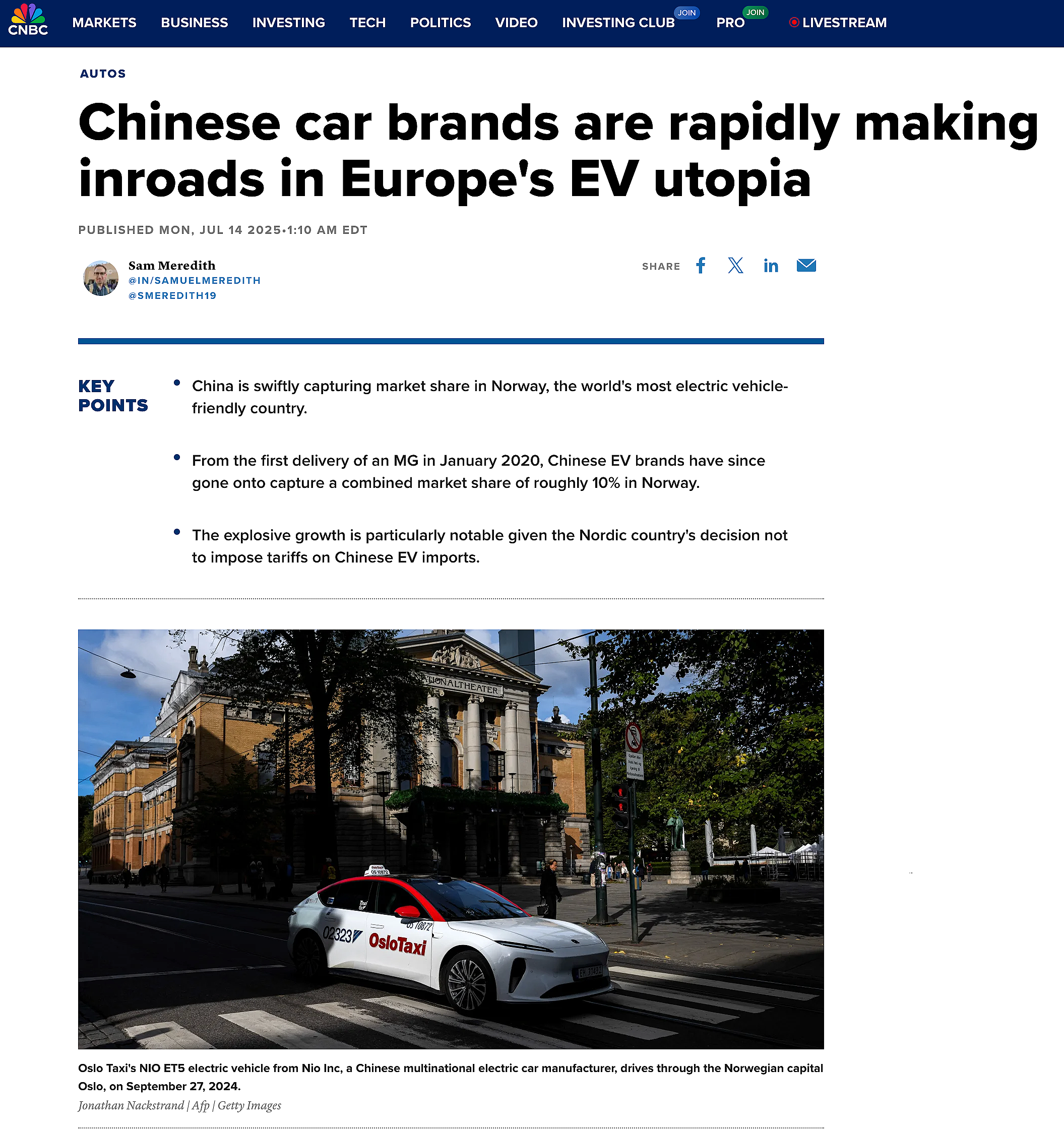 国际在线消息: 据美国消费者新闻与商业频道(CNBC)当地时间7月14日报道,中国电动汽车品牌正在挪威迅速崛起,成为特斯拉及其他西方车企的有力竞争者。  CNBC报道截图  报道称,在中国电动车的竞争性价格和先进技术推动下,中国电动汽车品牌已占据挪威新车市场约10%的份额。今年1月至6月,挪威是中国汽车品牌累计市场份额最高的欧洲国家。   根据挪威道路联合会(OFV)的数据,比亚迪、小鹏汽车等中国电动汽车制造商上个月跻身挪威新车市场销量前20名。   挪威电动汽车协会(NEVA)秘书长克里斯蒂娜·布表示,近年来,挪威潜在买家对中国电动汽车的看法“发生了很大变化”,“他们认为这些车是好车、技术精湛,价格也相当有竞争力。”   研究公司JATO Dynamics全球分析师费利佩·穆诺兹(Felipe Munoz)分析认为,由于其法规、文化和市场规模,挪威是欧洲电动汽车的“试验室”。这意味着,它在某种程度上是所有愿意在欧洲其他地区销售电动汽车的新品牌的“切入点”。   荷兰银行ING运输和物流高级行业经济学家里科·卢曼(Rico Luman) 则表示,调查显示,欧洲司机喜欢驾驶中国电动汽车。“因此,对于特斯拉来说,与那些正在欧洲建立影响力的新品牌竞争是一个真正的挑战。”   当被问及欧洲是否在与中国的电动汽车竞争中落败时,卢曼表示,“欧洲正在迎头赶上”,但他指出中国仍然遥遥领先。他补充道:“我们真的需要更多新车型和更实惠的车型来说服驾驶者作出改变。”(丁天怡)  |