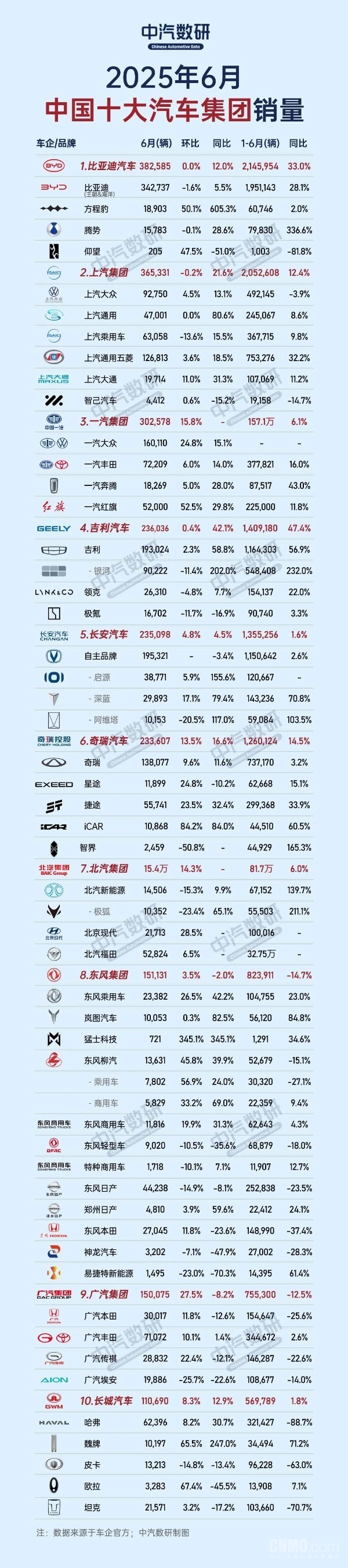 (转自:CNMO科技)   【CNMO科技消息】据CNMO了解,中汽数研于今日(7月14日)公布了中国十大汽车集团的销量排名(2025年6月及上半年)。其中,比亚迪汽车集团、上汽集团和一汽集团位居前三。 比亚迪汽车   从6月销量数据来看,比亚迪汽车集团以382585辆的销量位居第一,实现同比增长12%;上汽集团排名第二,销量为365331辆,同比增长21.6%;一汽集团排名第三,销量为302578辆;吉利汽车集团排名第四,销量为236036辆;长安汽车集团排名第五,销量为235098辆。此外,奇瑞汽车集团、北汽集团、东风集团、广汽集团、长城汽车集团分列第六至第十,销量分别为233607辆、154000辆、151131辆、150075辆和110690辆。   从上半年销量数据来看,比亚迪汽车集团以2145954辆的销量夺得第一,同比增长33%;上汽集团紧随其后,销量为2052608辆,同比增长12.4%;一汽集团排名第三,销量为1571000辆;吉利汽车集团位列第四,销量为1409180辆;长安汽车集团位居第五,销量为1355256辆。另外,奇瑞汽车集团、东风集团、北汽集团、广汽集团、长城汽车集团分列第六至第十,销量分别为1260124辆、823911辆、817000辆、755300辆和569789辆。   综合来看,比亚迪汽车集团无论是6月销量还是上半年销量,都位居第一,除了北汽集团和东风集团6月销量位居第七和第八,东风集团和北汽集团上半年销量位居第七和第八外,其它汽车集团销量排名保持不变。  |