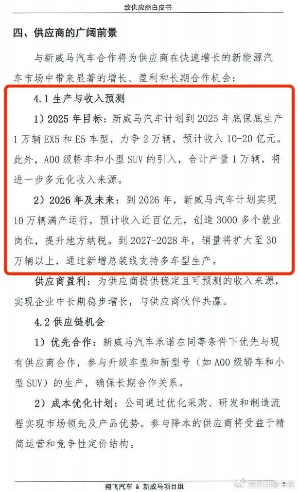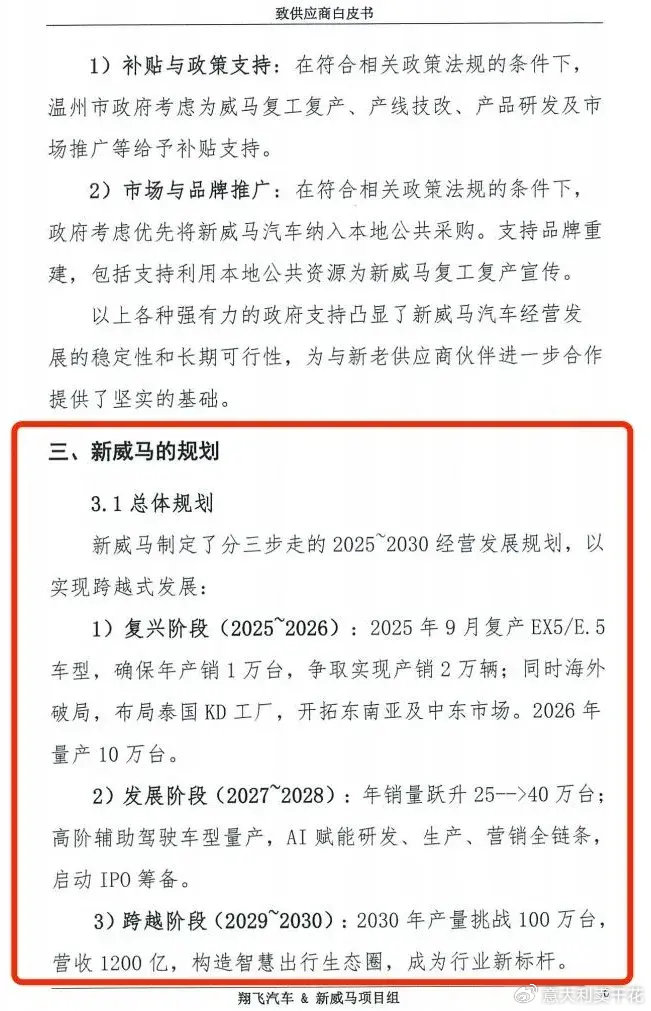 停摆近两年后,威马汽车正式宣布重启生产计划。 7月15日,威马汽车向供应商发布《致供应链合作伙伴白皮书》,明确将于2025年9月恢复EX5和E5两款车型的生产,目标年销量1-2万台。公司同时提出中长期规划:到2030年实现年产销百万辆、营收千亿元的目标。 威马汽车曾是中国造车新势力的头部企业之一,但自2023年起陷入经营危机,先后经历工厂停产、员工欠薪、经销商维权等风波。公开数据显示,威马负债总额超过200亿元,多地资产被冻结。此次复工复产被视为威马“背水一战”的关键举措。 据悉,威马此次复产将优先依托现有供应链体系,并尝试通过轻资产模式降低运营成本。公司表示,已与部分核心供应商达成新的合作协议,但具体融资进展及资金到位情况尚未披露。 根据规划,威马2025年复产后将聚焦EX5和E5两款成熟车型。EX5是威马2018年推出的首款量产SUV,累计销量一度突破10万辆;E5则为面向网约车市场的中端车型。分析人士指出,选择这两款产品或为利用现有生产线和供应链资源,快速实现现金流回笼。 然而,威马提出的2030年“百万产能、千亿营收”目标引发市场质疑。2023年中国新能源汽车销量排名中,威马已跌出前20,而头部车企如比亚迪、特斯拉年销量均未达百万辆。行业人士认为,威马需在技术、资金及品牌影响力上实现突破,才可能支撑这一愿景。 当前新能源汽车市场竞争日趋激烈,小米、华为等科技企业跨界入局,传统车企加速电动化转型。威马在停摆期间错失了智能化、快充等技术迭代窗口,品牌口碑亦受损。 威马在《白皮书》中强调将“重构供应链、优化渠道”,但未提及具体技术路线或新产品规划。部分供应商对财新表示,对威马的还款能力及订单持续性仍存顾虑,合作将“谨慎推进”。 截至发稿,威马尚未公布新一轮融资进展。公司能否凭借复工复产重回主流赛道,仍有待市场检验。  |