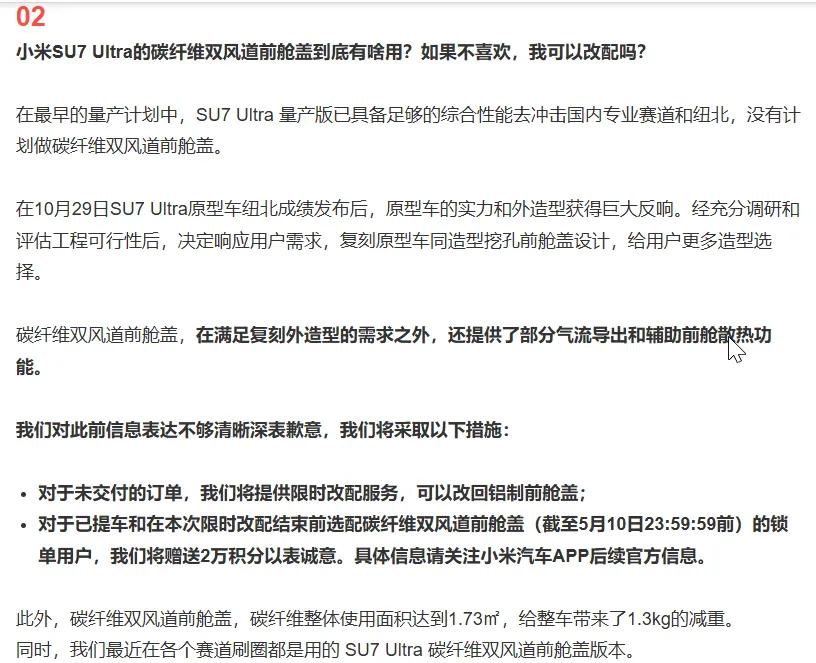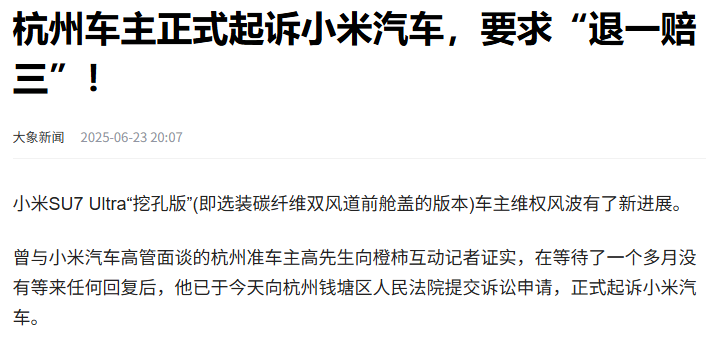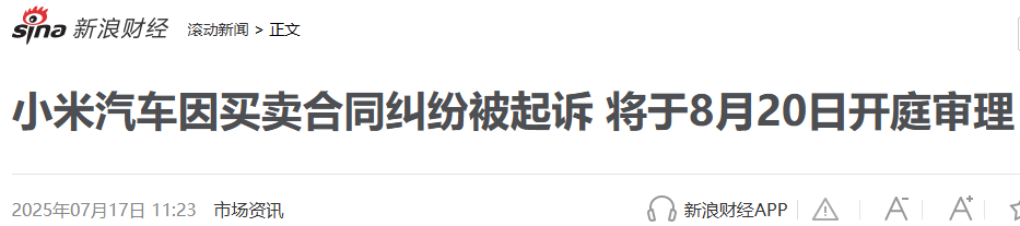 (来源:电动知家) 电动知家消息,7月17日,据新浪财经消息,小米汽车科技有限公司因买卖合同纠纷被起诉,案件将于8月20日在上海市松江区人民法院开庭审理。此次诉讼的原告为王某,被告包括小米汽车科技有限公司、小米景明科技有限公司、小米科技有限责任公司以及上海小米景明科技有限公司。 在今年6月,杭州有车主正式起诉小米汽车,要求退一赔三。车主高先生一方认为,小米汽车为提高销量,故意对碳纤维双风道前舱盖的实际情况和性能相关情况进行虚假宣传,诱使消费者购车,构成欺诈,因此根据《消费者权益保护法》和《民法典》,除要求解除合同并退还20000元定金外,还要求给予三倍定金(即60000元)赔偿。 今年5月,据多家媒体报道,小米汽车碳纤维双风道前舱盖因“虚假宣传”“与宣传功能不符”等问题引发车主不满,数百名小米SU7 Ultra车主,要求退车! 小米SU7 Ultra的碳纤维双风道前舱盖是其重要卖点之一。小米汽车在宣传中称,该前舱盖完全复刻了原型车的空气动力学设计,具有两个贯穿风道,能够实现前部空气的高效导流,还能辅助刹车系统散热并产生下压力。然而,车主提车后发现,实际的碳纤维双风道前舱盖功能与宣传不符,既无法有效引导空气至刹车系统,也未能产生下压力,仅是一个装饰件。 车主们认为小米汽车存在虚假宣传或表达失误,导致他们高价购买的产品并未达到预期效果。车主们联合组建了维权群,人数已超过300人。他们还发布了视频联合声明,晒出订单截图,明确要求小米退车。部分车主甚至委托律师进行维权。 5月7日晚,小米汽车公开致歉,并提出了补偿方案:对于未交付的订单,提供限时改配服务,车主可以选择改回铝制前舱盖。对于已提车和在限时改配结束前选配碳纤维双风道前舱盖的车主,赠送2万积分。然而,这一补偿方案并未获得车主们的认可。车主们认为,2万积分的价值与4.2万元的选装费用差距过大,且改配窗口时间有限,若不接受方案,2万元定金将被没收。  |