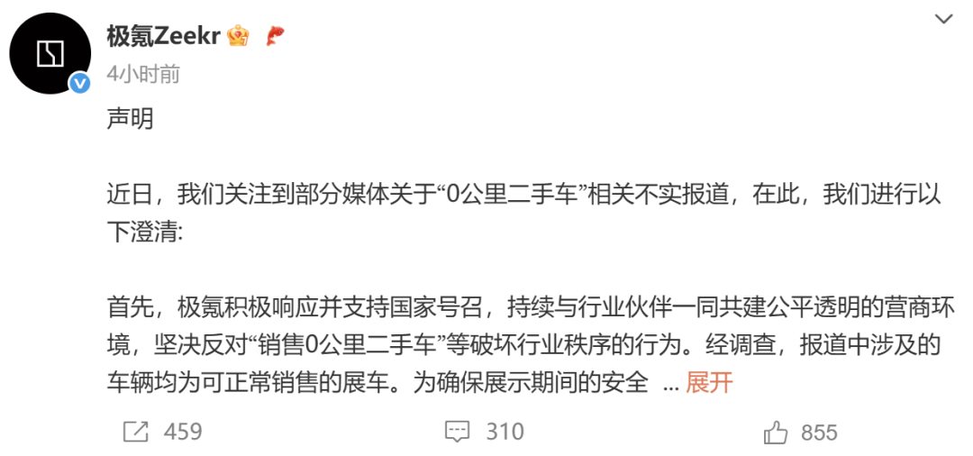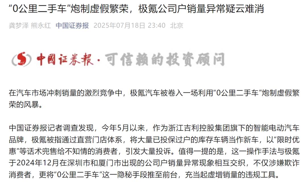 (来源:一览众车) 今日,极氪官方微博发文,针对近日网传关于“0公里二手车”相关不实报道进行回应。 官方表示,经调查网络上报道中涉及的车辆均为可正常销售的展车。为确保展示期间的安全,展车虽已投保交强险,但从未开具零售发票,也未在任何车管所进行新车注册登记或上牌,其法律属性始终属于未注册的全新商品车。 同时还指出展车一般存在3-5个月的库龄,因此会根据商品车的展示历史或库龄时间进行折扣明示销售。购买的消费者,同样享有新车首任车主的全部用车权益。这种新能源展车折扣销售模式,属于正常商业行为,与“二手车”交易存在本质区别。 据了解,7月18日《中国证券报》发表了一篇标题为《“0公里二手车”炮(配置|询价)制虚假繁荣,极氪公司户销量异常疑云难消》的文章,在网络引发广大网友的关注。 据了解,文中所说的“0公里二手车”,主要指的是已完成登记上牌但未实际使用的新车,行驶里程极低(接近0公里)的车辆。这些车辆主要通过二手车渠道以大幅低于新车的价格出售。有二手车商人士指出:“0公里二手车”实际就是新车,但按二手车的价格来卖。 出现这种“0公里二手车”,很多都是车企为完成销售任务提前上牌,或者是大客户采购后直接转手低价出售。还有的就是不少经销商为了缓解库存压力、回笼资金,也会将一些库存较长的新车注册为二手车,以 “0公里二手车” 的形式出售,这样操作可以解决库存问题,又能缓解资金压力。 此前,关于“0公里二手车”长城汽车董事长魏建军曾在接受媒体采访时指出,0公里二手车’是现在的一种行业怪象。 所谓“0公里二手车”,就是指上完牌照就算完成了注册,好像是卖出去了,但又回到二手车商手里,有非常多的二手车商都在卖。 对于网传“0公里二手车”一事 ,极氪表示将保障消费者知情权和选择权放在首位。并指出在消费者下定页面,已明显标注车辆性质,切实维护消费者合法权益。对于任何涉嫌侵害消费者权益、违背诚信经营的行为,极氪始终秉承零容忍态度。 对于报道中所提及的部分终端销售现象,极氪也已在第一时间成立了专项小组对相关问题进行彻查改进,并将持续提升消费者的购车体验。 与此同时,官方指出在销售一口价展车时,都会明确在购车App页面标注清楚车辆的具体情况,生产日期等信息,在用户下单前还会跳出二次提醒的页面,销售流程非常透明,确保消费者知情。 从官方APP购车页面看到,在下订的页面如果是展车的话,确实会有显示该车为一口价展车,此外还有关于车辆的具体生产时间。  (来源:汽车行业关注) |