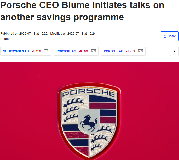 (来源:电动知家) 电动知家消息,继2月宣布裁撤1900个岗位、终止约2000名临时合同后,保时捷新一轮更大规模的裁员计划已箭在弦上。7月18日,据外媒报道,保时捷首席执行官奥利弗·布鲁姆(Oliver Blume)于2025年7月18日宣布启动另一项储蓄计划谈判。此次谈判旨在通过进一步削减成本,帮助保时捷应对在中国市场销量下滑以及美国关税争端带来的挑战。根据布鲁姆致公司领导层的信件,雇主和雇员代表将在2025年下半年就第二轮结构性成本削减方案进行谈判。这意味着保时捷将进一步削减成本并优化组织结构。他指出,保时捷长期以来依赖的商业模式已不再适用,需要进行调整。 发给公司领导层的信函摘录称:“2025年下半年,雇主和雇员代表将就第二套结构性方案进行谈判,以确保公司的长期业绩。”布鲁姆写道:“我们的商业模式几十年来一直运行良好,但目前的形式已不再有效。” 保时捷面临中国市场需求萎缩、美国高额关税以及电动化转型的综合压力。2025年上半年,保时捷全球销量为 14.64 万台,较 2024 年同期的 15.59 万台下降 6%。中国市场的下滑最为显著,销量由 2.96 万台降至 2.13 万台,同比下降 28%。保时捷预计2025年全年营业利润率将在6.5%至8.5%之间,远低于其长期战略目标的15%至17%。管保时捷仍在推进电动化,但电动平台的研发成本高、零部件本地化水平低、供应链不稳定等问题,使得整体制造成本居高不下。 布鲁姆在 3 月份介绍该汽车制造商 2024 年业绩时已经宣布了进一步的节约措施。保时捷在 2022 年股票市场首次亮相时估值高于母公司大众汽车集团,但此后其股价一路下滑,尤其受到中国市场销量低迷的影响。保时捷在美国也面临困境。自4月起,美国对汽车征收27.5%的进口关税。保时捷在美国没有生产工厂,其汽车全部从欧洲进口。今年年初,保时捷宣布,由于 2,000 名临时员工未能续签合同,到 2029 年,公司将裁减约 40,000 个工作岗位中的 1,900 个。  |