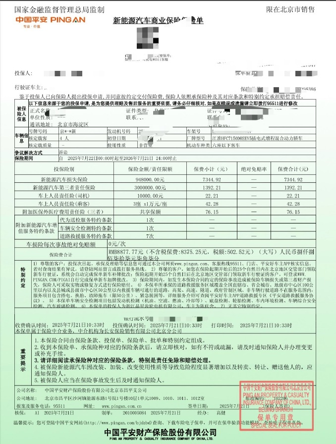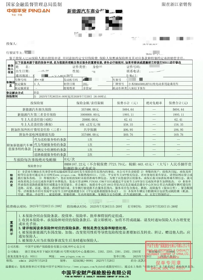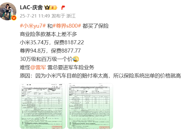 (来源:电动知家) 电动知家消息,7月21日,一位同时购买了小米YU7和尊界S800的博主在社交媒体上晒出了这两款车型的保险费用。令人震惊的是,30万级的小米YU7和百万级的尊界S800保险费居然差不多。 保险单显示,小米YU7售价35.74万元,保险费用为8187.22元。尊界S800售价94.8万元,保险费用为8877.77元。两车保险费用仅相差690.55元,这一差距远低于市场预期。据博主介绍,博主选择的保险方案均来自中国平安,保险条款基本一致,包括300万的第三者责任险。博主表示,小米YU7的保费较高,主要是因为其赔付率较高,导致保险系统出单价格上升。此外,尊界 S800 的保费在百万级车型中属于较低水平,正常情况下,百万级车型的保费通常在 2 万元左右。 小米YU7是小米汽车旗下首款SUV车型,于今年6月26日正式上市,共推出标准、Pro、Max三款车型,售价分别为25.35万元、27.99万元、32.99万元。作为小米汽车第二款车,小米YU7发布后,3分钟大定20万辆,18小时锁单24.8万辆,市场反响热烈。 尊界S800是华为与江淮合作推出的尊界品牌(MAEXTRO)首款车型,定位百万级的超豪华车。自5月30日尊界S800上市以来,1小时订单破千,首月大定6500台,上市50天大定累计突破8000台。尊界S800先行者计划已于6月26日交付,其它版本车型8月中旬开始交付。  |