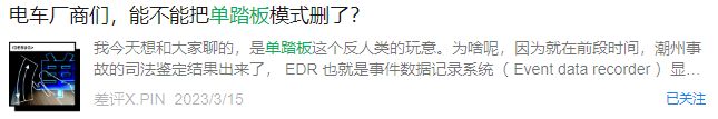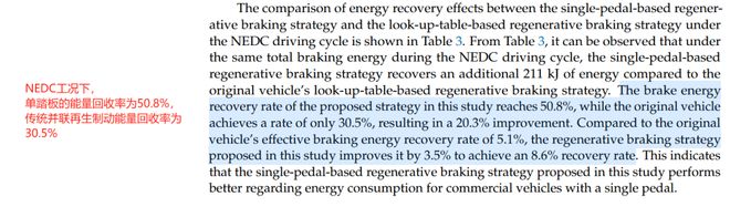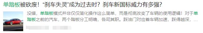 (来源:网易科技) 普大喜奔,脖子哥从 23 年写到现在,新能源车单踏板模式的国标终于出来了。 前不久,工信部发布了强制性国标《乘用车制动系统技术要求及试验方法》(GB 21670—2025)。 本次新国标新增、修改了不少牵涉到生命安全的项目,比如线控刹车的标准、多大的动能回收力度需要亮刹车灯、强制所有车辆安装 ABS。。。。。。 还有最重要的,对电力再生制动,也就是动能回收的一系列细则。 重要的有两条,脖子哥给大家中译中一下: 1. 动能回收如果有多种模式,每次上车都得重置成默认的模式(对绝大部分车型来说,系统默认是普通那档)或车主提前选定的模式。其中,默认模式的减速力度不能超过 3m/s²(相当于油车点刹,不会有很强的拖拽感)。 2.在默认模式的基础上,松开加速踏板不能使车辆减速到停车,也就是必须得踩刹车才能完全把车停下。(和第一条结合来看,也就是不能默认单踏板模式)。 其实吧,正式的国标和去年的意见征求稿没啥区别,以后喜欢单踏板的车主每次上车得像关自动启停一样打开单踏板模式,无所谓的朋友就拿默认模式来开,甚至把它设置成默认关闭。 总而言之,选择权还是在用户手上。 然后,开始了。。 不少 “单踏板模式要完了” 的言论冒了出来,香槟都喷到天上了。 有一说一,咱们还是得正视单踏板模式的作用,不能一棒子打死。 首先,先给完全不了单踏板模式的朋友解释一下,单踏板模式并不是只有一个踏板,它仍然保留了刹车踏板。 单踏板模式本身是动能回收的延伸,在踩油门加速、松油门减速之上,提供更大的减速力度,直到刹停。 仅靠一个踏板就可以控制车辆的启停,故称 “单踏板”。 特斯拉 Model 3 的踏板  这样的设计,也确实有不少人觉得挺香。比如咱们上下班堵麻了的路况,前车走走停停,油门刹车换着踩,脚踝都酸了。而用单踏板,只需要放在油门上就能跟上前车。 更别说,单踏板比起普通的动能回收还能更省电。 根据河南科技大学李哲等人的研究,在 NEDC 工况下,单踏板模式的回收效率提升了 20% 多。 而且,单踏板模式用多了,基本都靠动能回收来刹车,用不上机械刹车,刹车盘和刹车片的寿命也都更长了。 这不就有一个澳大利亚车主 Nigel Raynard,他的 Model S 就开了 40 万公里还没换刹车片。。 好处多多是吧?但自从单踏板模式诞生,这玩意就一直处于争论之中。 最早有单踏板概念的是宝马 i3 那个小车,当时那玩意儿没法取消动能回收,见到宝马都这么干了,后来同期的日产聆风、雪佛兰 Bolt 也陆续搭载类似的功能。 而真正将它 “发扬光大” 的,就是特斯拉。 特斯拉最初进入中国的时候,新能源领导者的光环无比耀眼。它的支持者们,将它的一切都奉为圭臬,其中也包括了隐藏式门把手、单踏板模式等一系列新兴配置。 而随着特斯拉的热卖,特斯拉愈发将它的思想钢印植入到它的所有用户脑中。 2021 年,特斯拉在中国的 Model 3 和 Model Y 取消了动能回收力度调节选项,强制所有车主使用 “单踏板模式”。 但后续多起特斯拉的事故,将单踏板模式推上了风口浪尖。 最出名的有车展维权张女士、刹车灯点亮但最后全速前进的潮州特斯拉事件,还有依靠擦碰墙面才能停下来的南京经先生。。。类似的案例数不胜数。 脖子哥并不想深究特斯拉到底是不是刹车结构上的失灵,但是单踏板模式从理论上来说,更容易让车主在紧急情况下踩错踏板。 2021 年,美国国家公路交通安全管理局公布了对特斯拉刹车 “意外加速” 的报告,在调查的 246 起事故中,全都是踩错踏板导致的事故。 如果大伙考了驾照,应该都被教练 “骂” 过,脚只有两个地方能放,不是油门就是踏板。而单踏板模式,毫无疑问改变了人们的传统驾驶习惯。 在事态紧急、仅剩肌肉记忆的时候,习惯了特斯拉等拥有单踏板模式的车主,后果可想而知。 即使你没有踩错,单踏板或者说动能回收提供的刹车力度,仍远远比不上正常的刹车踏板。 咱们正常刹车测试的时候,用吃奶的力气踩刹车,大概能有 0.8-1.2g 的刹车力度。 而像现代 IQNIQ 5N 和小米 SU7 Ultra 他们的动能回收最大能够提供 0.6g 的刹车力度。 看上去起码能有个 6 成效果,好像还不错是吧? 但现代 5N 和 小米 SU7 U 都是接近赛道化的车型,普通车型根本没这个力度。懂车帝曾经做过测试,市面上的主流车型,基本只有 0.2-0.25g,完全达不到紧急制动的效果。 让车主习惯单踏板,依赖动能回收来减速,这是单踏板模式避无可避的原罪。 所以,后来 23 年特斯拉召回了 110 万辆车,并在后续车辆上都加回了调节动能回收力度的选项,并新增了长时间踩加速踏板的提醒。 但这毕竟只是特斯拉一家车企,行业仍需要一个普适标准。于是,经过多年的讨论,国家终于在今年把强制性国标端了出来,画了条底线,提高了新手车主的容错。 当然,国标这么定也意味着喜欢单踏板模式的人群该用还是会用。 不过,我觉得国标还是保守了。 毕竟,如果是为了省电,压根没必要改变大伙的驾驶习惯,国标可以要求把刹车的前段设计成动能回收就好了。 像现在不少车企都用的博世 iBooster 2.0、大陆集团的 MKC1 等刹车系统,就都具备了 CRBS (连续再生制动系统)。 在大伙踩刹车的时候, CRBS 能根据刹车的力度,智能分配动能回收与机械刹车。 咱们在一些车型上也能看见,轻踩刹车时,仪表盘会显示正在使用动能回收。需要更大力度的刹车时,则调用机械