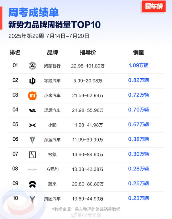 (来源:CNMO科技)   【CNMO科技消息】7月22日,CNMO注意到,有机构整理了2025年第29周(7月14日至7月20日)的中国造车新势力品牌销量数据,以下是最新的销量排名:   第一名,鸿蒙智行,指导价格22.98万-101.80万,销量1.09万   第二名,零跑汽车,指导价格5.99万-20.98万,销量0.82万辆   第三名,小米汽车,指导价格21.59万-62.99万,销量0.72万辆   第四名,理想汽车,指导价格24.98万-55.98万,销量0.70万辆   第五名,小鹏汽车,指导价格11.98万-41.98万,销量0.67万辆   第六名,深蓝汽车,指导价格11.99万-30.99万,销量0.38万辆   第七名,极氪汽车,指导价格14.90万-89.90万,销量0.30万辆   第八名,方程豹,指导价格13.38万-42.38万,销量0.28万辆   第九名,蔚来汽车,指导价格29.80万-80.80万,销量0.25万辆   第十名,岚图汽车,指导价格19.69万-44.99万,销量0.23万辆 销量排名   和2025年第28周相比,小米汽车的销量上涨十分明显,直接拿下了新势力第三的位置。  |