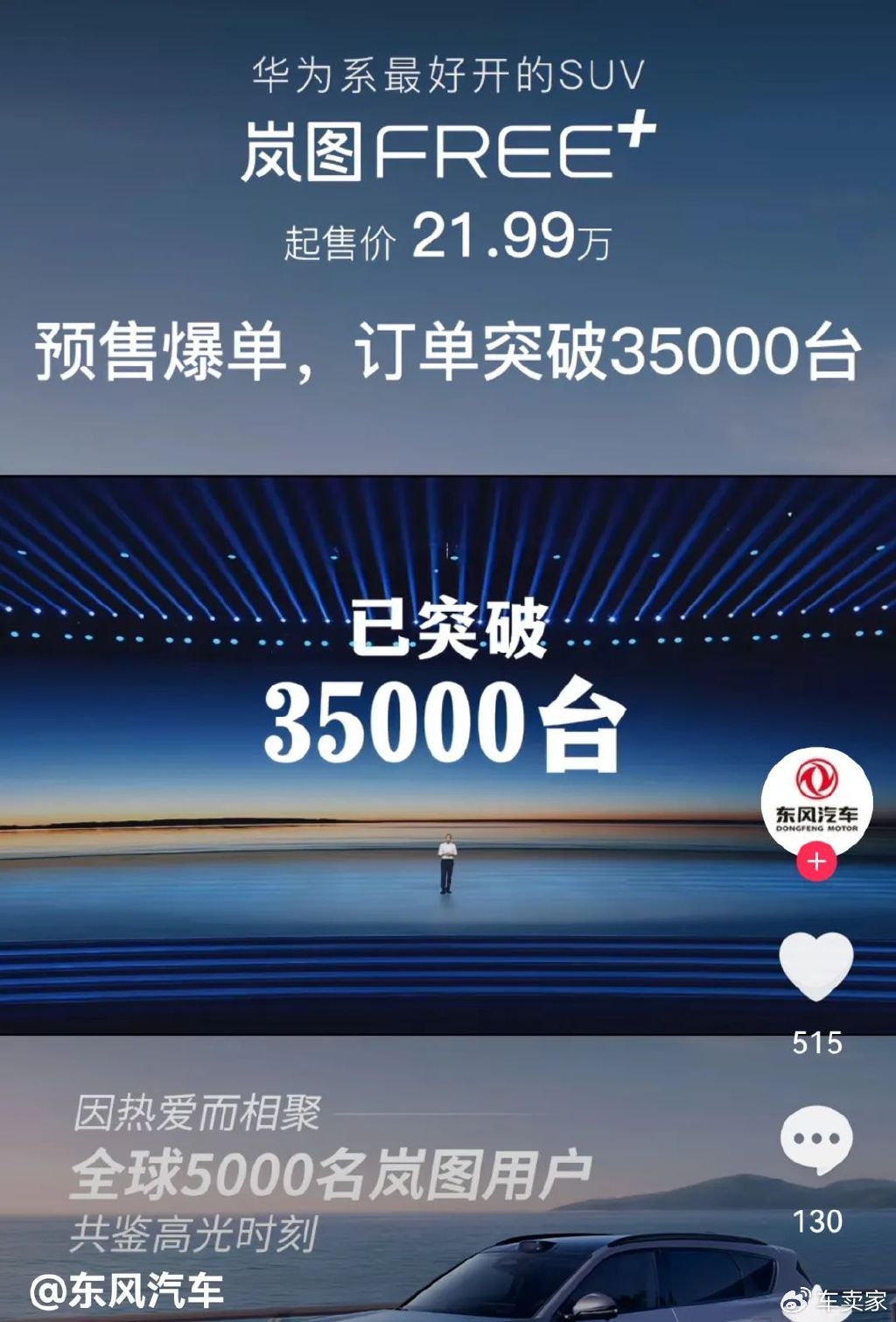 东风岚图宣称旗下岚图free(配置|询价)+预售订单超过了35000辆,这个幸亏只是一个预售订单数据,但是现款岚图free一个月销量是多少呢!