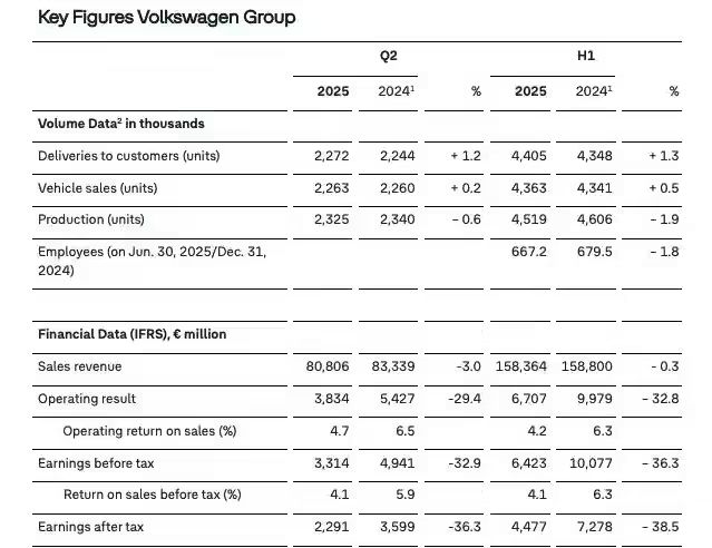 (来源:电动知家) 电动知家消息,7月25日,大众汽车集团发布2025年上半年财报,数据显示,其营业利润仅为67亿欧元,同比大幅下滑33%。尽管同期汽车交付量达到440.5万辆,同比增长1.3%,但营收仅1584亿欧元,同比下降0.3%。 大众自己把利润下滑归因于三个主要因素:美国关税、重组成本增加(尤其是奥迪、大众乘用车和软件部门Cariad的重组花了7亿欧元),以及低利润率电动车型销量增加。2025年上半年,关税给公司带来了13亿欧元的损失。自4月起,美国对全球汽车进口征收25%的关税,尽管英国和日本随后与美国达成协议,将汽车关税分别降至10%和15%,但大众所在的欧盟尚未达成类似协议。此外,奥迪、大众乘用车和软件部门Cariad的重组费用高达7亿欧元,进一步削弱了集团的盈利能力。大众汽车集团的电动化转型也面临挑战。尽管电动车订单增长62%,但低利润率电动车型销量增加,叠加价格竞争与汇率波动,形成了“负面组合效应”,影响了整体盈利能力。此外,集团对Rivian的9亿欧元投资也加剧了资金压力。 从区域市场来看,大众汽车集团的市场表现呈现分化态势。南美市场增长19%,西欧和中东欧分别增长2%和5%,但中国市场下滑3%,北美市场因关税影响暴跌16%。尽管西欧地区订单总量增长19%,但整体市场环境仍充满不确定性。鉴于上半年的业绩表现,大众汽车集团下调了2025年全年业绩预期。预计全年营收将与上一年度持平,此前预计增幅最高可达5%;销售回报率预计在4%至5%之间,低于此前预测的5.5%至6.5%;汽车业务净现金流预计为10亿至30亿欧元,低于此前预期的20亿至50亿欧元。 |