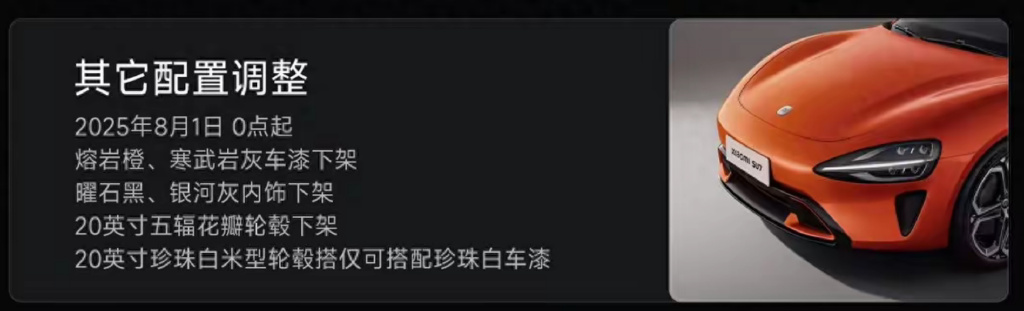 7月25日,小米汽车在最新发布的答网友问中正式回应近期产品配置调整决定:自8月1日零时起,小米SU7和小米SU7 Ultra将下架熔岩橙、寒武岩灰两款车漆颜色,曜石黑与银河灰内饰,以及20英寸五辐花瓣轮毂等配置选项。这一调整迅速引发市场关注。 对此,小米汽车回应称:“为了进一步优化生产流程,提升交付效率,我们调整了小米SU7和小米SU7 Ultra的部分配置。此次调整可能会给部分用户带来不便,对此我们深表歉意。”公司同时承诺将持续挖掘产能潜力,缩短消费者提车等待时间。 小米SU7据了解,此次调整涉及小米旗下两款重磅电动车型的具体选配内容。根据官方公告,被精简的配置包括: 熔岩橙与寒武岩灰两款特色车漆,这两种颜色因独特视觉效果在年轻消费群体中颇受欢迎。曜石黑与银河灰内饰选项,这两种内饰配色方案原为高端车型的个性化选择。 20英寸五辐花瓣轮毂,该设计以运动感和辨识度高受到消费者青睐16。同时,小米还对珍珠白米型轮毂的搭配规则作出限制——今后仅能与珍珠白车漆配套使用。 小米部分车型配置调整 配置调整的生效时间点设定在8月1日零时,恰逢小米YU7首销权益截止日(7月31日)前夕,这一时间安排引发了市场对小米汽车营销策略的诸多解读。 对此,小米汽车在答网友问(第184集)中给出了明确解释。官方表示,此次调整核心目的在于优化生产流程,加速车辆交付。 “后续我们将不断挖掘产能潜力,争取让大家早日提车。”小米汽车在公告中承诺。对于已购车主的担忧,小米特别强调:“所有已交付和已选配下定的车辆,我们都会确保其售后维修备件的供应,不会受到影响。”这一售后保障承诺,旨在消除现有车主对维修保养的顾虑。 小米官方回应 显然,对于本次涉及到的部分车型配置调整,小米官方进行了比较清晰的解释。应该说,主要出于“优化生产流程以及提升交付效率的目的”。 同时的,对于本次调整可能对于部分用户造成的不便等,小米汽车官方表示了歉意:“对此,我们深表歉意”。 尤为值得注意的是,对于部分用户的担心的“售后维修”等问题,小米汽车官方也做出了承诺。应该说,这消除了部分用户的疑虑。  小米SU7车宇世界认为,小米汽车这次配置调整,对于提升交付量,应该能够发挥较大的助益作用。 毕竟,这一策略调整背后是小米汽车令人瞩目的销售成绩。公开数据显示,小米汽车上市仅9个月,交付量已突破13.5万辆,锁单量更是达到24.8万辆,远超最初市场预期。 事实上,与传统车企相比,科技企业背景的新造车势力在产品策略上更为灵活。特斯拉等企业也曾通过精简配置组合实现产能突破。  小米汽车从这个层面来讲,小米此次调整,是否是对行业经验的借鉴,也是对自身产能问题的积极应对,值得思考。 随着销量规模的提升,产能爬坡的压力与用户个性化需求之间的平衡,或许是大多新造车企业必须面对的挑战。 可以说,小米汽车此次配置精简,是根据自身经营状况以及策略做出的合适的调整,倒也无可厚非。  小米汽车在此,我们希望,小米汽车不断为用户提供更好的产品和体验,从而获得更好的市场发展前景和销量。 最后,本文涉及到的小米汽车部分车型配置调整的信息,来源于小米汽车官方,目前官方已经对相关信息进行了回应,具体以官方信息为准。 本文声明: 本文为车宇世界原创文章,总第11843期,部分图片来源于网络,标注来源的数据及相关资料均为引用。车宇世界原创版权所有,侵权必究。 |