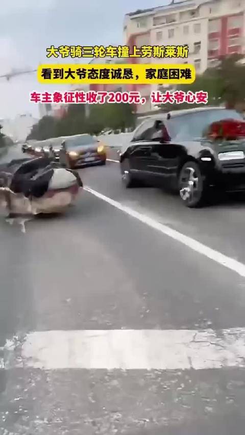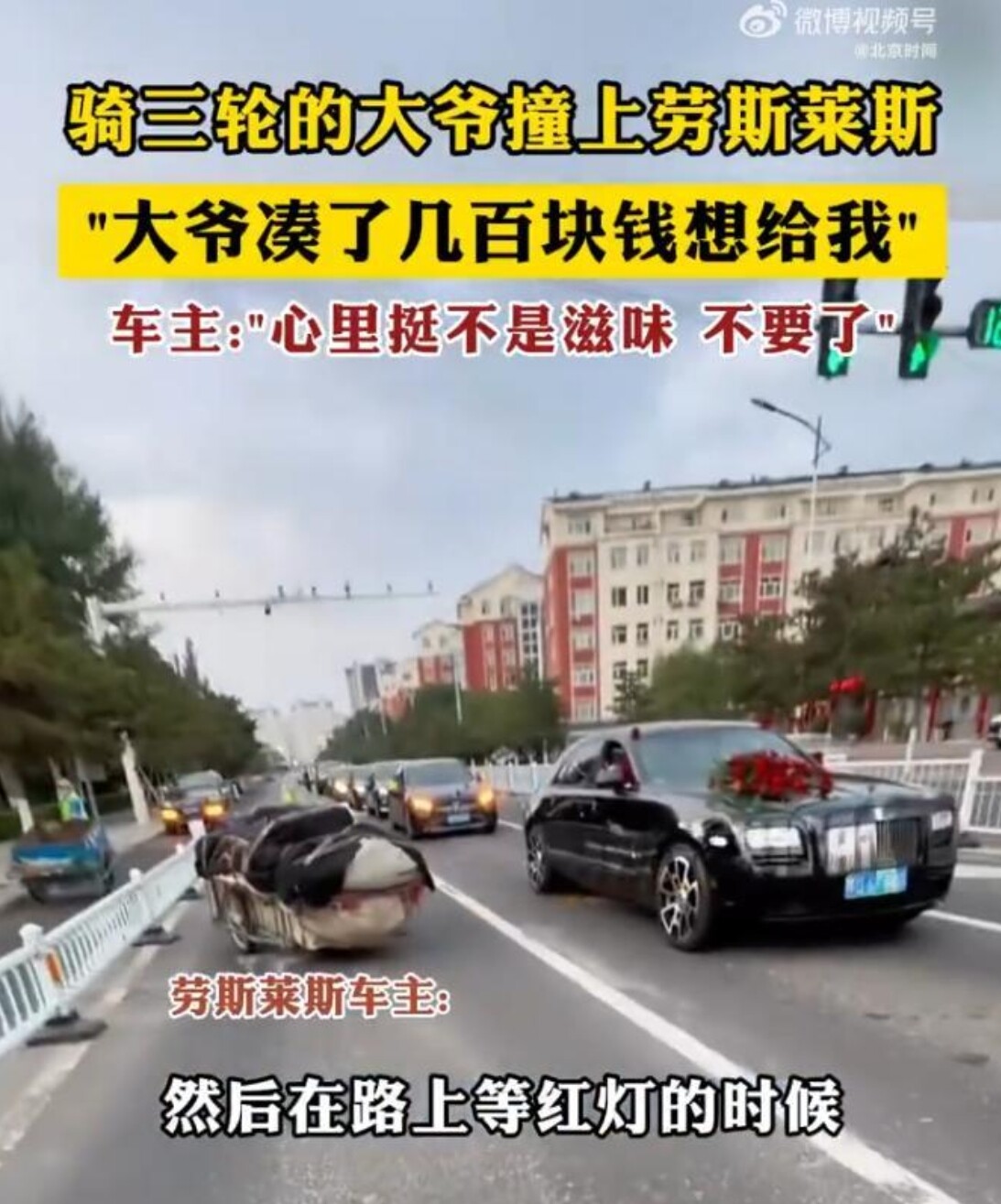 近日,内蒙古赤峰,一名骑三轮的大爷撞上一辆劳斯莱斯的视频引起热议,车主让大爷走,但大爷坚持要赔偿。