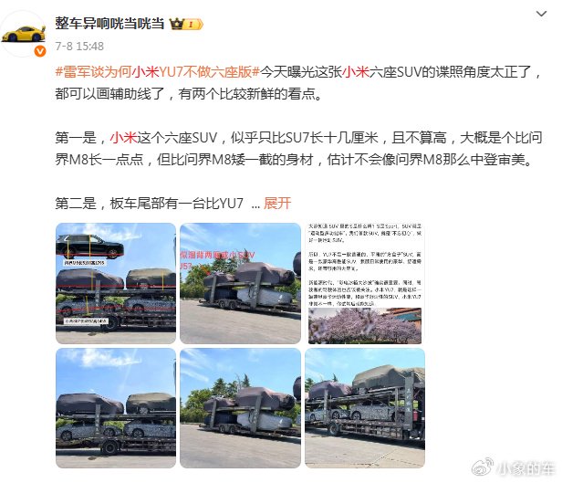 过去总是成为流量焦点的雷军,已经很长时间没有出现在新闻中了。当流量之王突然噤声,要么是风暴前的死寂,要么是核弹上膛的倒计时。 遁入暗影的雷军并非沉寂,其实是在闷声憋大招,小米又要打出两张王牌。 1. 雷军闷声干大事作为最擅长营销的商业大佬,雷军堪称行走的“流量圣体”。在有意或无意的推波助澜下,雷军的一举一动,总能引发滔天的流量海啸。小米造手机是这样,造汽车同样如此。小米首款车型SU7上市,全行业瞩目,刷新了新势力订单纪录。第二款车YU7上市,订单量是YU7的好几倍,消费者提车等待时间,长达一年左右。就连“平平无奇”的“车规级纸巾盒”,一经雷军说出,都能引发网络狂潮。 然而最近一个多月,雷军这个“流量永动机”仿佛终于沉寂。好像随着小米YU7的平稳上市,小米汽车逐步进入了平淡期。而且YU7供不应求,订单量足够一整年产能了。基于此,可能雷军想要降一降热度,毕竟流量是把双刃剑。之前因为SU7高速车祸、SU7 Ultra退车,以及车规级纸巾盒等事件,导致小米汽车出现大范围的负面舆论,需要压一压热度。当然,雷军这段时间并非躺平了闲着,而是在闷声干大事。 2. 小米又出两张牌 今近日,某知名汽车博主放出猛料,曝光了小米汽车两款全新车型的谍照。其中第一款车,从谍照上来看,其尺寸明显小于SU7,车身线条更加紧凑小巧一些。种种迹象表明,这大概率就是小米的一款“两厢车或溜背SUV”。当然也有可能是全新车型,但应该不是现有车系的改款。两厢车可能就是一个类似飞度的A0级轿车;溜背SUV的话,大概率还是兼顾运动与实用。这款车纯电的概率比较大,应该不是增程式的。 无论如何,这款车比现有的SU7和YU7都要小,有可能就是定位更低的、价格也更便宜的入门级新车,或者价格会在15万-20万元之间。作为商界最好的产品经理和营销大师,雷军造车之路可谓一帆风顺。小米前两款车SU7和YU7均一炮而红,订单接到手软。不过这两款车集中在二三十万的价格区间,小米汽车想要走量,就不能错过市场更大的主流大众市场。这款价格更低的新的小型车,将要担负起小米汽车走量的任务。 3. 雷军要硬刚李想 当然,更具看头的还是另一款新车。据悉,这款新车应该就是小米传说中的首款增程SUV。谍照图上,网友细心地标注了新车与SU7和问界M8的尺寸对比图。其车身比问界M8略长,不过高度要低一些,走的是低趴运动风,与YU7同出一辙。三排座椅清晰可见,大概率是目前车市流行的六座布局,显然瞄准的是家庭用户。车顶疑似有凸起,应该是配置的激光雷达等辅助驾驶硬件。 综合以前的爆料信息,小米这款增程SUV,内部代号“昆仑”,名字可能是小米YU9。显然,小米YU9的枪口,对准的是理想和问界。问界依靠华为的背书,问界M7/M8/M9都很狠角色。至于理想就更猛了,业内首个扛起增程大旗,吃尽了增程和奶爸家庭用车的红利。不过SU7和YU7的订单量让人震惊,刷新了行业认知。小米增程SUV一旦上市,凭借小米一贯的超高性价比,以及产品力和品牌力,应该也是会让李想头疼的。 SU7和YU7的爆火,已经证明了小米汽车的能量,它不仅仅是个搅局者那么简单,而且还要后来居上,力压其他车企。随着小米打出两张新王牌,其两款新车预计也将掀起车市新的订单狂潮。届时,小米就会更上一层楼。雷军宣布造车后,小米股价暴涨,市值已经翻了好几倍,目前超1.2万亿人民币,为中国最高市值车企,全球排第三,仅次于特斯拉和丰田。小米汽车的崛起,不仅是一家企业的逆袭,更是中国智造在全球车海中劈波斩浪的身影。 |