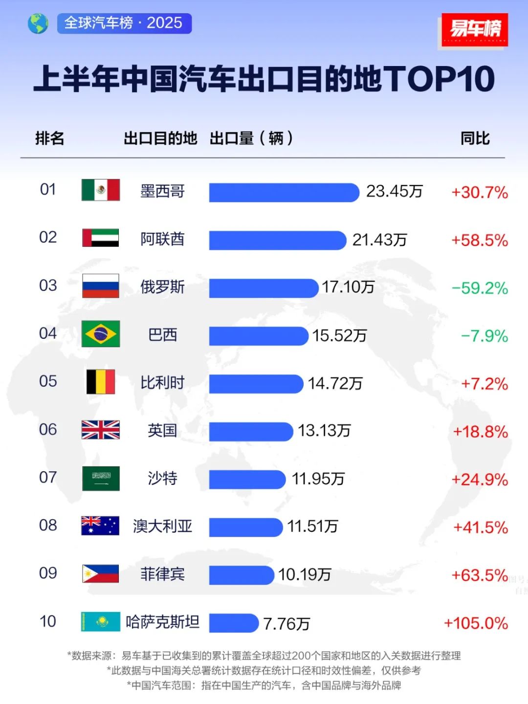 (来源:汽车之地) 据中国汽车工业协会统计数据显示,今年上半年全国汽车销量为1565.3万辆,同比增长11.4%。其中新能源汽车销售693.7万辆,同比增加40.3%,新能源汽车新车销量占汽车新车总销量的44.3%。与此同时,中国车企加速扬帆出海,以技术创新和本地化战略为世界汽车产业格局注入新动能。上半年,中国汽车出口308.3万辆,同比增长10.4%,其中新能源汽车出口增长迅速,达106万辆,同比增长75.2%。 根据易车统计的数据显示,2025年上半年中国汽车出口目的地前三名分别为墨西哥、阿联酋、俄罗斯,出口量分别为23.45万辆、21.43万辆、17.10万辆,墨西哥同比增长30.7%,阿联酋同比增长58.5%,而俄罗斯暴跌59.2%。 墨西哥成为中国汽车出口国第一,主要是因为比亚迪在墨西哥需求量大幅增加,主力车型海鸥、宋PLUS DM-i等都已在墨西哥上市,而阿联酋销量增速迅猛的原因,主要是阿联酋作为中东汽车进口的集散地,今年以来吉利对沙特、阿联酋等中东市场的出口增长,带动整体进口量攀升。至于俄罗斯,是榜单跌幅最大的国家,跌幅为59.2%。有分析师表示,一是因为俄罗斯今年提高车贷利率和整车进口报废税,导致当地消费者购车成本提升,终端销量下滑;二是此前中国车企在俄库存较高,今年的销售遇到瓶颈。 其它国家方面,榜单第四至第十名分别为巴西、比利时、英国、沙特、澳大利亚、菲律宾、哈萨克斯坦等,其中巴西同比下滑7.9%,哈萨克斯坦则是榜单增幅最大的国家,同比增长105.0%。 再来看看车企方面,奇瑞汽车以54.49万辆的销量成绩稳居第一,但是同比增长3.5%。出口一直是奇瑞的优势,作为中国汽车出口的 “老将”,奇瑞多年来深耕海外市场,建立了完善的销售网络和生产基地。尤其是在俄罗斯、中东、拉美等地区,奇瑞汽车深受当地消费者的喜爱。此外,面对全球贸易环境的不确定性,奇瑞加速推进海外本土化生产,有效规避了关税壁垒。 比亚迪紧跟其后,上半年累计出口44.31万辆,同比增长118.2%,是前十车企涨幅最大的中国厂商。凭借在电池、电机和电控等核心技术上的优势,比亚迪推出一系列深受海外消费者青睐的车型。此外,比亚迪积极推进本地化生产和自主船运,有效应对了欧美等地区的高关税壁垒,进一步提升了其在海外市场的竞争力。 上汽乘用车以24.26万辆位居第三,同比下滑4.1%,出口量下滑或许与部分市场竞争加剧、供应链不稳定等因素有关。上汽乘用车出口的主要品牌是名爵,尽管出口量出现下滑,但名爵品牌在欧洲、东南亚、印度等地区都有不错的市场表现。上汽深化改革成效显著,自主品牌与新能源车成为增长主要驱动力。不过,上汽一直致力于技术创新和产品升级,未来有望在海外市场重新找回增长动力。 吉利在上半年出口量为18.20万辆,同比增长7.4%。通过一系列的海外并购和战略合作,快速提升品牌的国际影响力,旗下沃尔沃、领克等品牌在欧洲市场表现出色,尤其是领克品牌,以其独特的设计、先进的技术和高端的定位,成功吸引欧洲年轻消费者的关注。此外,吉利还在东南亚、中东等地区积极布局,不断拓展海外市场版图。通过本地化生产和营销,吉利汽车更好地满足了当地消费者的需求,推动出口业务的增长。 此外,长城汽车出口16.76万辆,同比下滑5.5%。长安汽车出口14.69万辆,同比下滑3.9%。上汽通用五菱出口11.19万辆,同比增长20.0%。 特斯拉中国出口10.11万辆,同比下滑31.9%。特斯拉虽然是全球知名的新能源汽车品牌,但出口表现却出现严重下滑,这可能与中国新能源汽车市场竞争加剧以及部分海外市场政策变化等因素有关,以及马斯克的一系列政治行为有关。 在榜单中,江苏悦达起亚出口8.58万辆,同比增长20.6%。作为合资品牌,虽然悦达起亚在国内市场的表现一般,但通过国产出口也成为其新的业绩增长点。近年来,随着中国自主品牌汽车的崛起以及全球新能源汽车市场的快速发展,合资品牌在海外市场面临着越来越大的挑战。江苏悦达起亚需要加快产品更新换代,提升技术水平,以适应市场变化,重振出口业务。此外,北京现代也开始出口,上半年出口3.48万辆,同比增长248.4%,成为榜单涨幅最大的车企。 从排名不难看出,中国自主品牌的出口已经越来越具备优势,前十排名中除了特斯拉和悦达起亚,其它均为自主品牌,其中奇瑞汽车、比亚迪遥遥领先,特别是比亚迪,同比增长118.2%,成为出口海外最具增长潜力的中国厂商,这与比亚迪疯狂布局海外市场有关,而包括悦达起亚、北京现代等合资品牌,大多数都是在国内市场出现销售压力,开始将产品出口至海外市场销售。 国际汽车市场竞争异常激烈,众多国际知名车企早已在全球市场布局多年,拥有深厚的品牌底蕴、先进的技术和完善的销售服务网络。中国汽车企业要想在这样的市场环境中脱颖而出,面临着巨大的挑战。与国际车企相比,中国汽车在品牌知名度、技术水平、产品质量等方面曾经存在较大差距,但近年来通过不断加大研发投入、提升技术创新能力、优化产品品质,中国汽车的竞争力得到了显著提升。如今,中国新能源汽车在电池技术、智能驾驶等领域已经走在了世界前列,能够与国际车企一较高下。 |